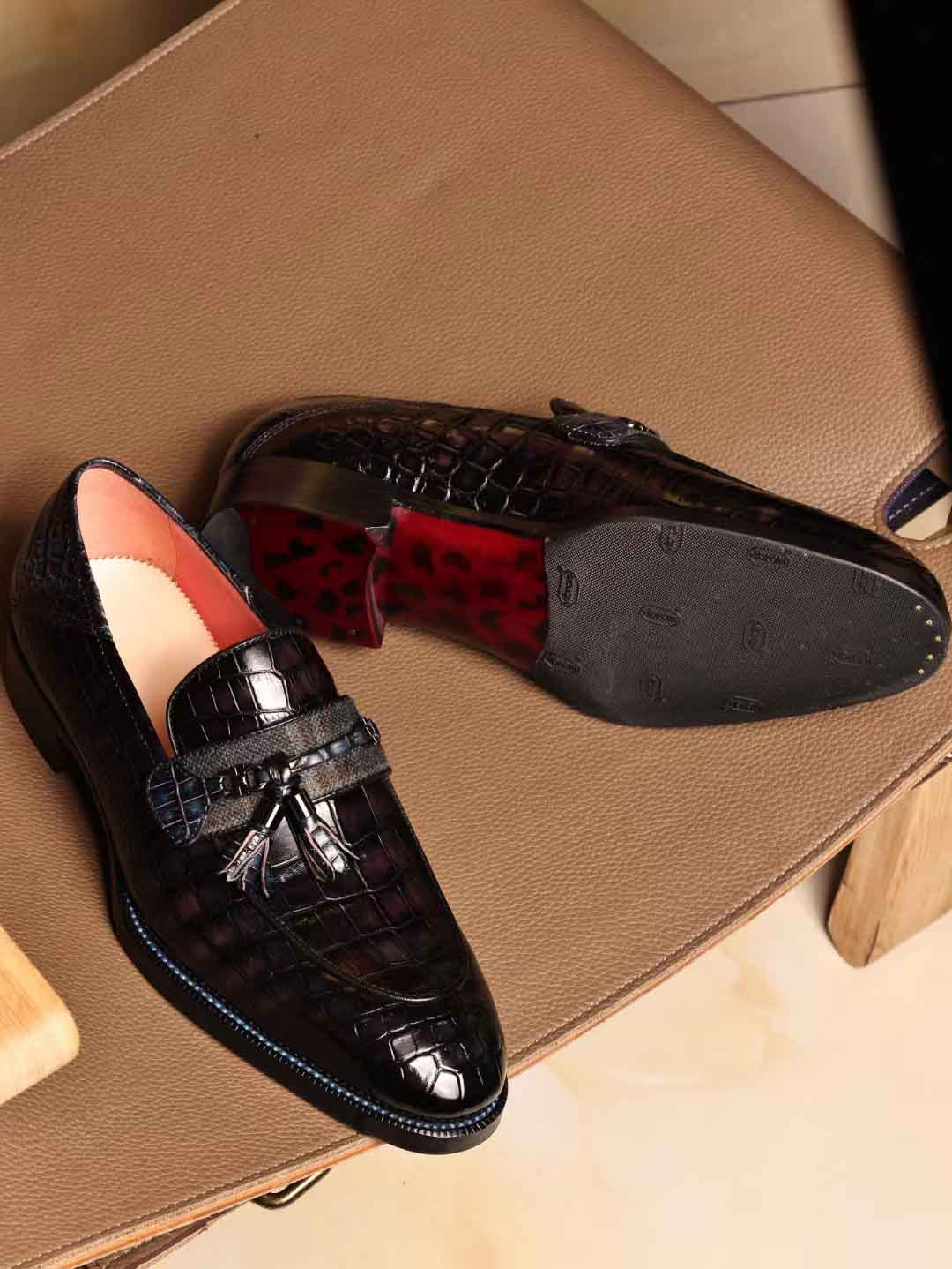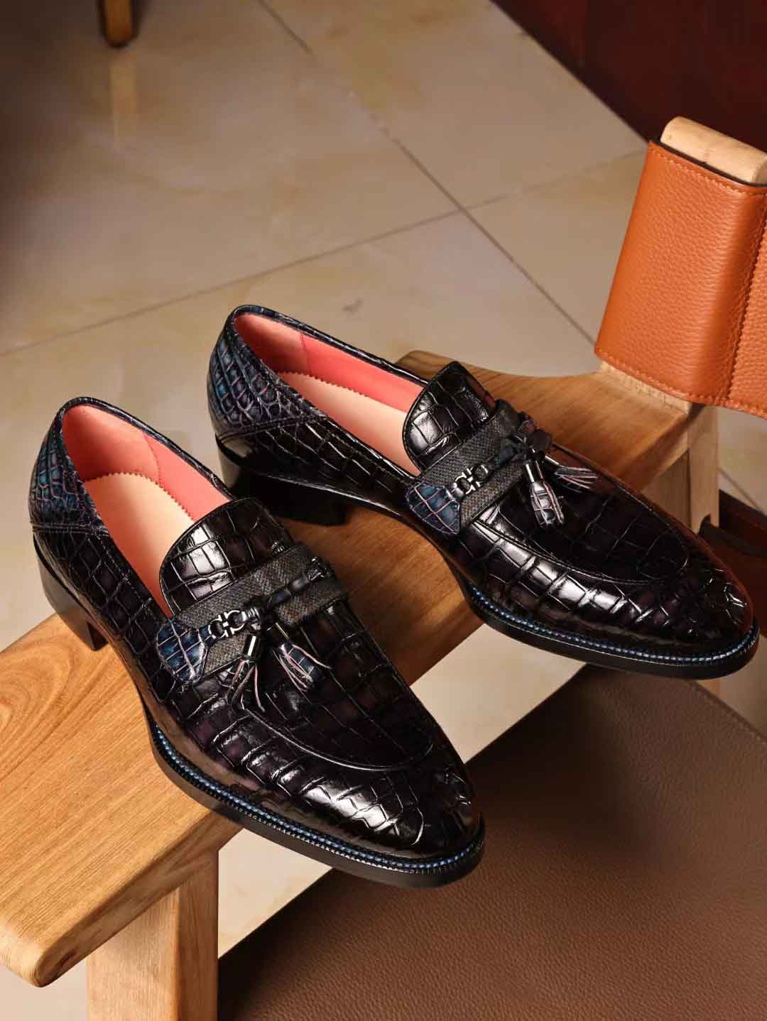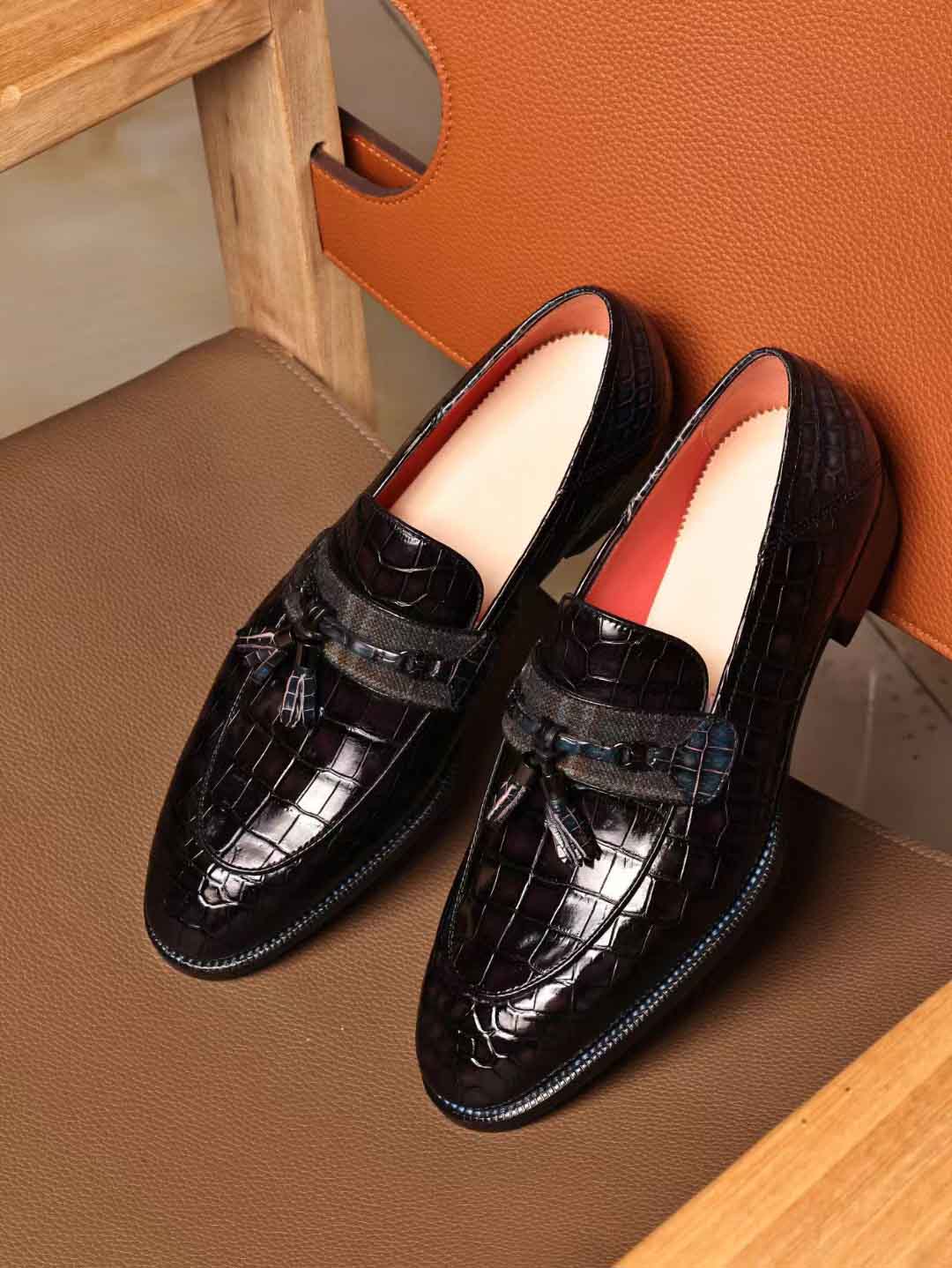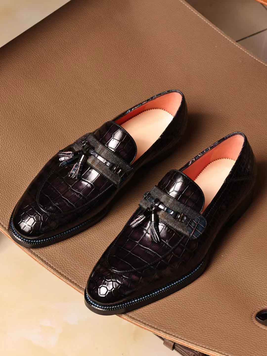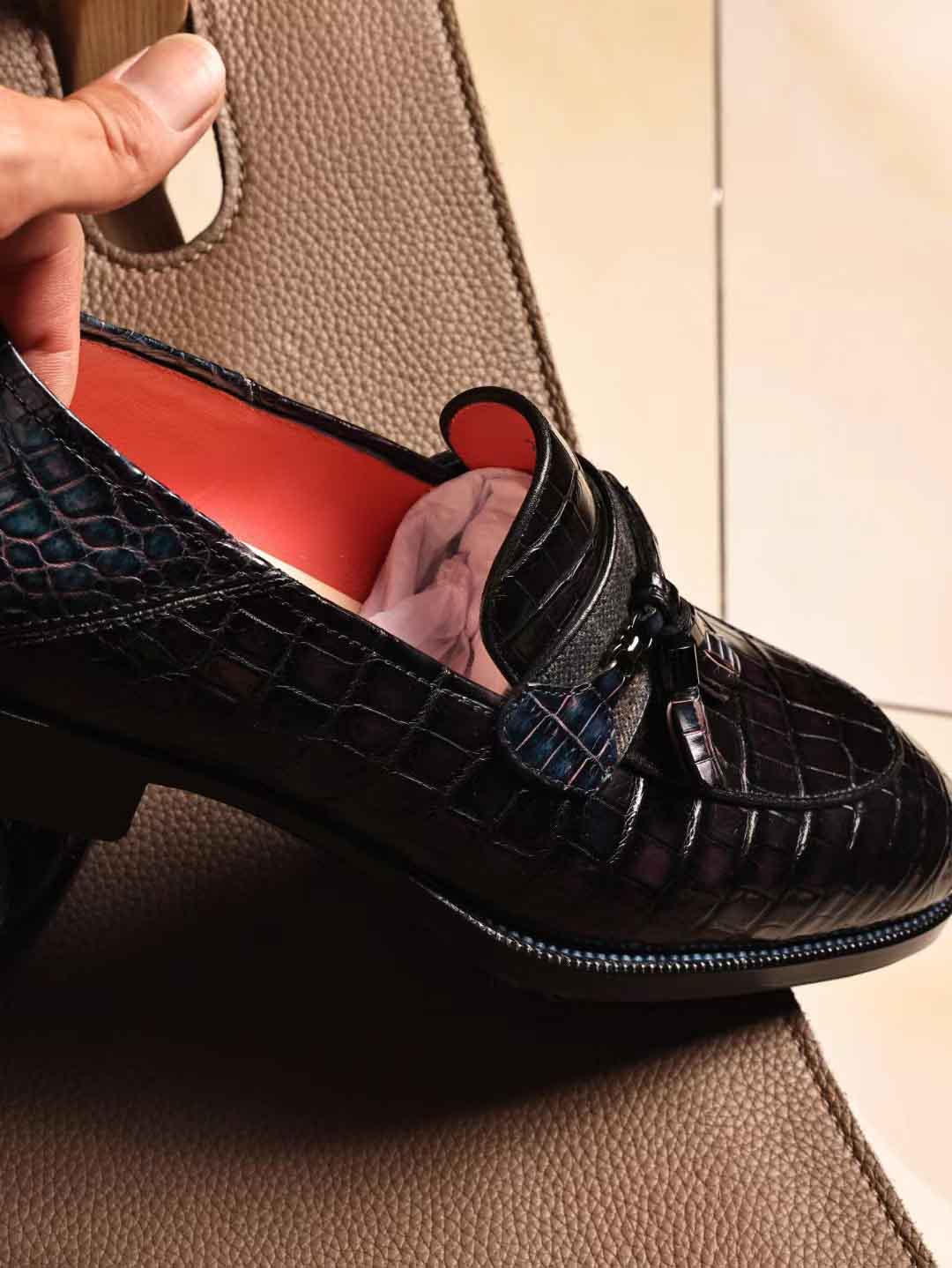 暮云灰拼色 甄选鳄鱼皮料,使用湾鳄鞋专属楦型 兼具优雅与舒适性。 将皮革特性发挥得淋漓尽致 摇曳的流苏 为整体风格增添灵动特性 手工打磨琴底 精细后处理。