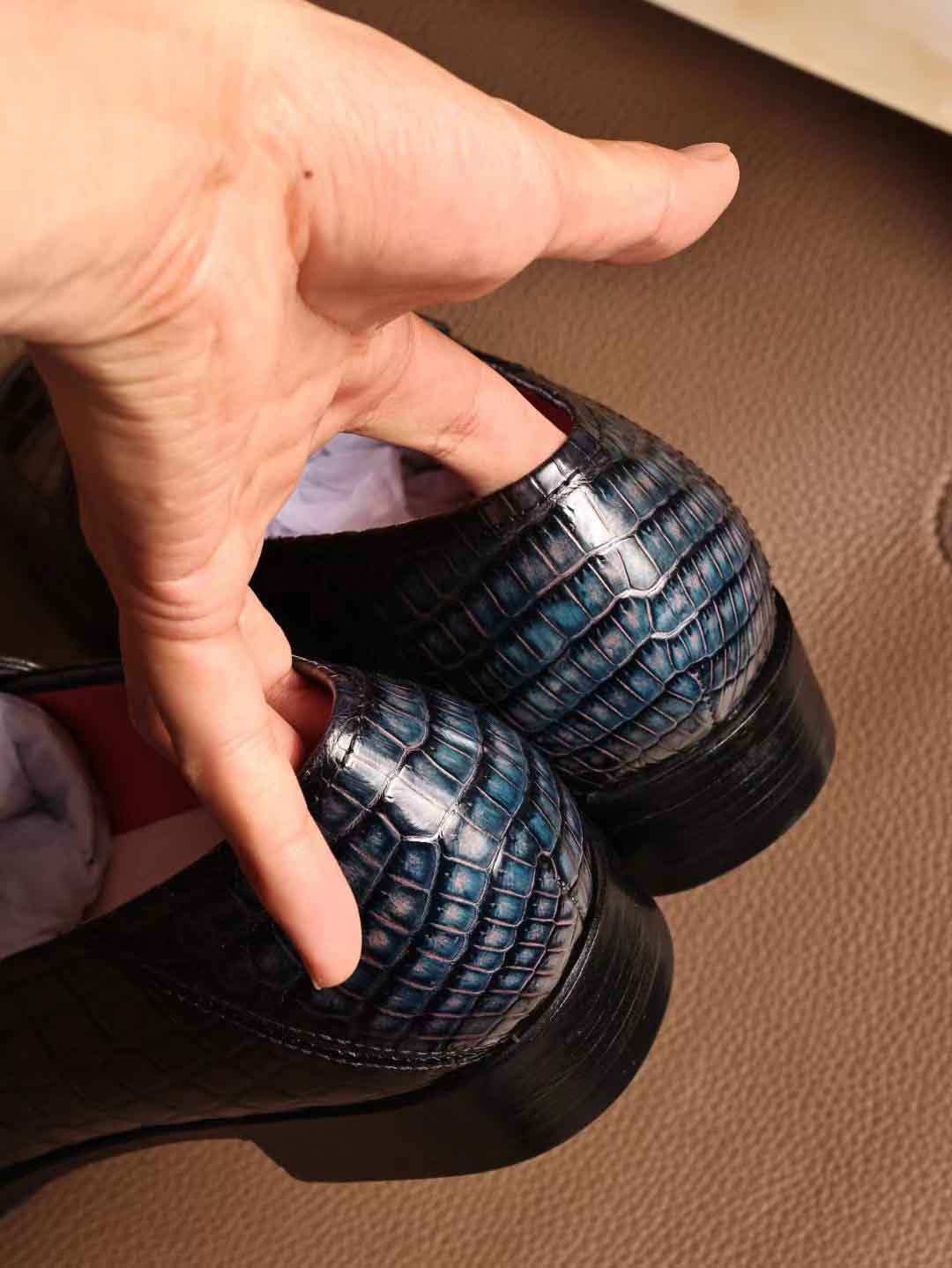 一脚蹬美洲鳄鞋,暮云灰拼色,圆弧琴底,客订出。微信联系 95506803