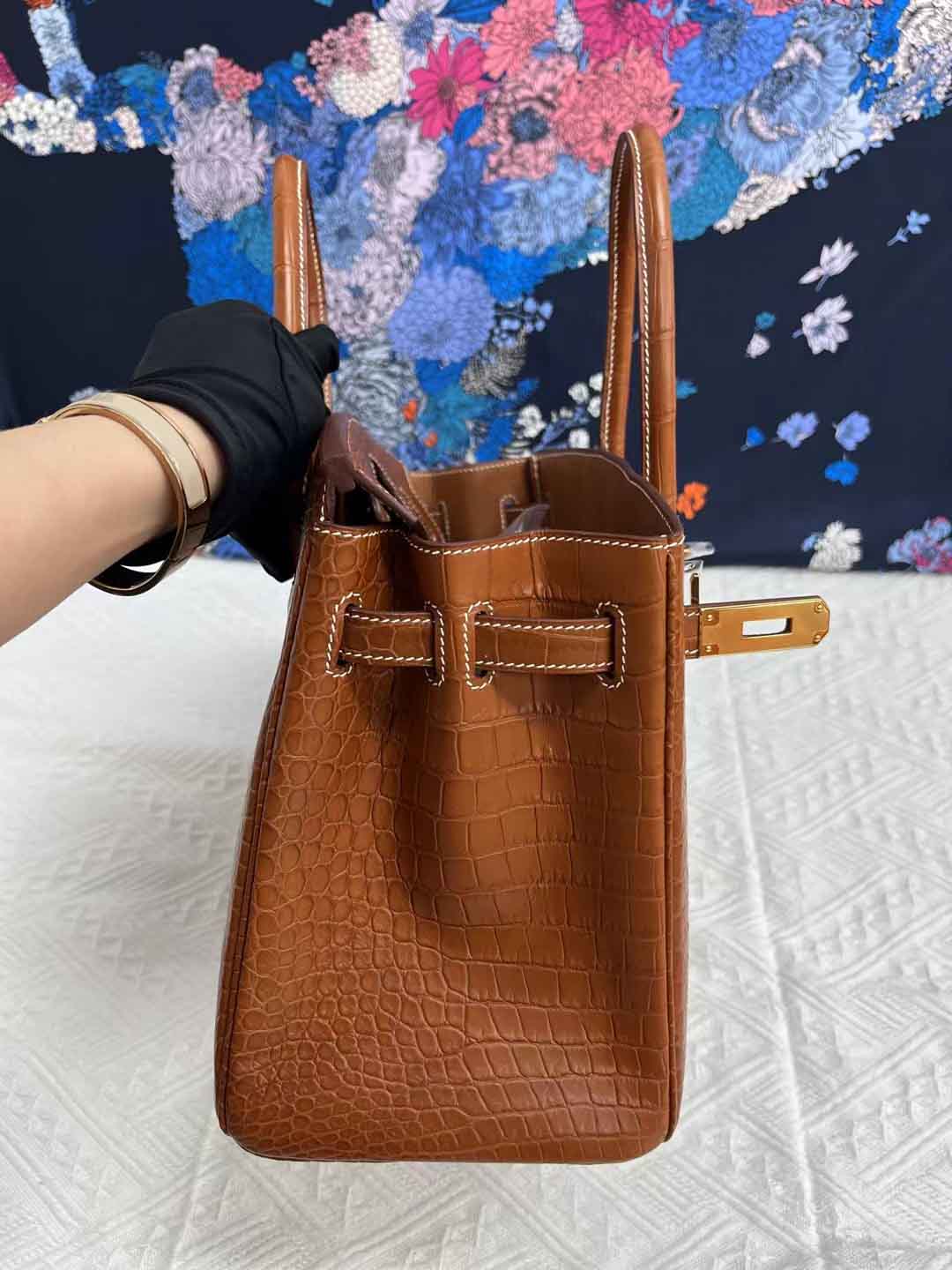 法国HCP雾面湾鳄金棕色搭配手工白色蜜蜡线条,整体效果非常不错,纹路纹理清晰可见,质感满满滴。