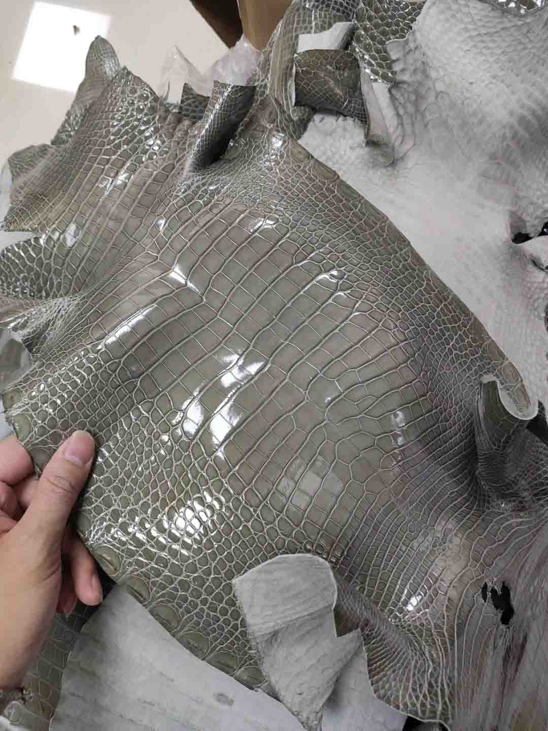 由于美洲鳄鱼体型比较大,所以美洲鳄鱼皮的张幅比较大,我们说的美洲鳄就没有气孔,泄殖孔上方有明显裂痕,气孔和裂痕是这个品种的重要标志。竹节纹整齐漂亮,与圆纹部分界线清晰,圆纹密集而且比较小。