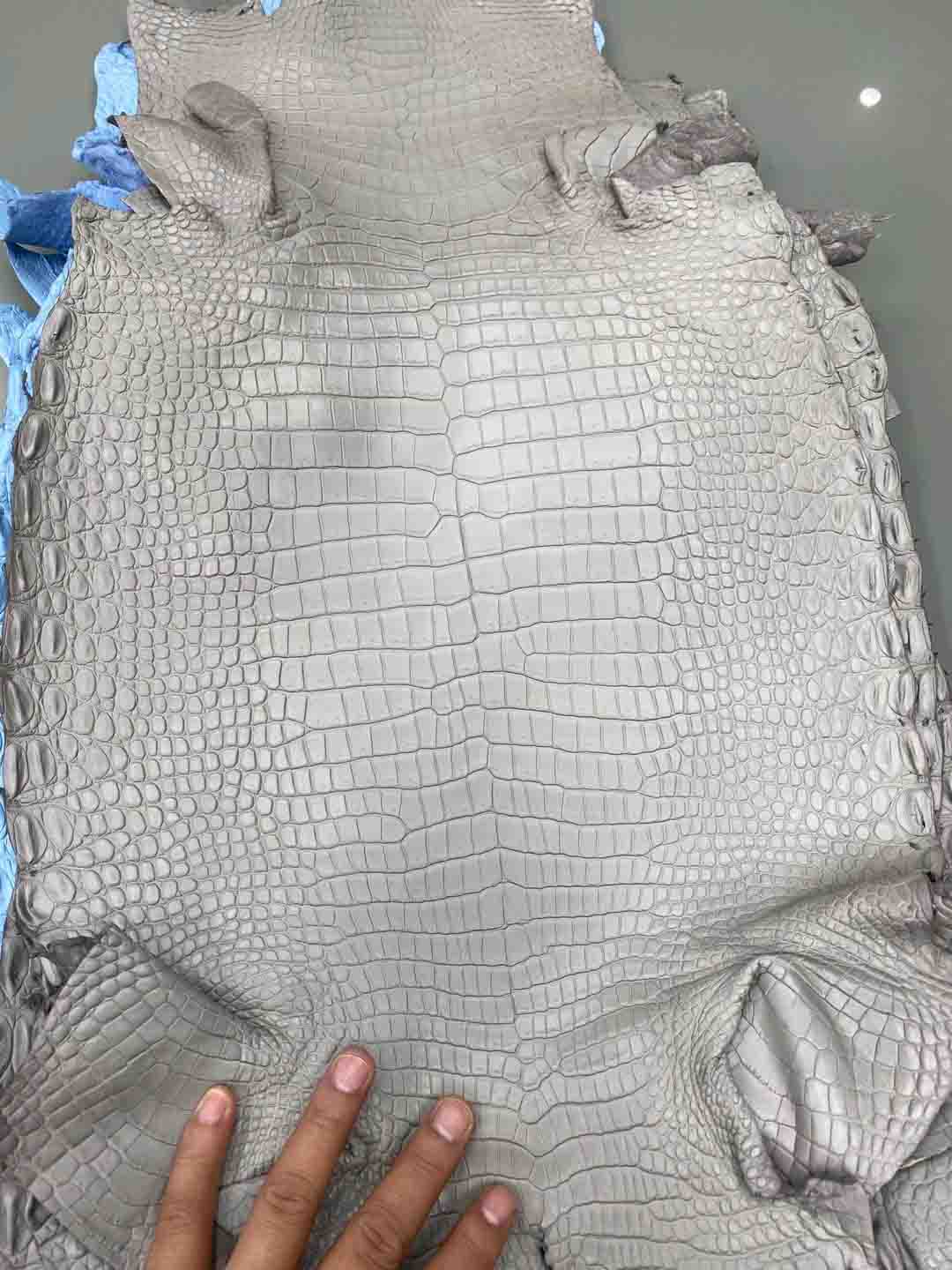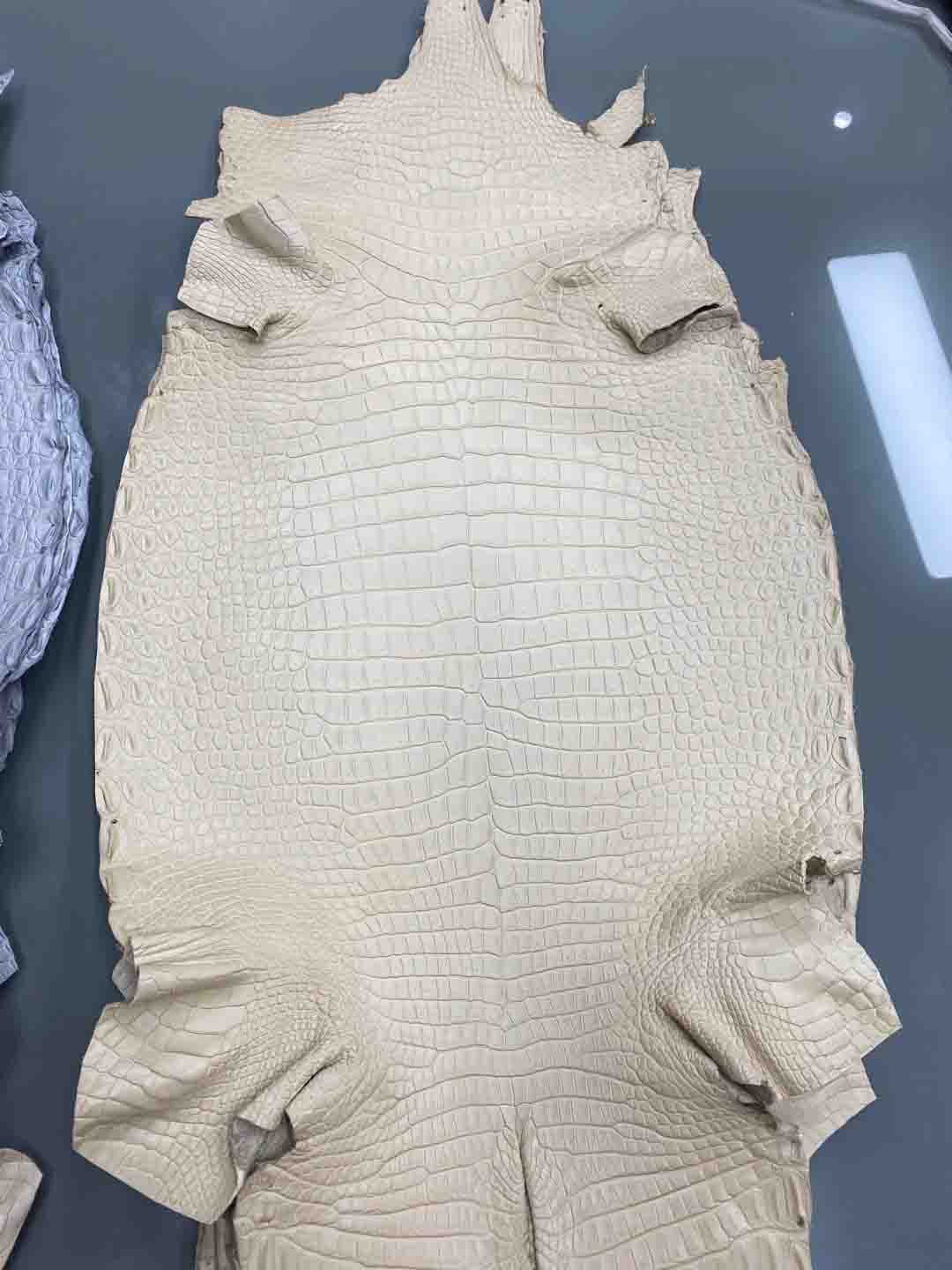 3.尼罗鳄:高档鳄鱼皮之一,有气孔,肚皮相比美洲鳄与湾鳄没有那么狭长,腹侧的圆纹最大,明显区别于其他品种。