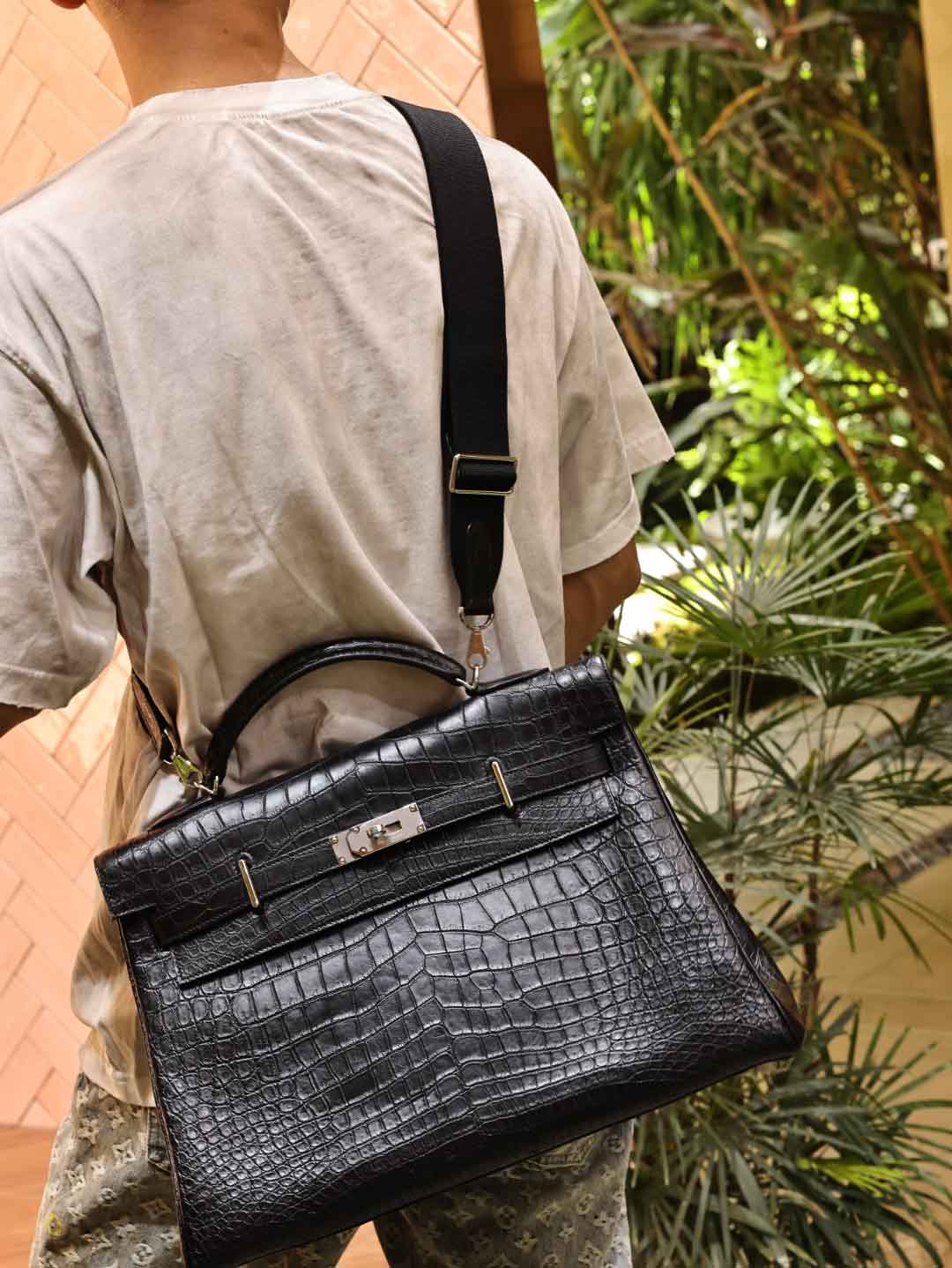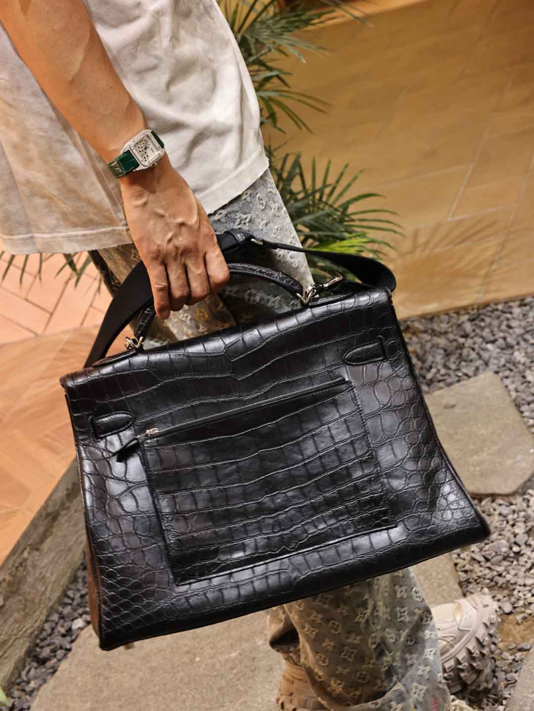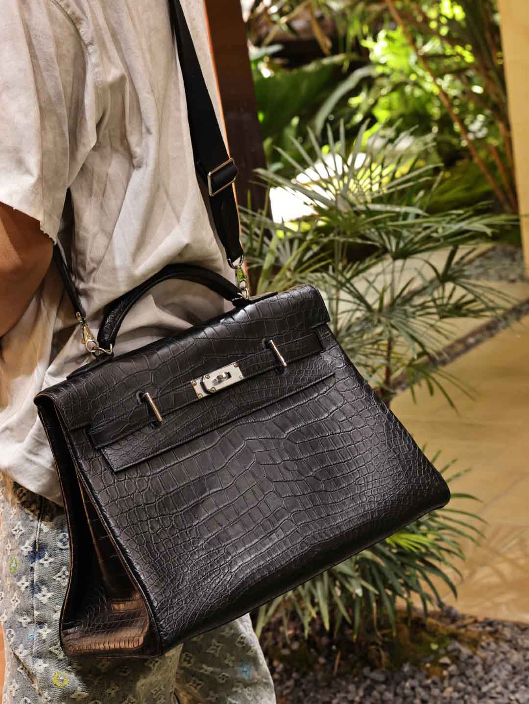 Kelly Maxi42单肩包,黑色哑光湾鳄鱼皮手提包,银扣实拍现货。