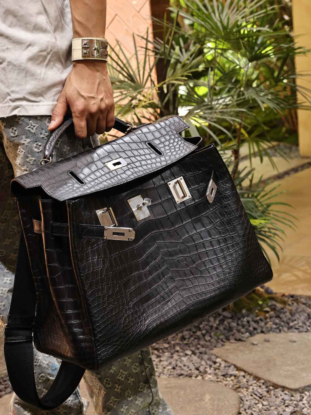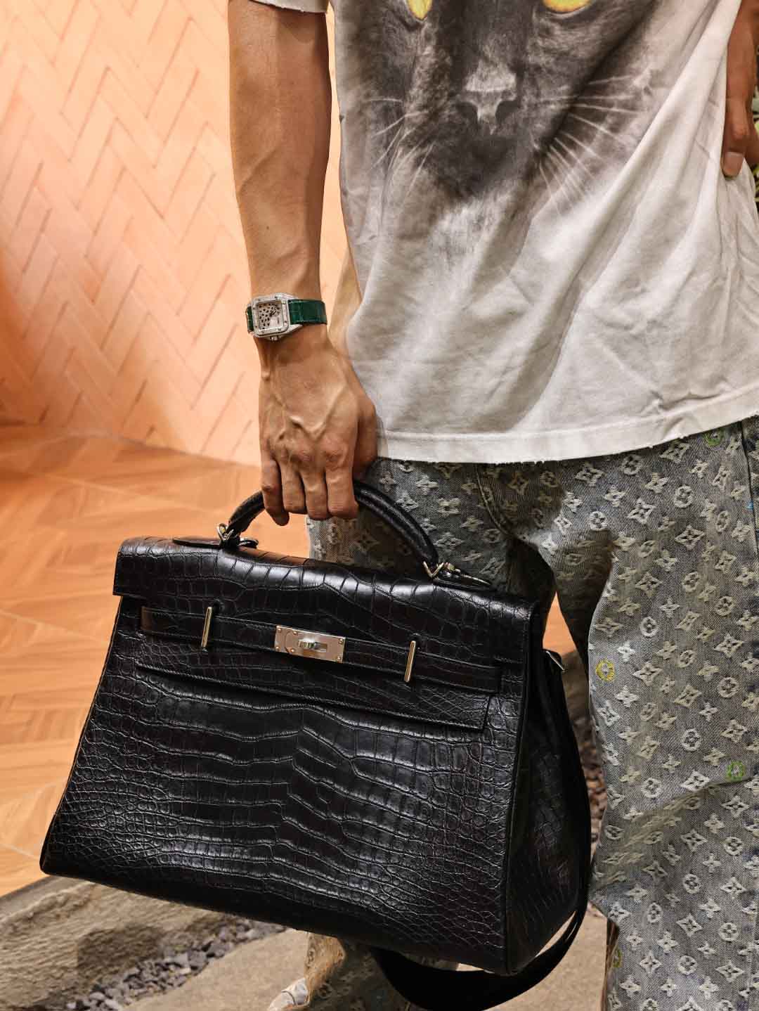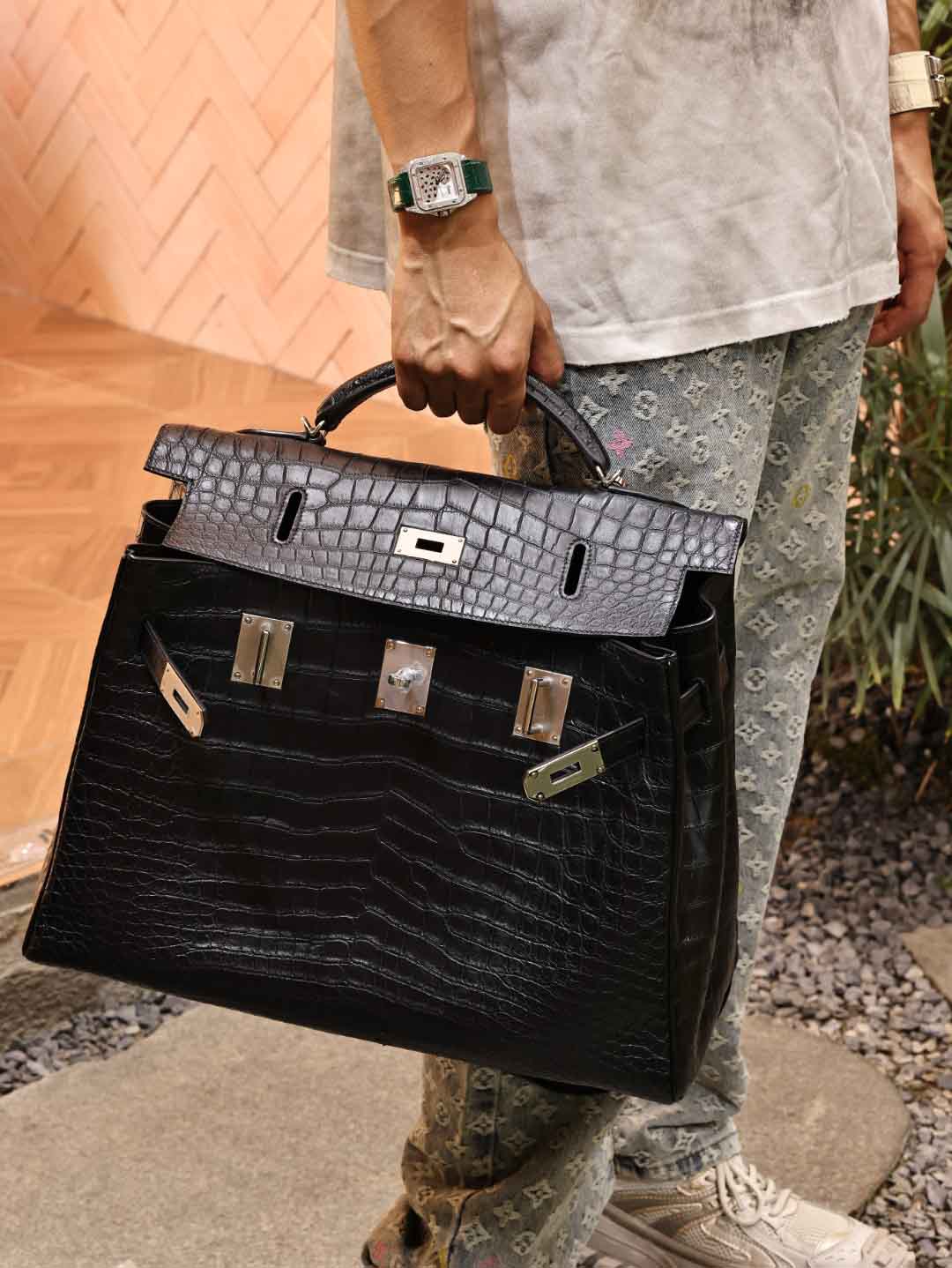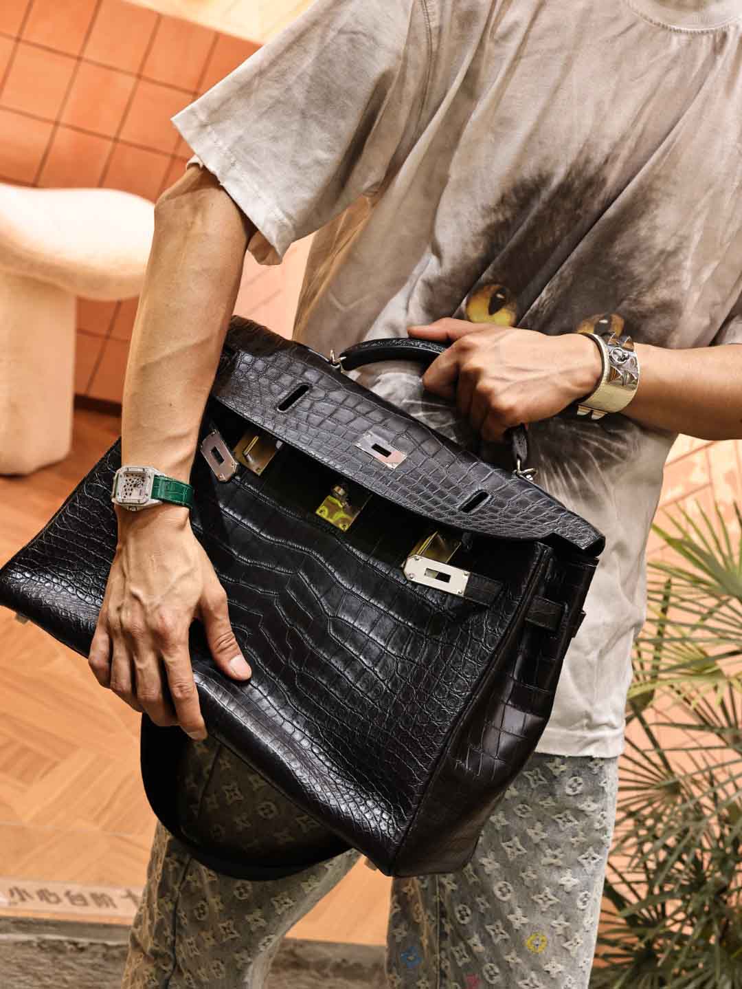 Kelly Maxi42单肩包,黑色哑光湾鳄鱼皮手提包,银扣实拍现货。