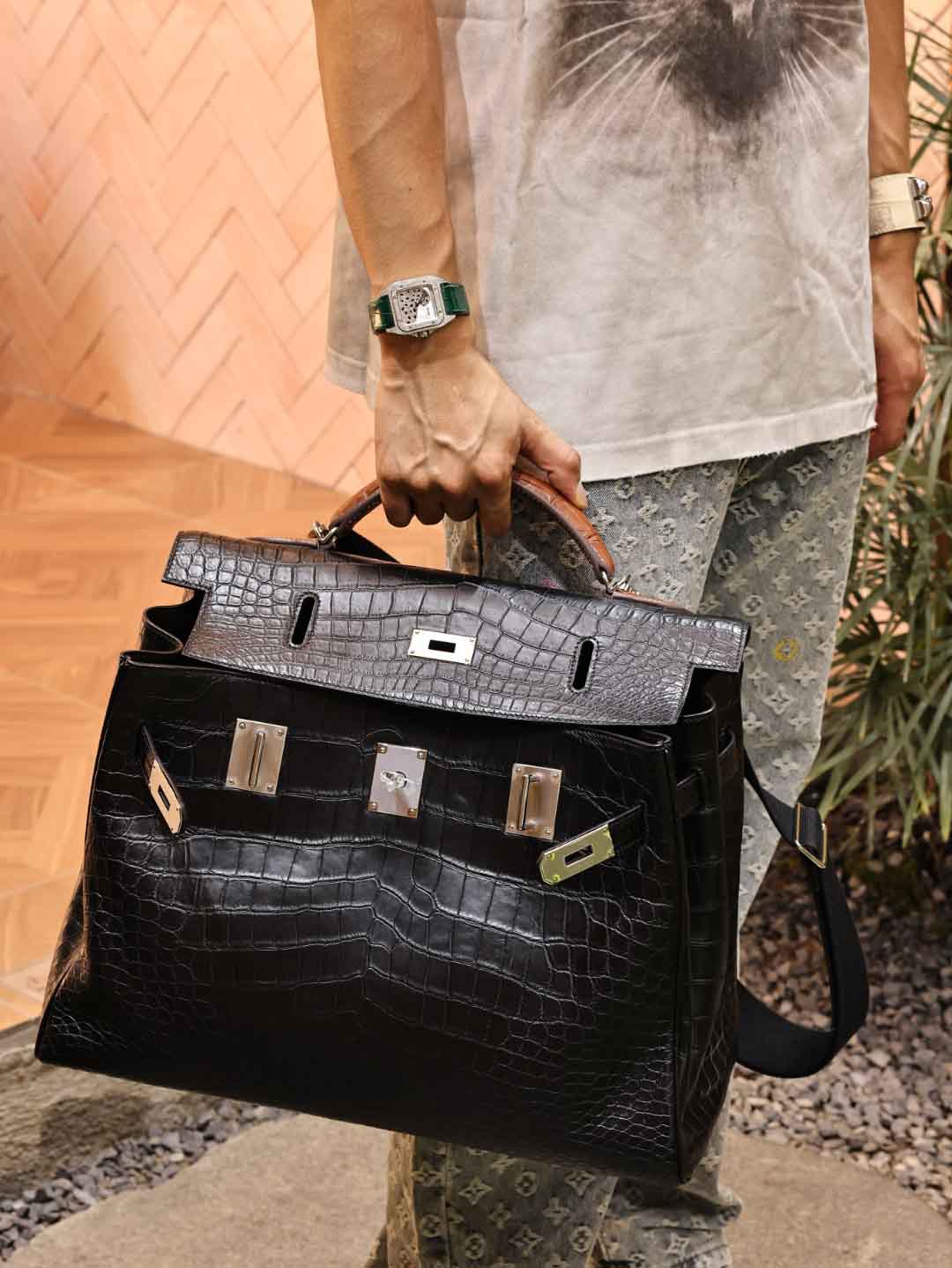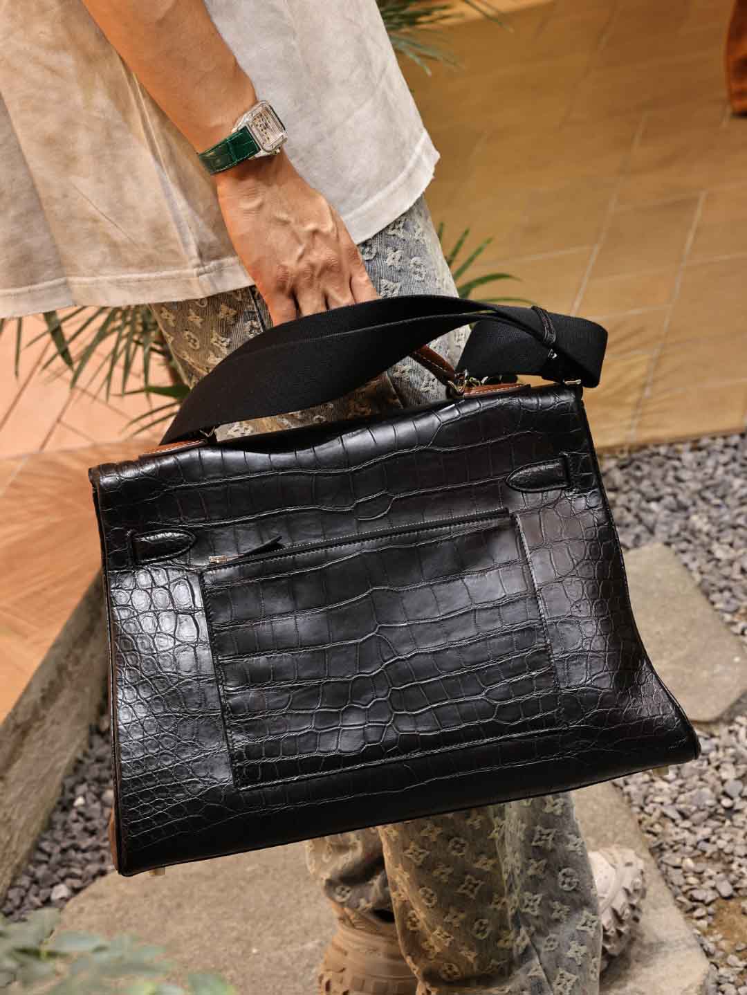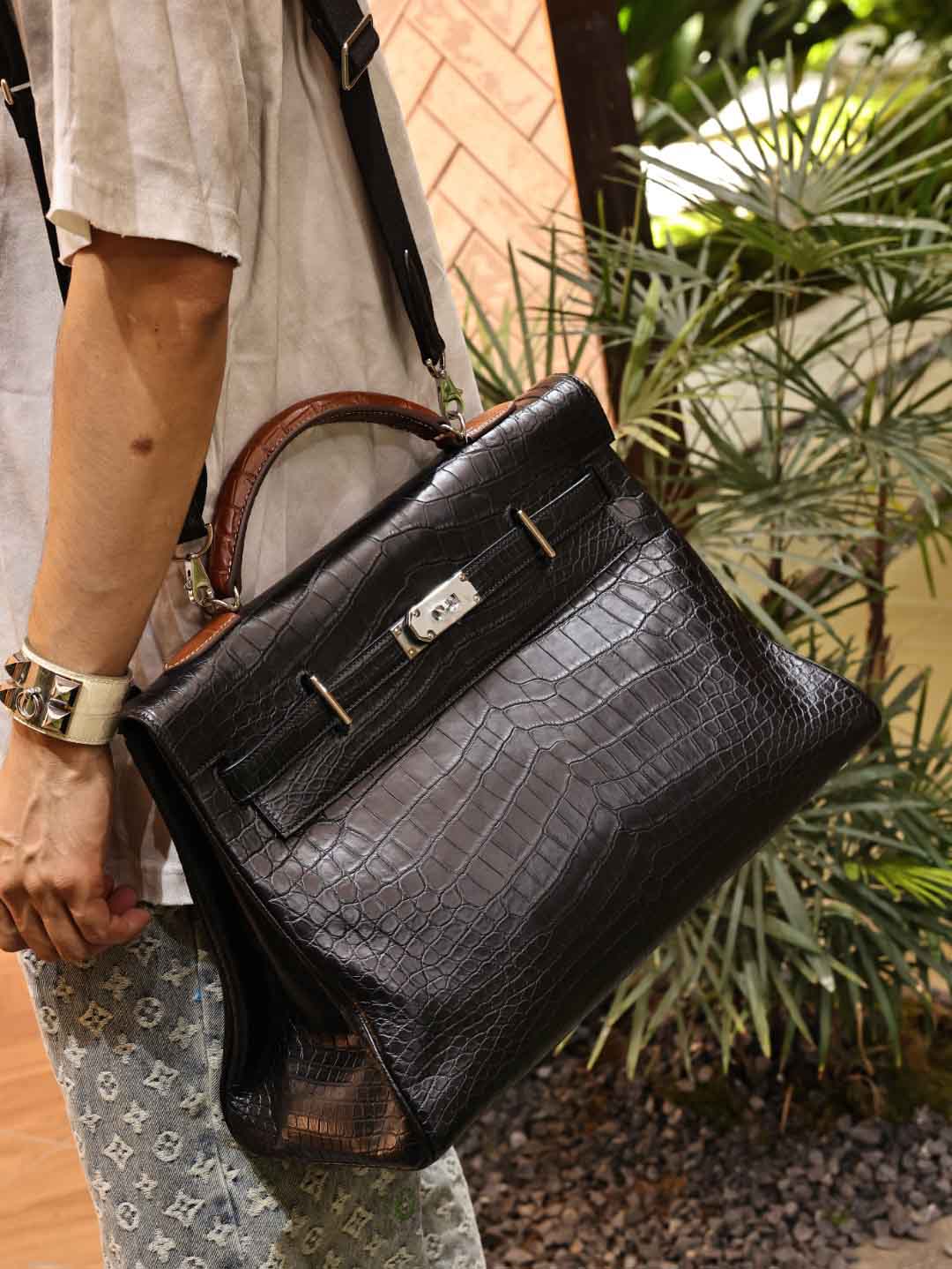 Kelly Maxi42手提包,黑色鳄鱼皮拼马鞍色鳄鱼皮手腕,银扣实拍现货。