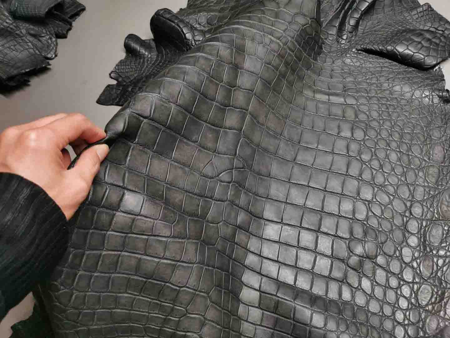 进口HCP的水染湾鳄,手感细腻,纹路块块分 近40宽度的大鳄,没有伤是不可能的,好在下料可以避开明显伤疤。