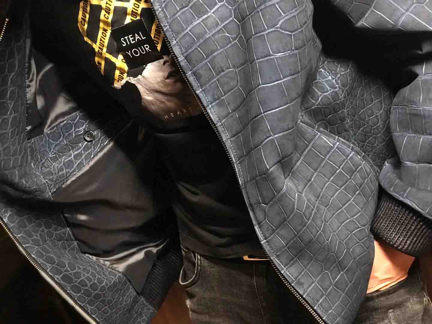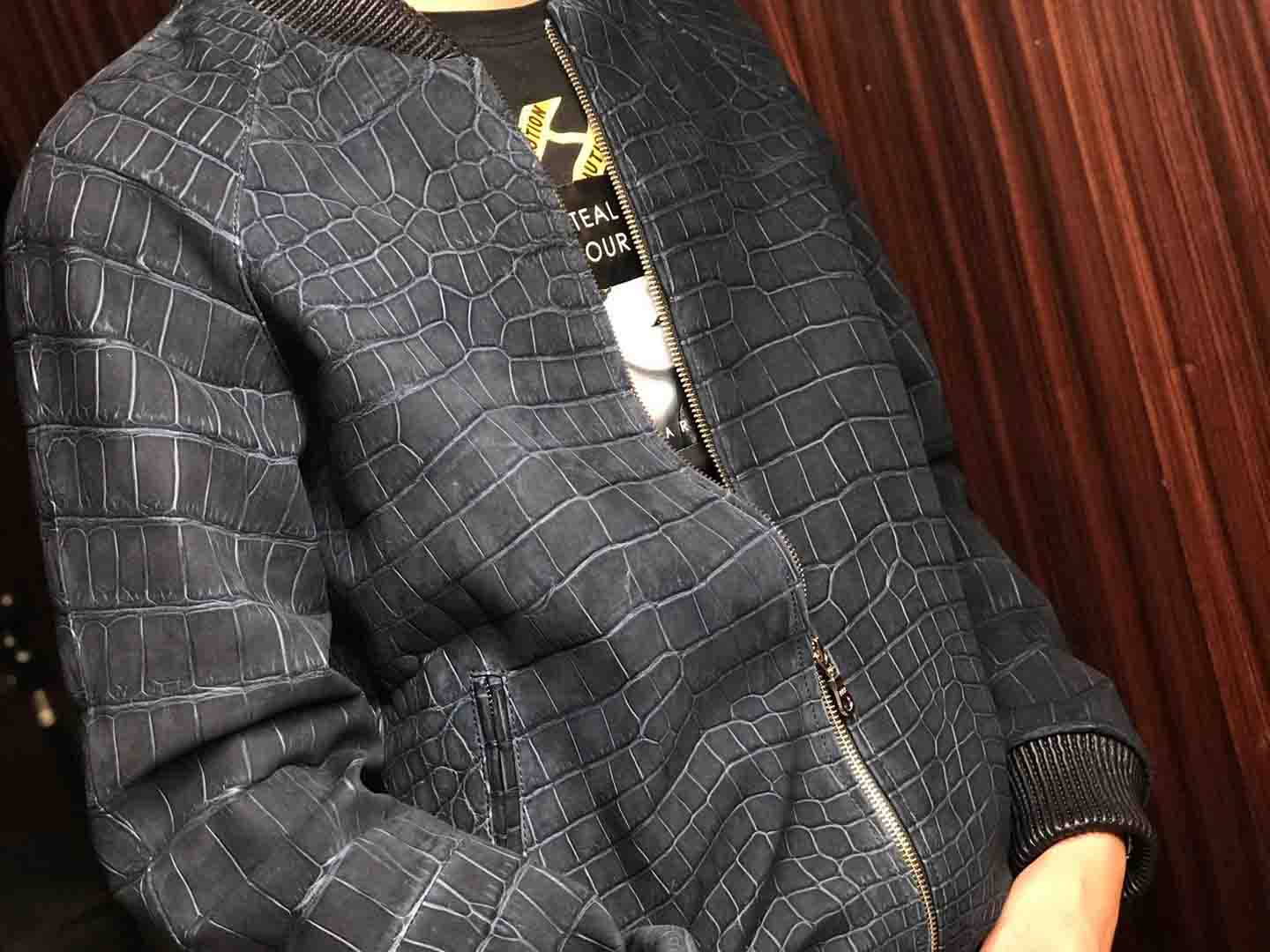 #新款 #黑蓝色磨砂鳄鱼皮 休闲夹克49码。风衣大衣定制中心联系020-37417995