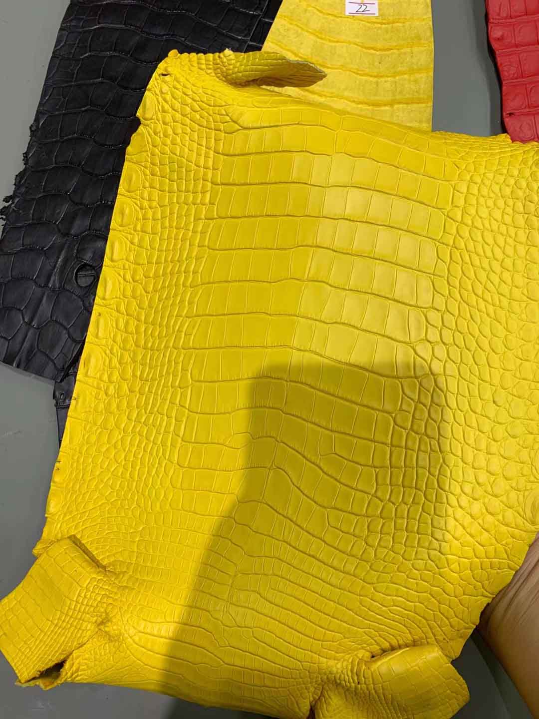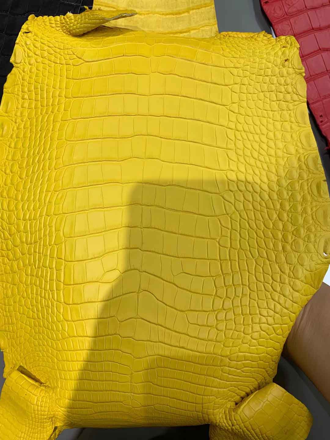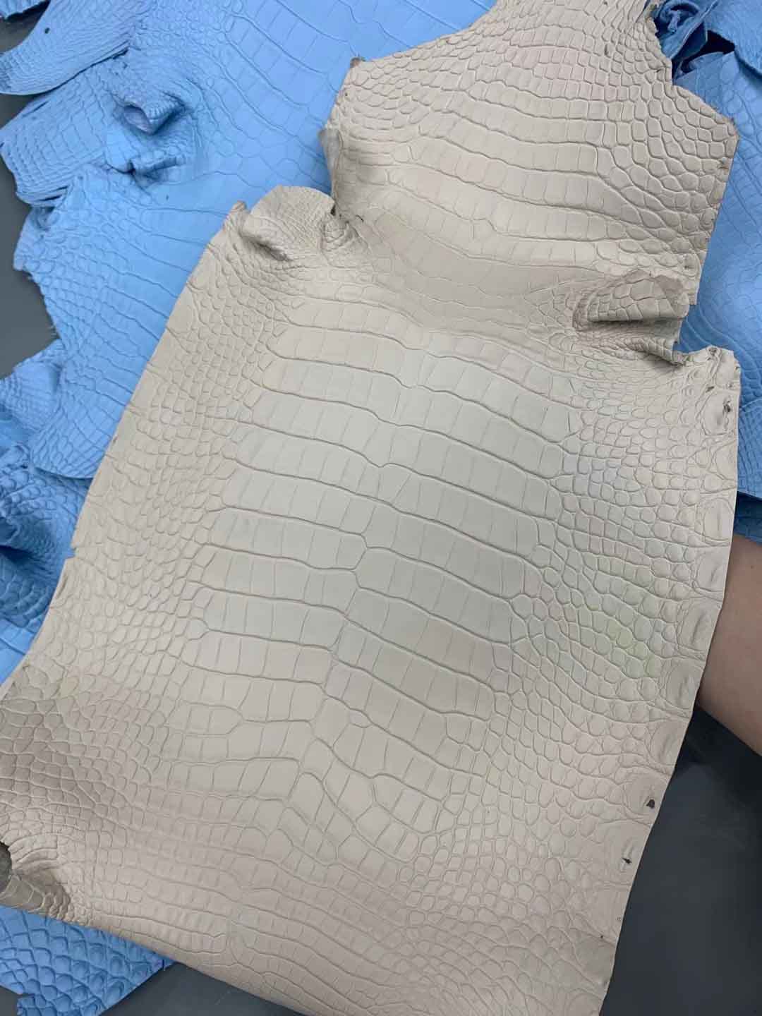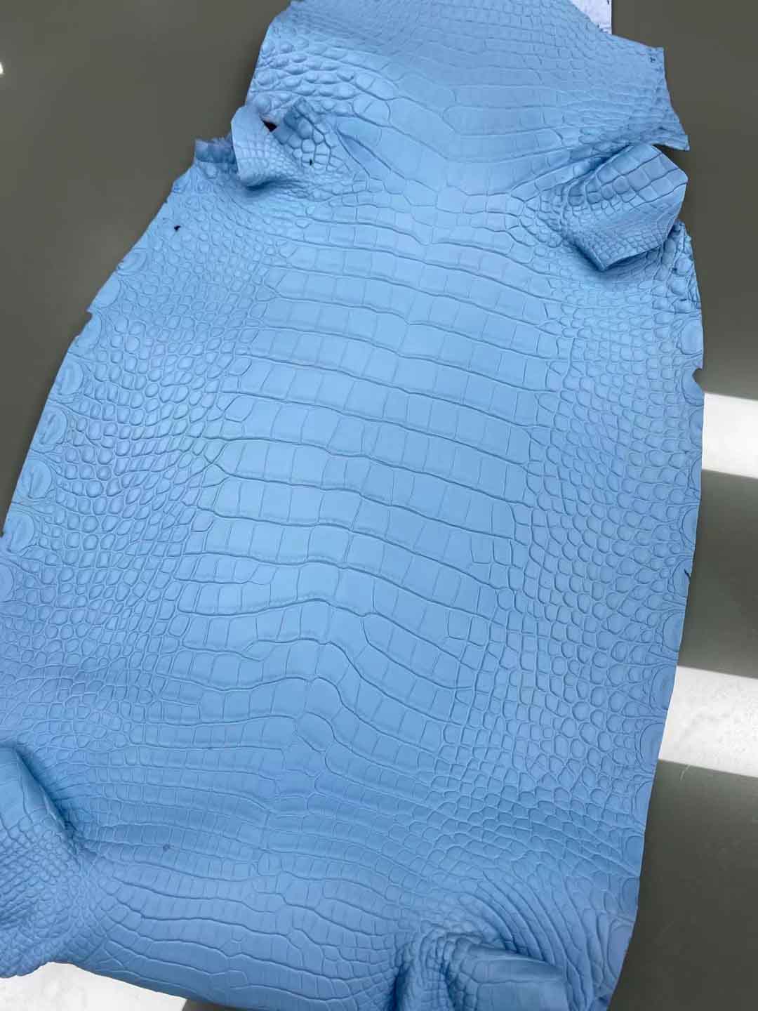 美洲天空蓝、香草色、金盏花黄新料到货。可以定做自己喜欢的美洲鳄皮料颜色,10张起订做。美洲鳄皮具定制厂家专业定做高端私人皮具等皮件。