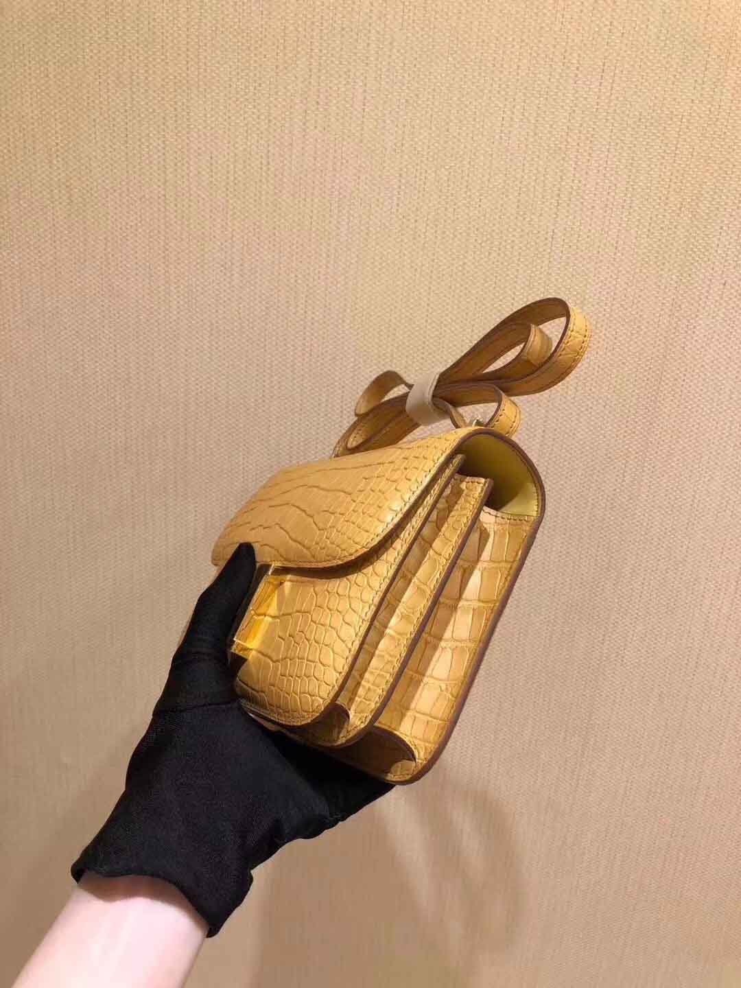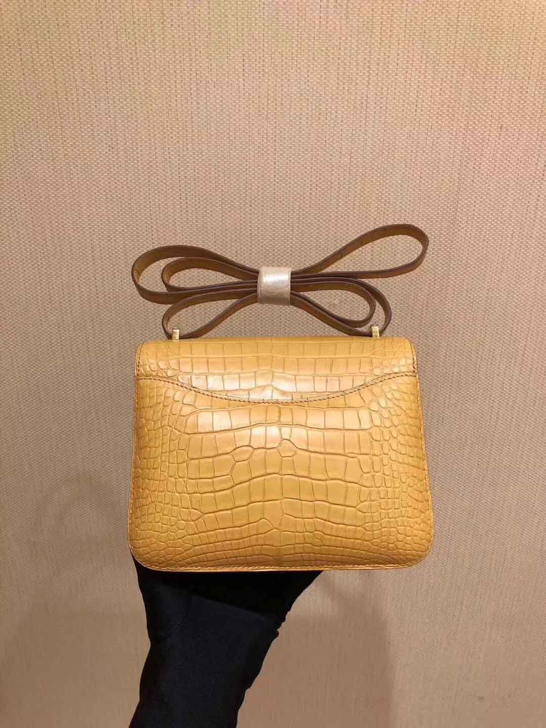定制款. Constance 18cm 雾面美洲鳄 shiny alligator 2S芝麻色/琥珀黄内里 金扣,蜡线手工缝制私人定制空姐包厂家
