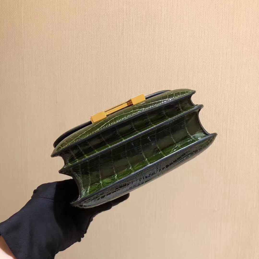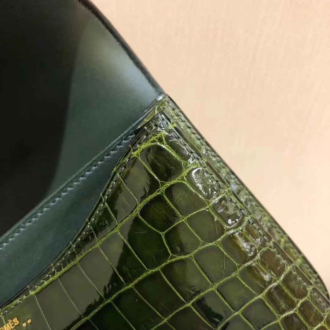 奢侈品定制款. Constance 18cm 亮面尼罗鳄 shiny crocodylus 6H橄榄绿/ 白色蜥蜴皮金扣,蜡线手工缝制美洲鳄鱼皮女包定制工厂