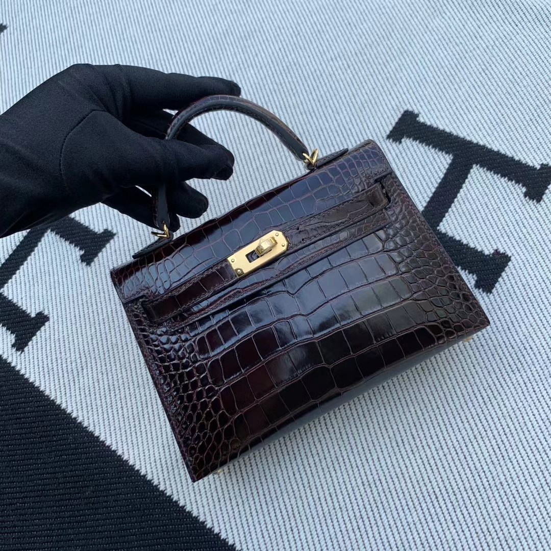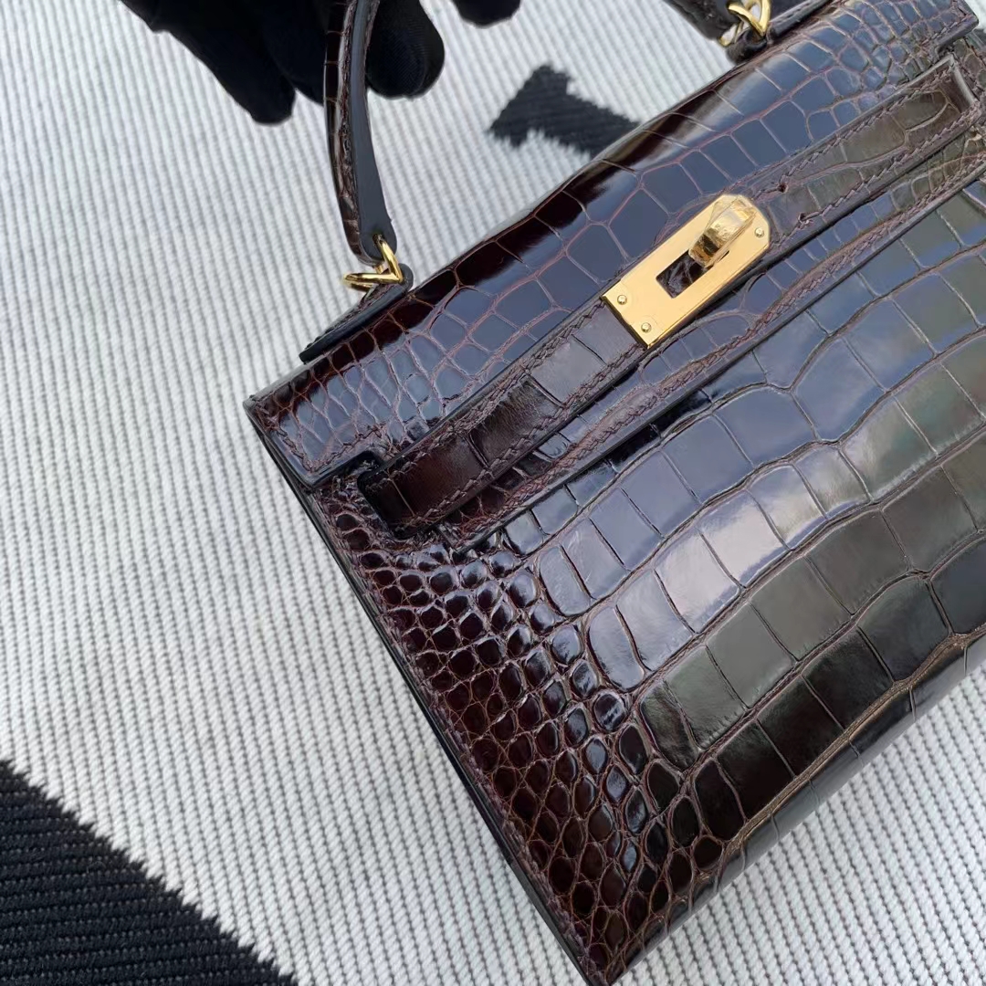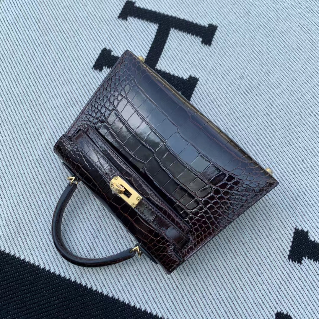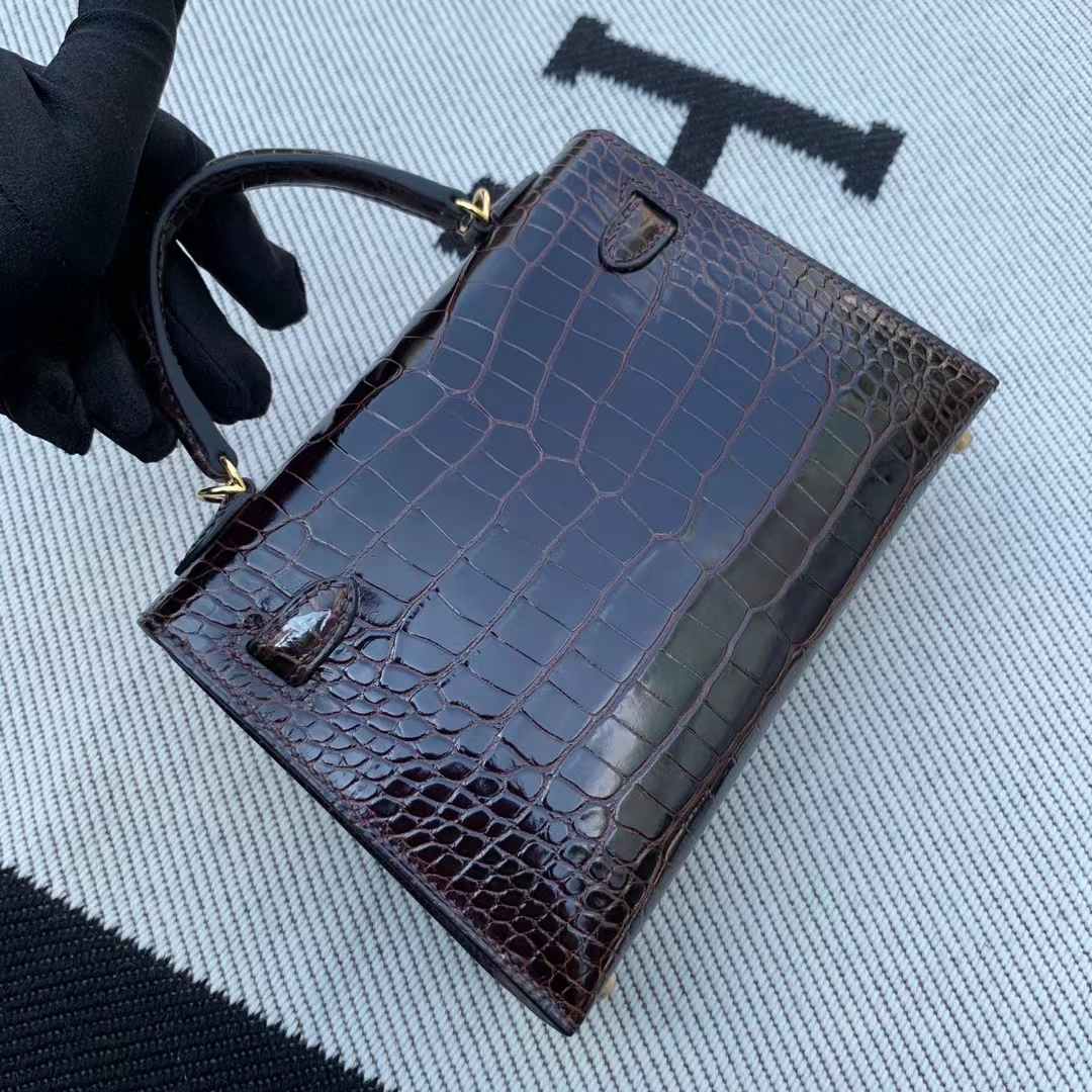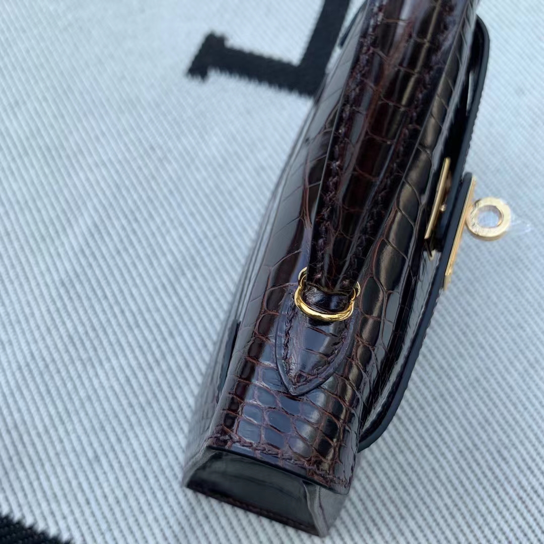 Kelly二代19cm进口美洲鳄高光 乌木色 金扣 全手工缝制 实物拍摄 现货