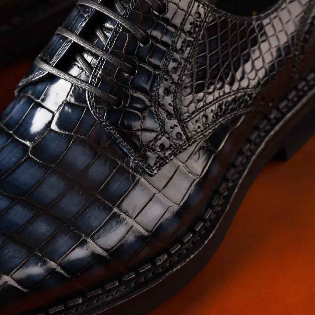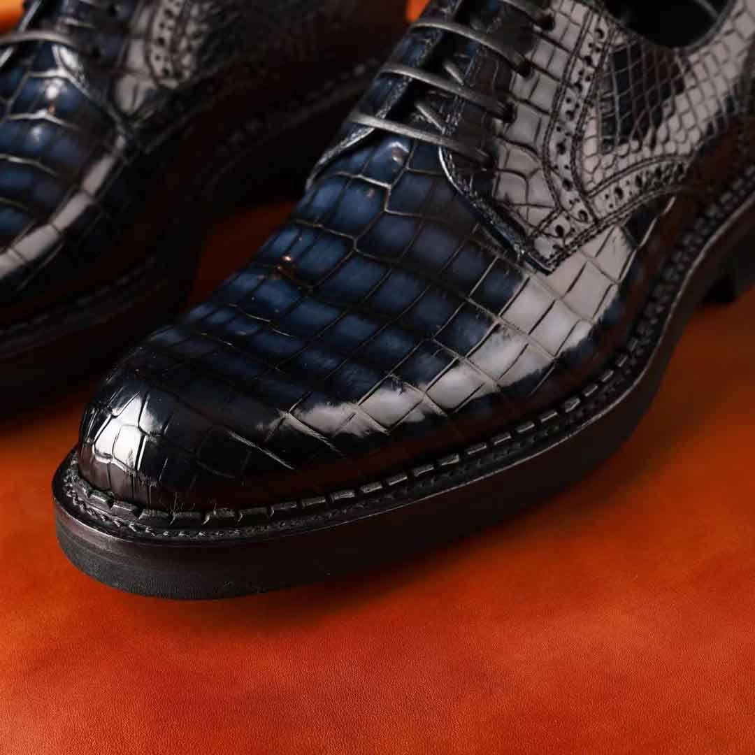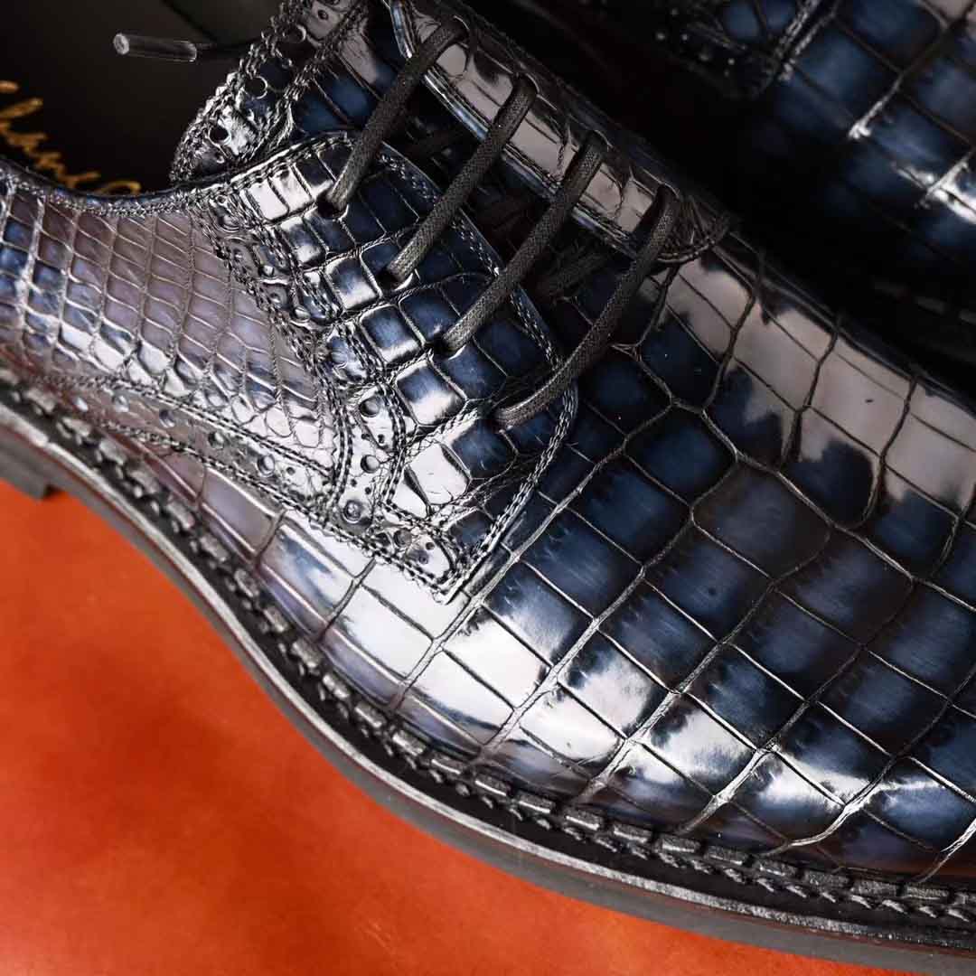 定做一双鳄鱼皮鞋,的价值那么高,所以好好的保护定做皮鞋也是非常重要的。鳄鱼皮鞋并不容易脏,只需软布擦就好了。千万不要用鞋油,只能用专业皮革护理剂轻轻擦拭,其中以含羊毛脂和棕榈树汁为最好,能够提供更高的保护。大家都知道皮鞋最怕风吹日晒,就算是淋雨也只能用软干布擦拭,而不是电吹风吹干,还有擦拭时需要顺着鳞片方向去擦。如果是长期放置的话一定要放鞋撑,以防鞋子变形。