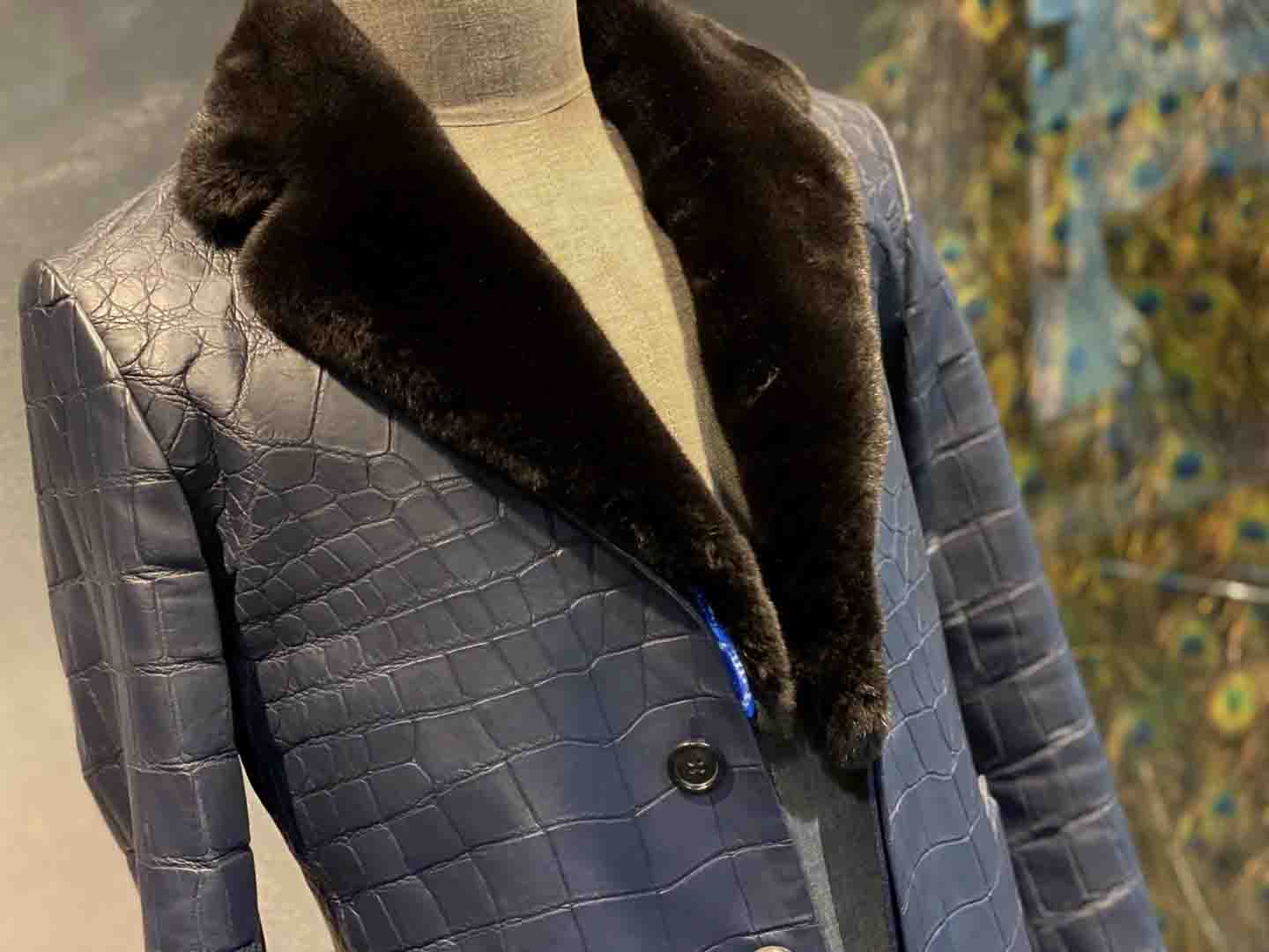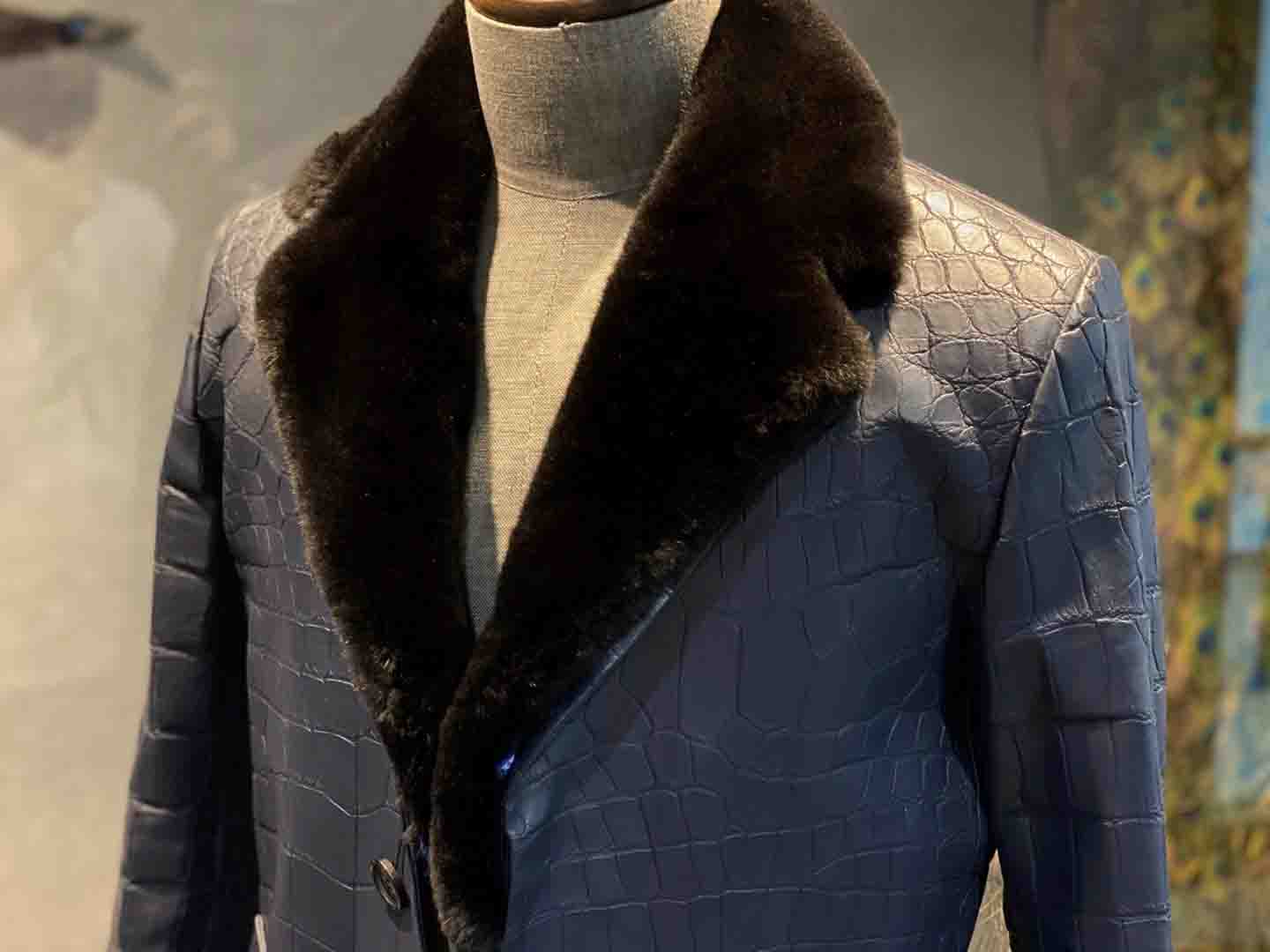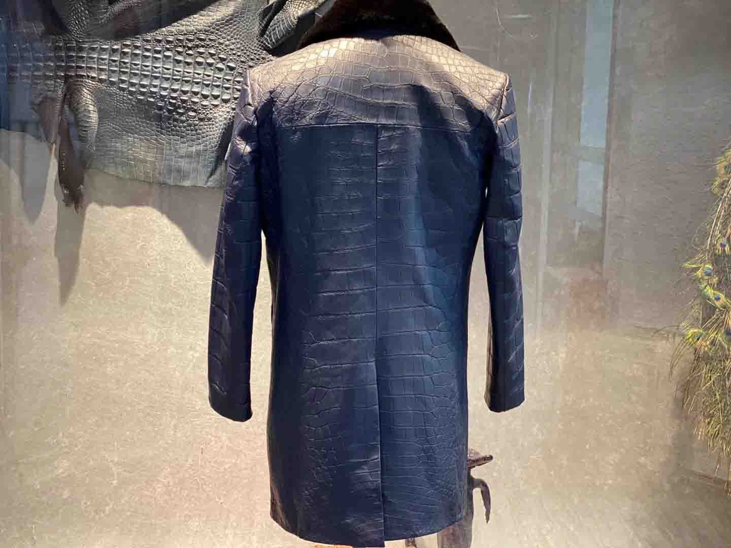鳄鱼皮男款#风衣蓝色/黑色现货50码,鳄鱼皮长款衣服定制工厂微信联系 95506803