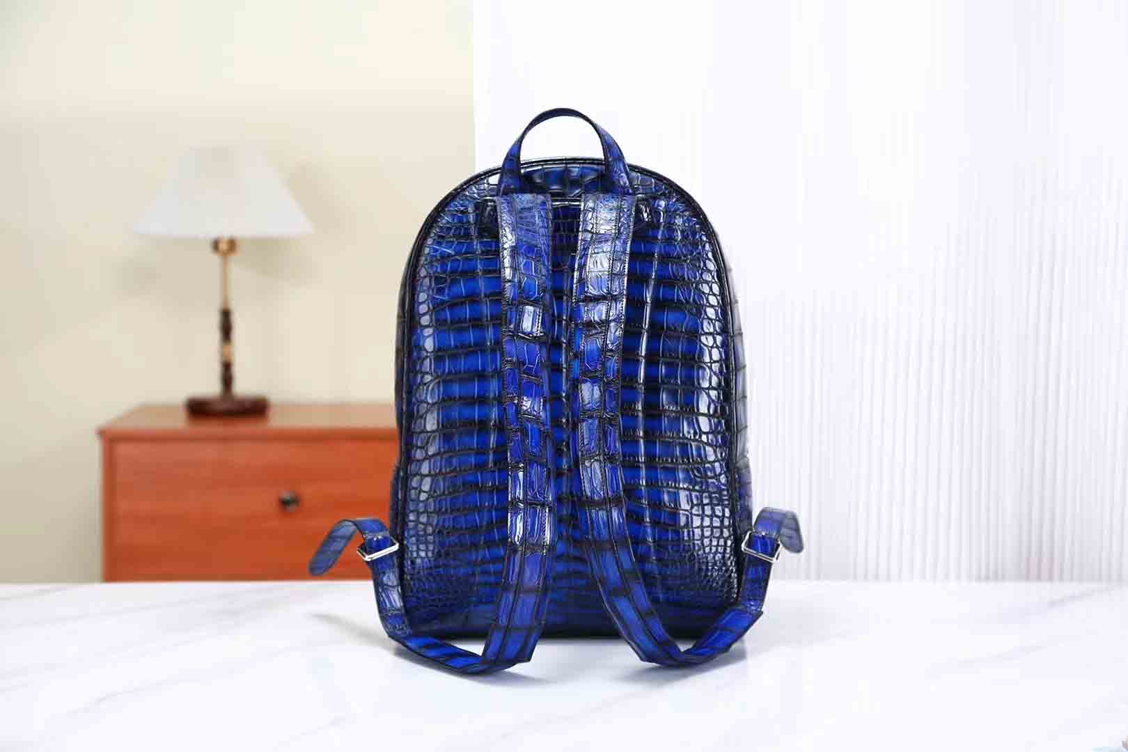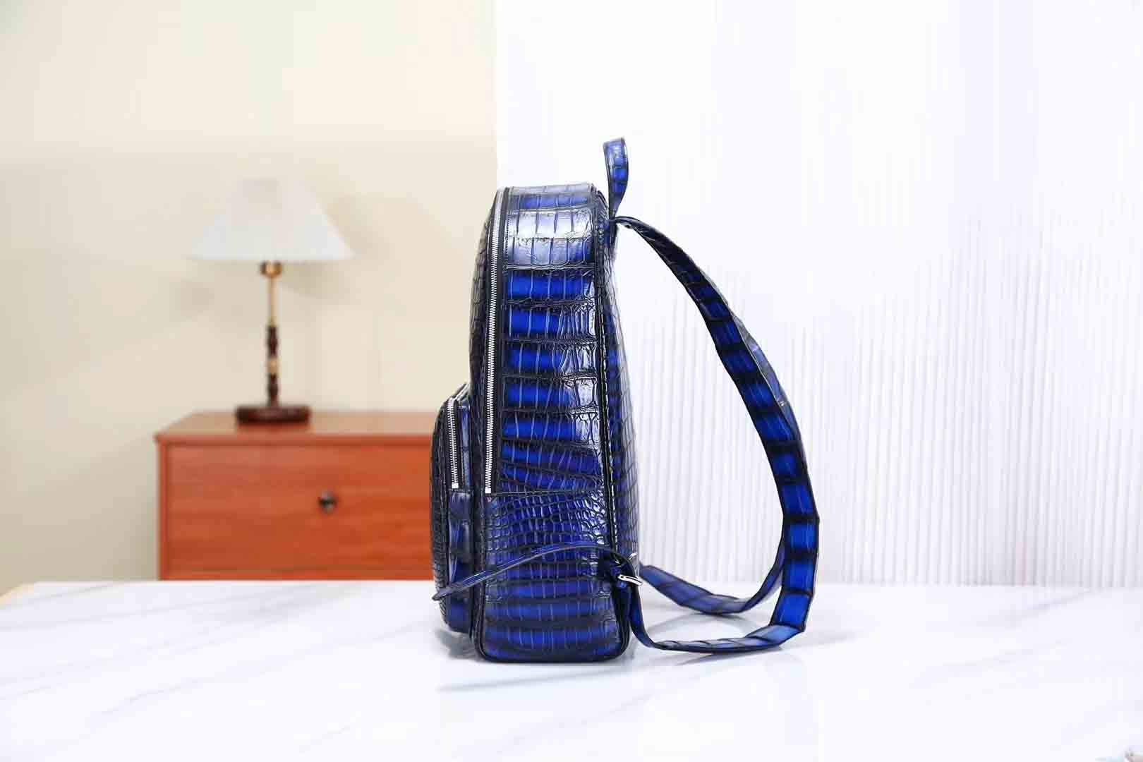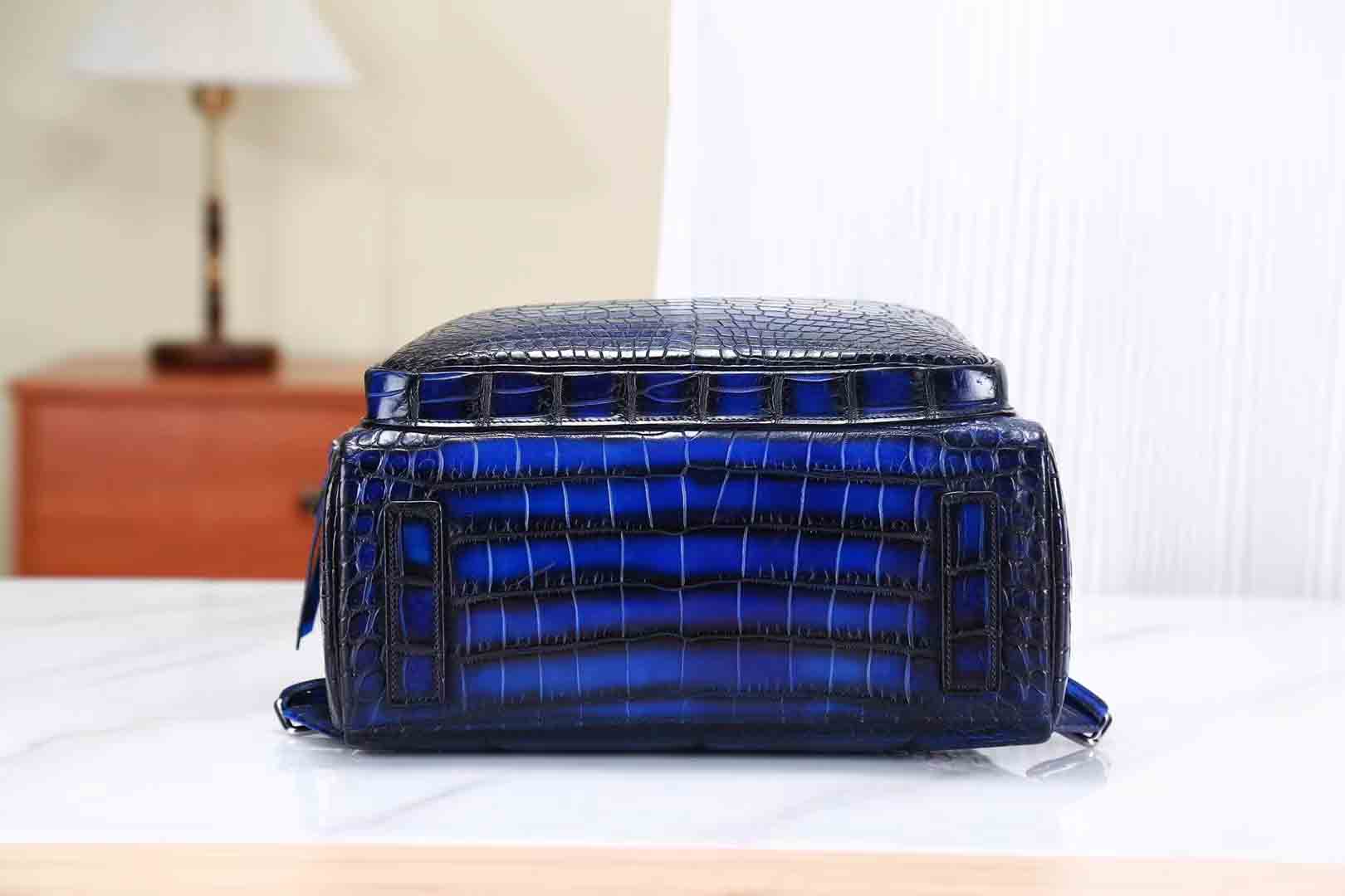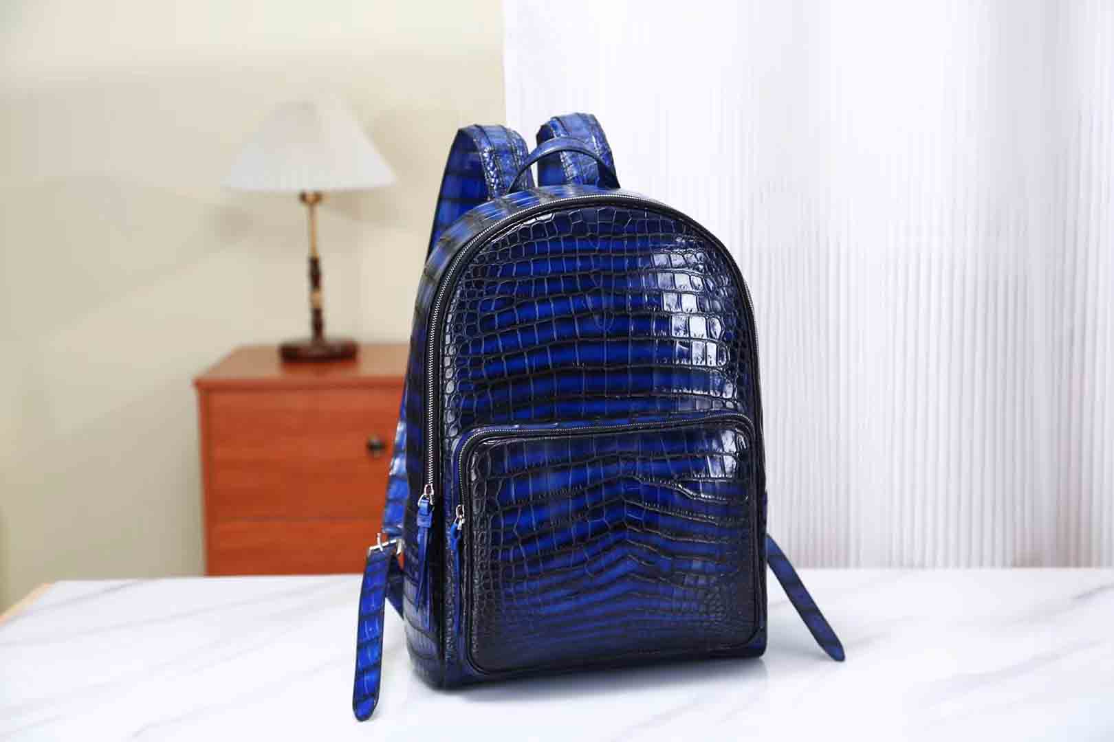 鳄鱼皮纯手工古法擦色电光蓝双肩包。鳄鱼皮双肩包订做厂家微信 95506803。