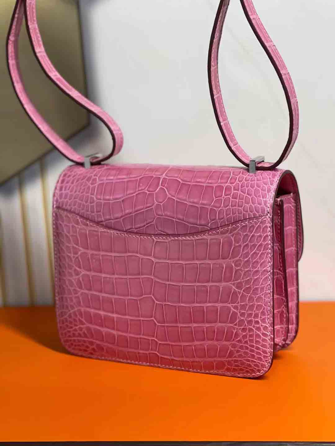 高光美洲鳄皮单肩包预约订做,constance 18cm 亮面兴隆美洲鳄鱼 樱花粉 下单可发