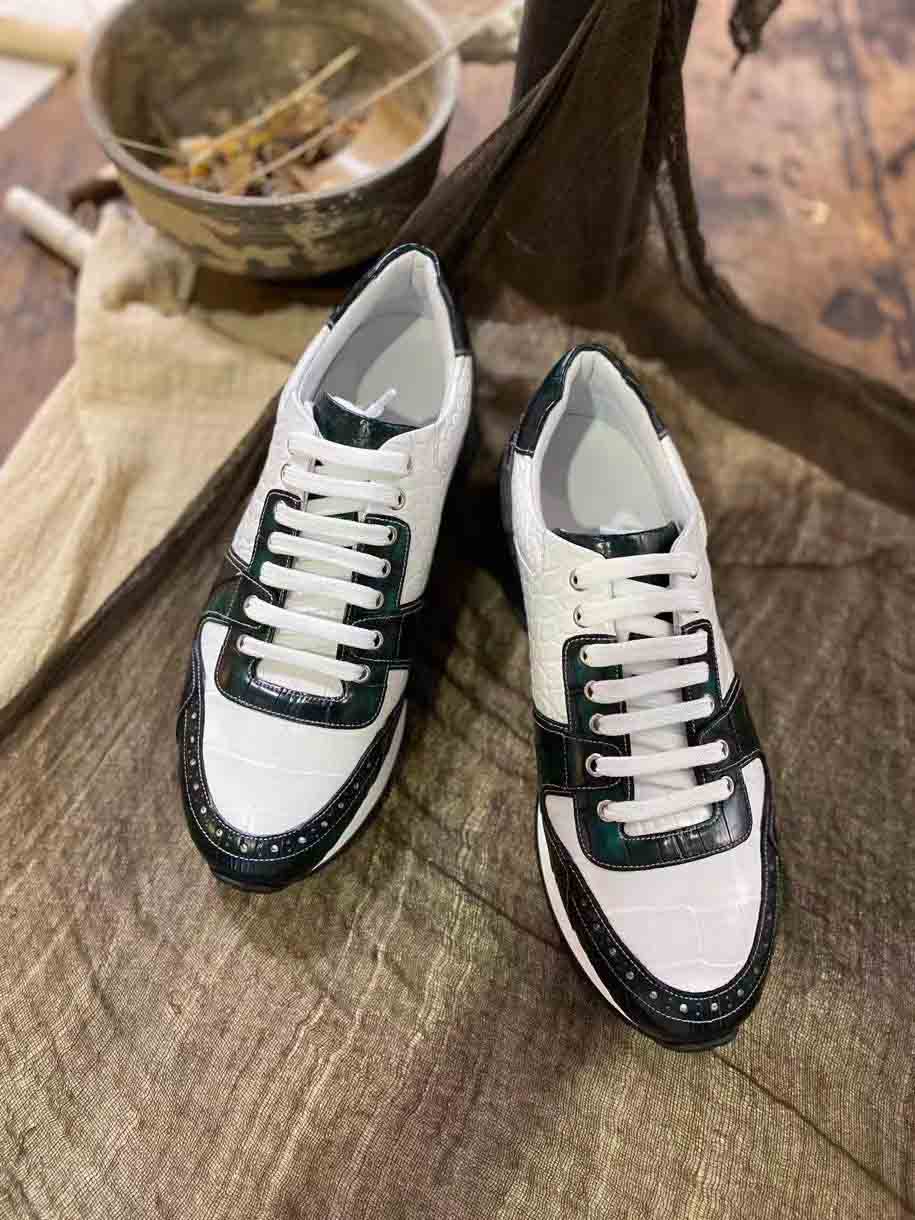 皮料选用鳄鱼皮,擦色工艺质感,凸显整双鞋子高端,品质肉眼可见,整双鞋子简约大气,细节和品质感都非常在线,男士运动鞋穿搭出运动风满满。