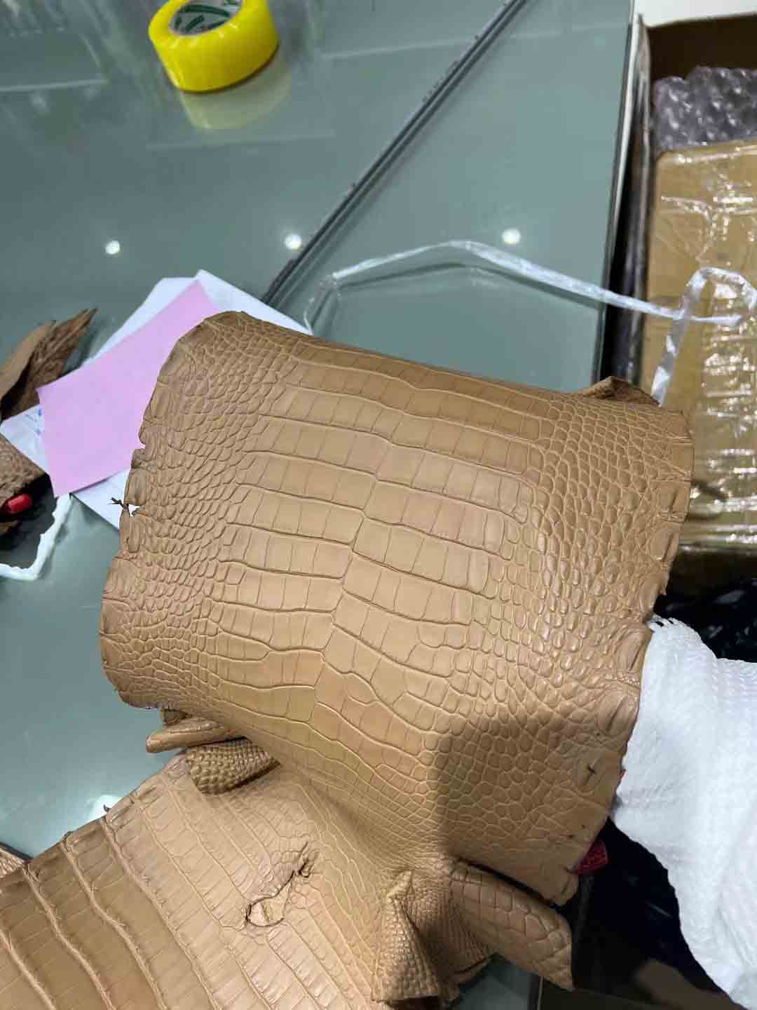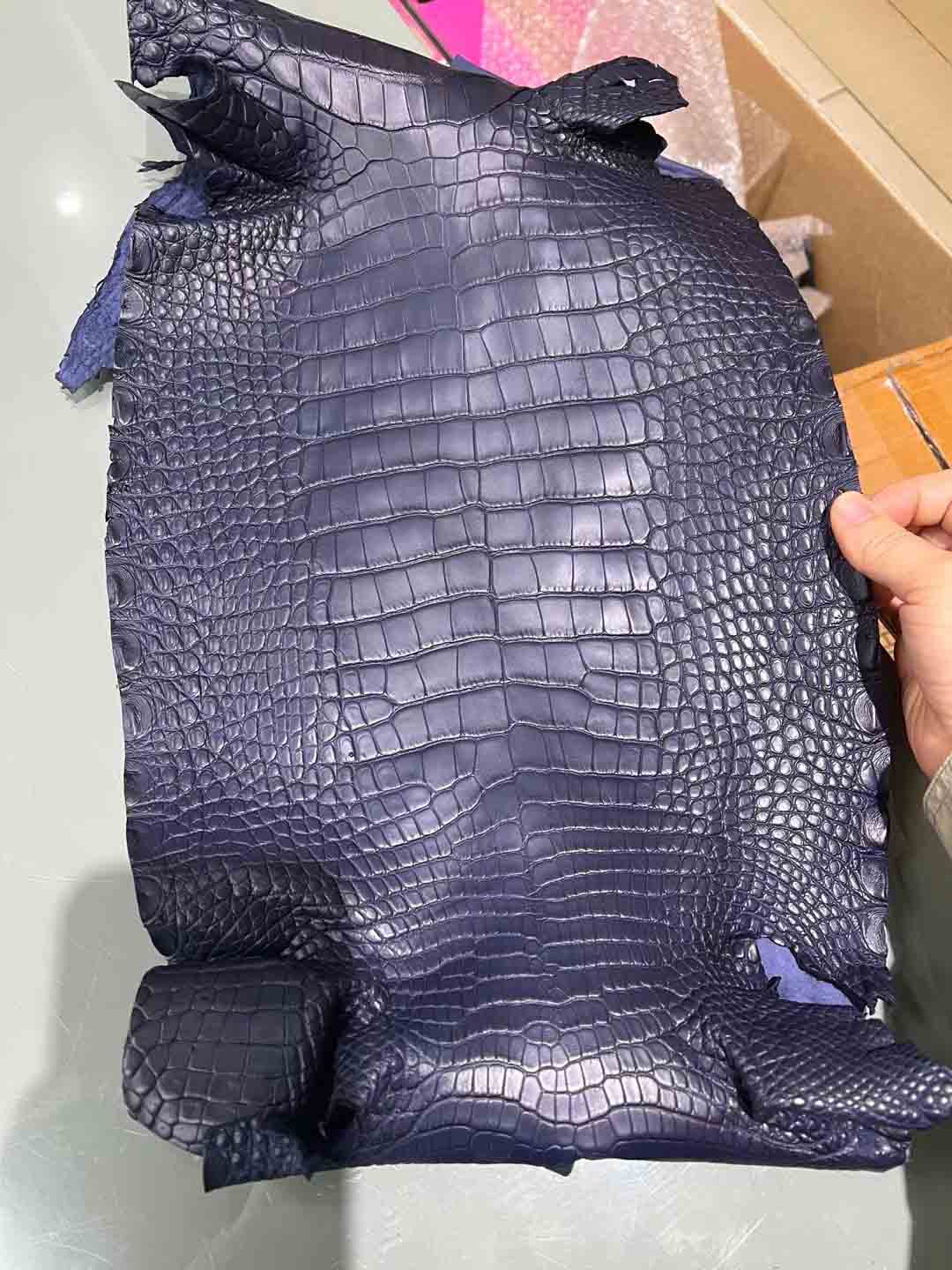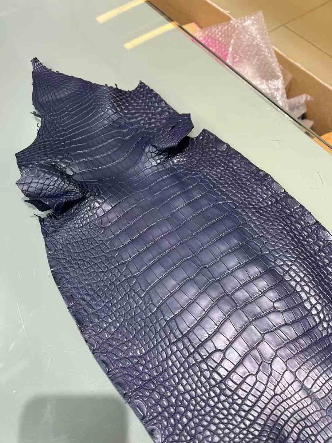 美洲鳄鱼皮 品种介绍:美洲鳄是所有鳄鱼品种里,其天然纹理最为方正,纹理极少杂纹,大小最为合适的鳄鱼品种,因此也颇受奢侈品皮具品牌的青睐。