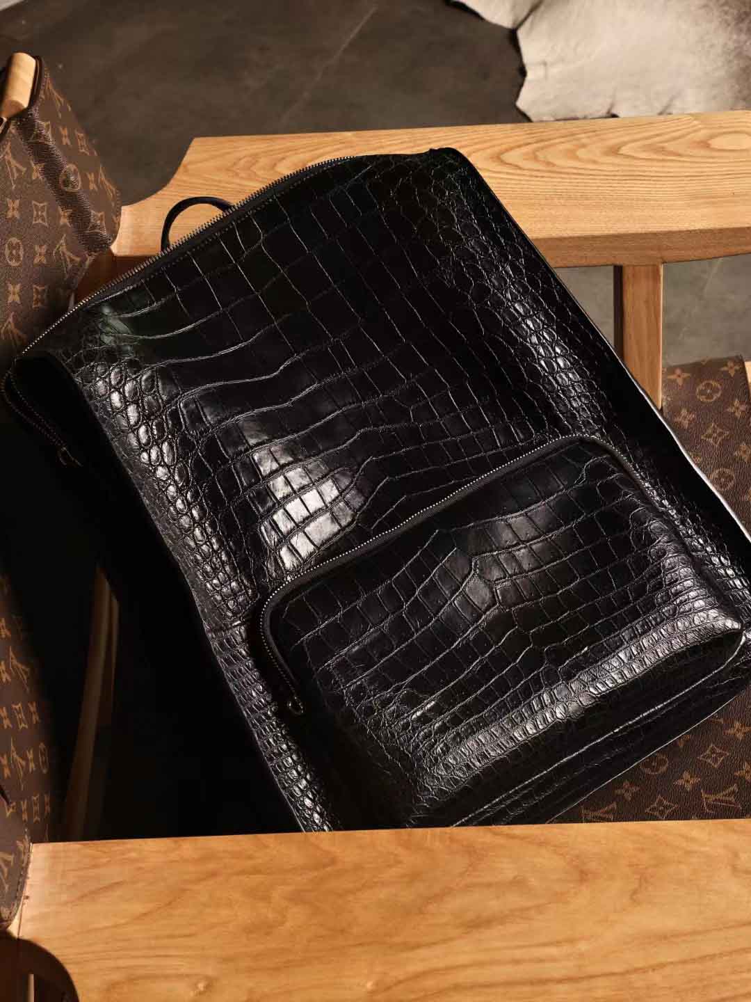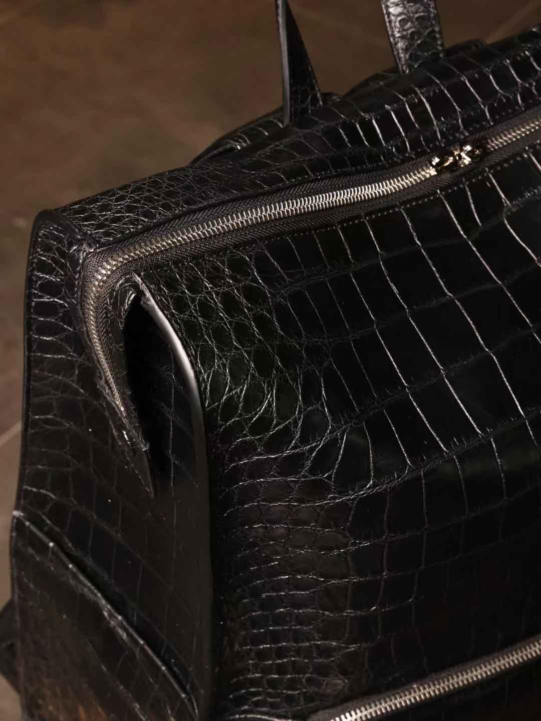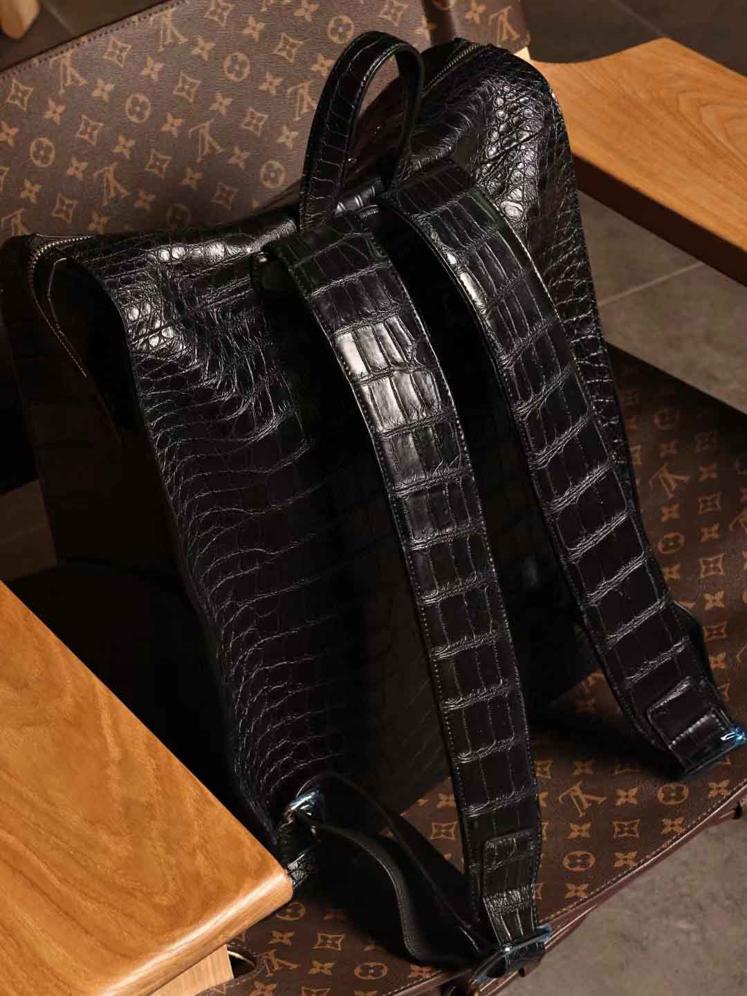 复古经典的鳄鱼皮双肩包 但也是能装挺多东西的~比小废包好多了,鳄鱼皮黑色油蜡皮光泽感十足然后也十分耐操。