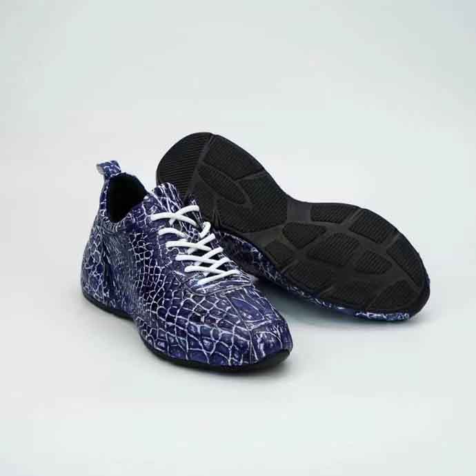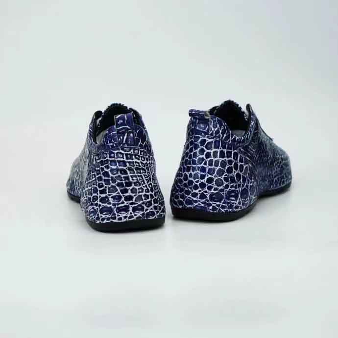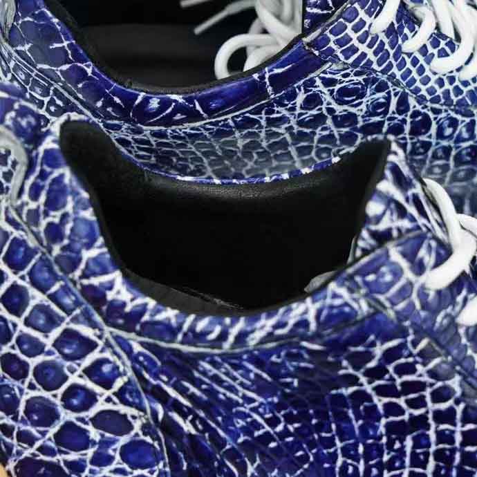 重现颜色自然蓝色鳄鱼皮擦色之美,使鳄鱼皮鞋子整体更加立体富有层次。