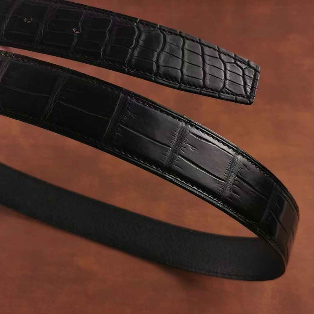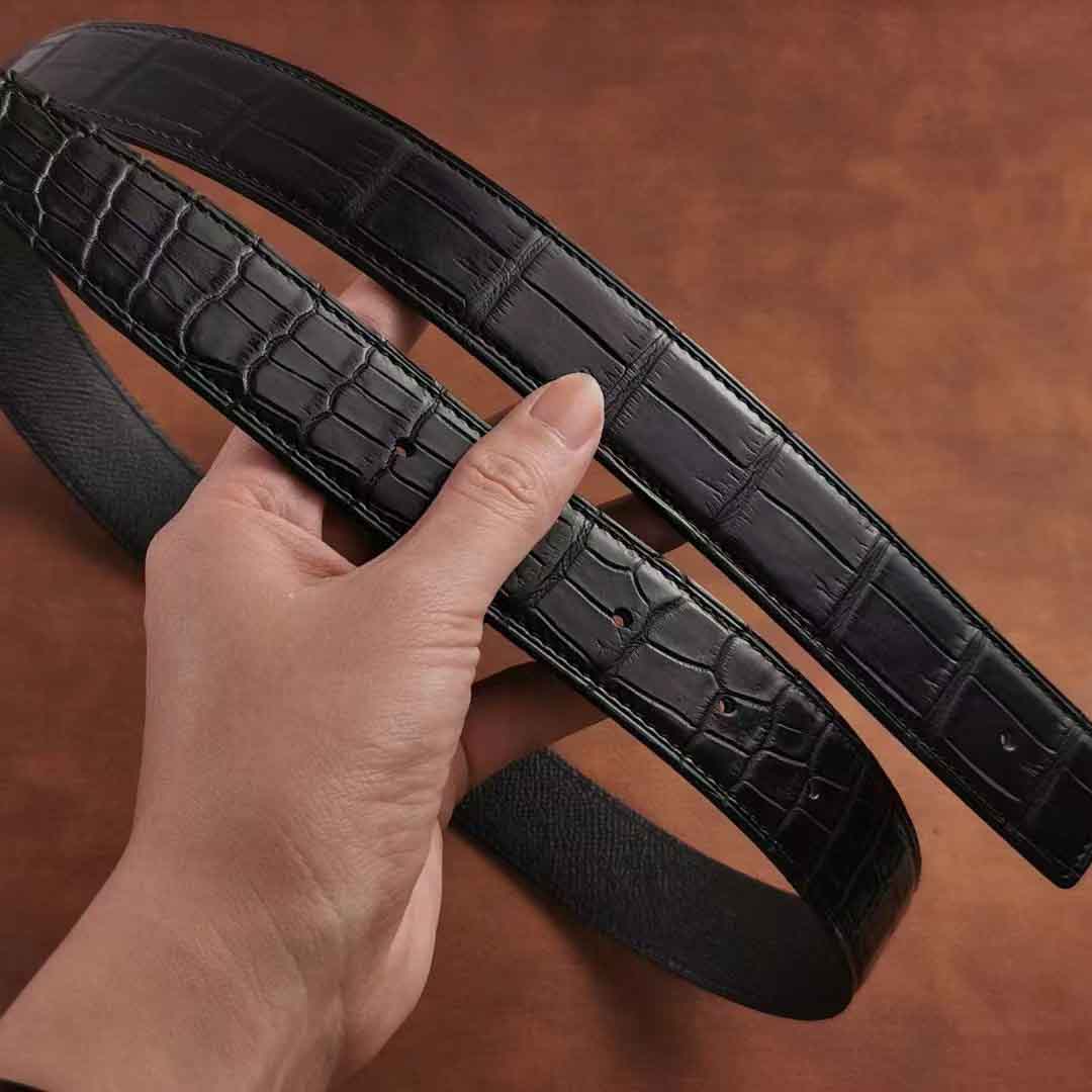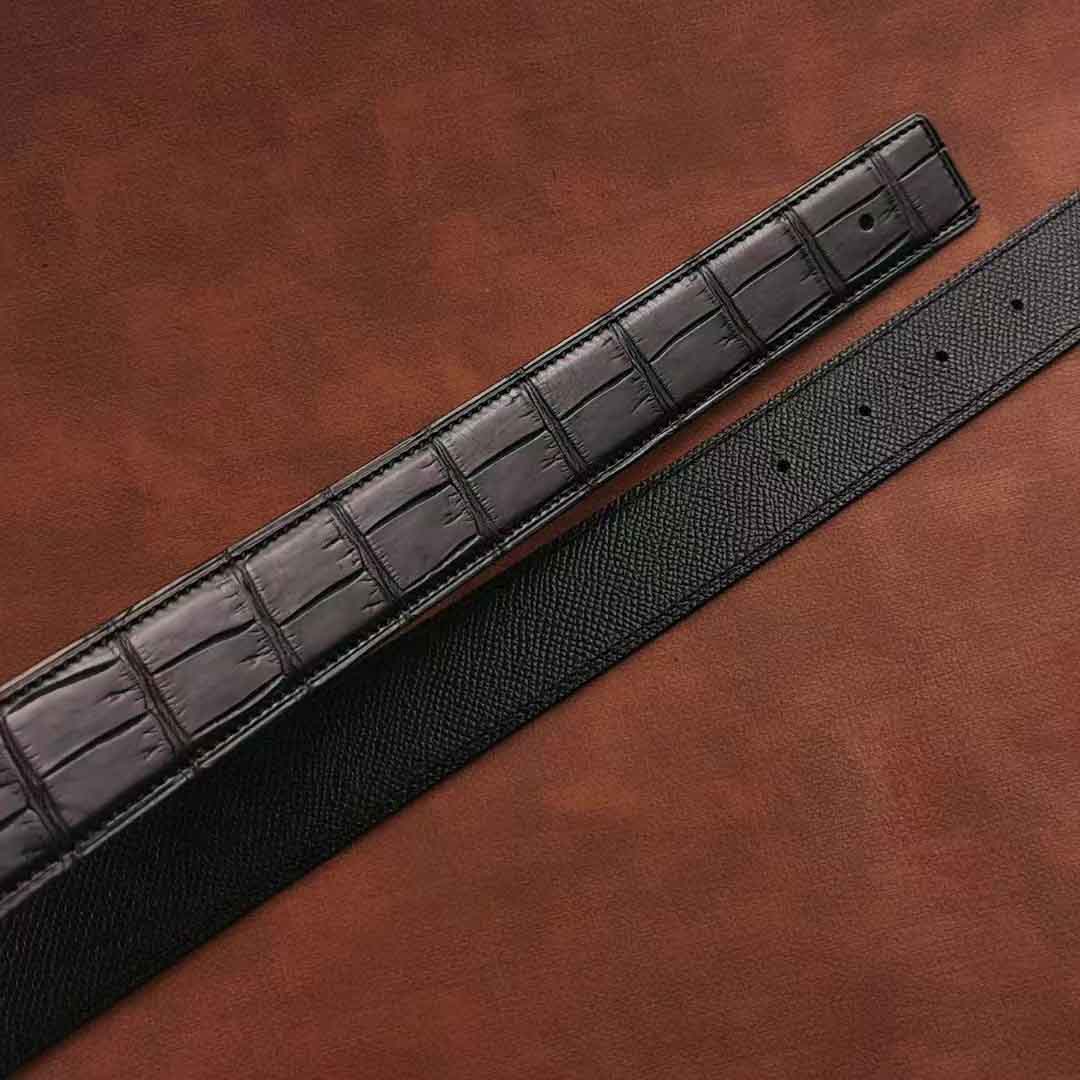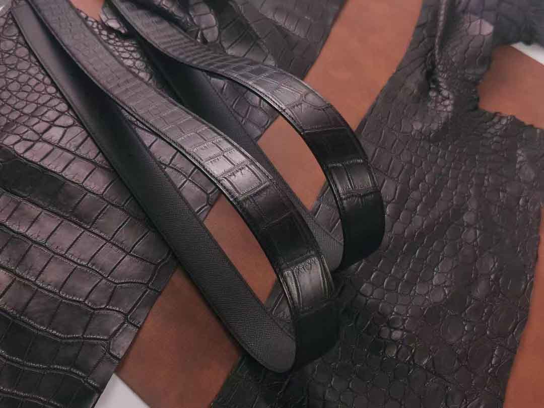 客供钨钢扣头,一次订做2条湾鳄腰带。客人选择纯水染的HCP湾鳄服装革,服装革鞣制工艺应该是最贵的工艺了,既要没有覆盖性喷涂保证柔软自然的皮面,还要很薄的同时保证韧性和手感。选用意大利臀背植鞣作夹芯,底皮选用HAAS工厂的Epsom小牛皮,都是偏硬挺的皮料,皮带做好整体非常有弹性和密度。