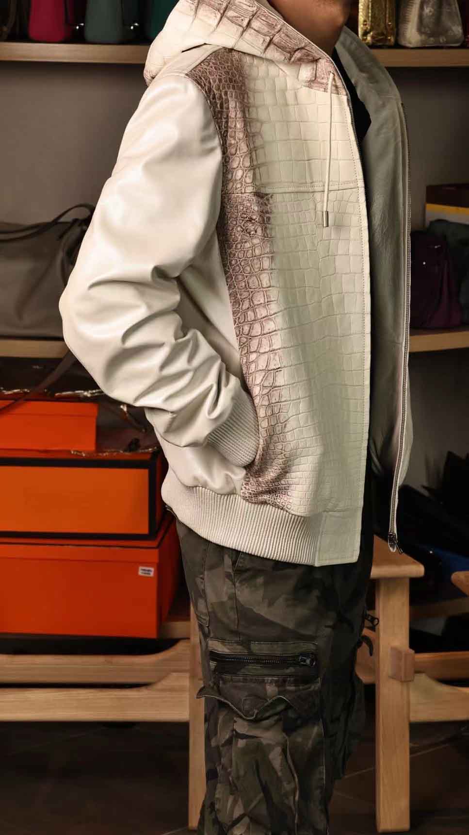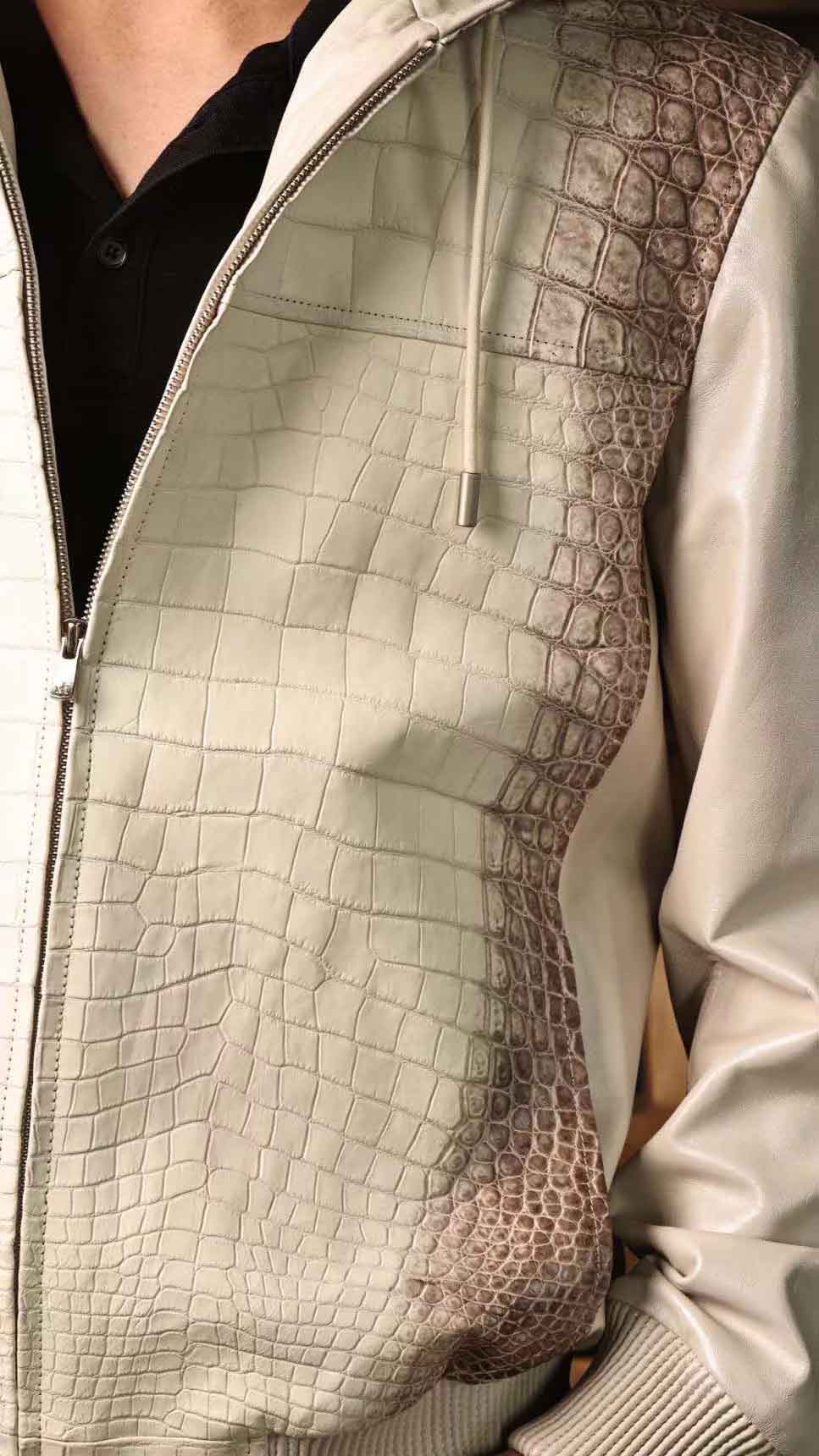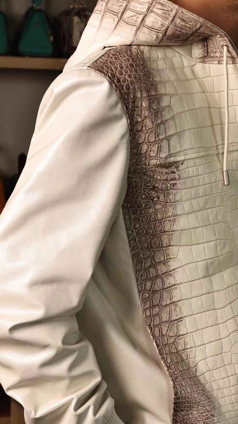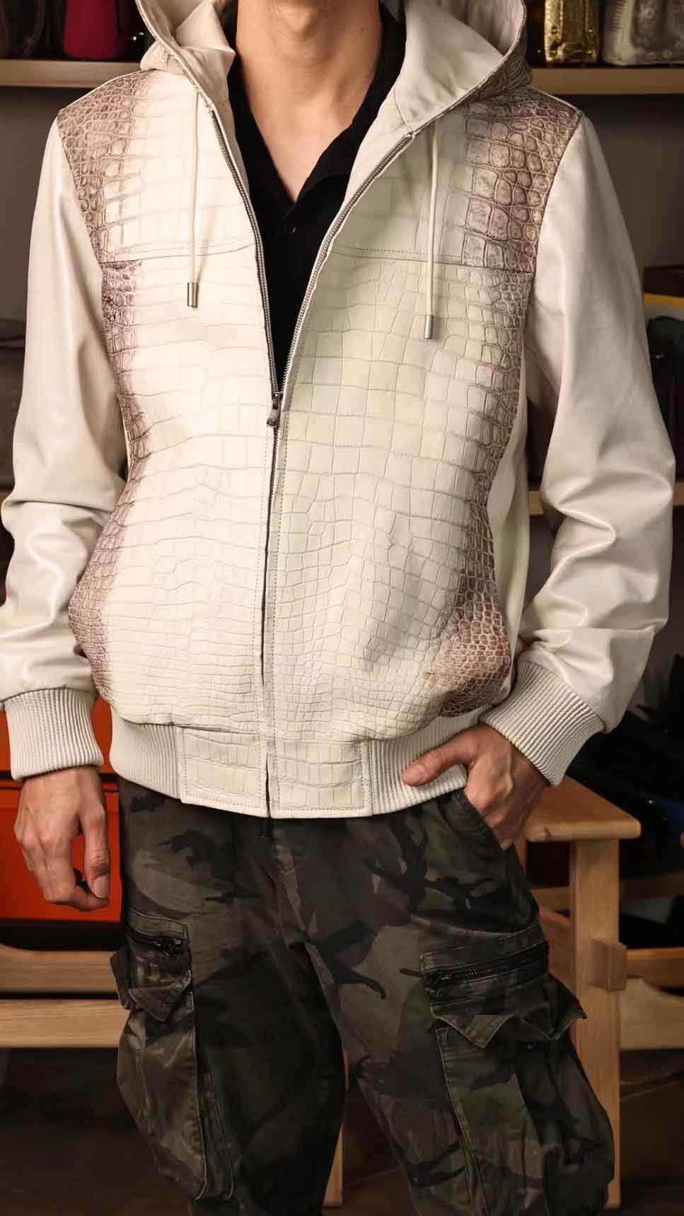 连体帽款半鳄鱼皮衣,喜马拉雅鳄鱼配珠光绵羊皮,超柔软特殊效果,暂时只有现货,没办法定制(喜马拉雅鳄鱼皮可以定,珠光羊皮暂时没有了),50/52码现货。