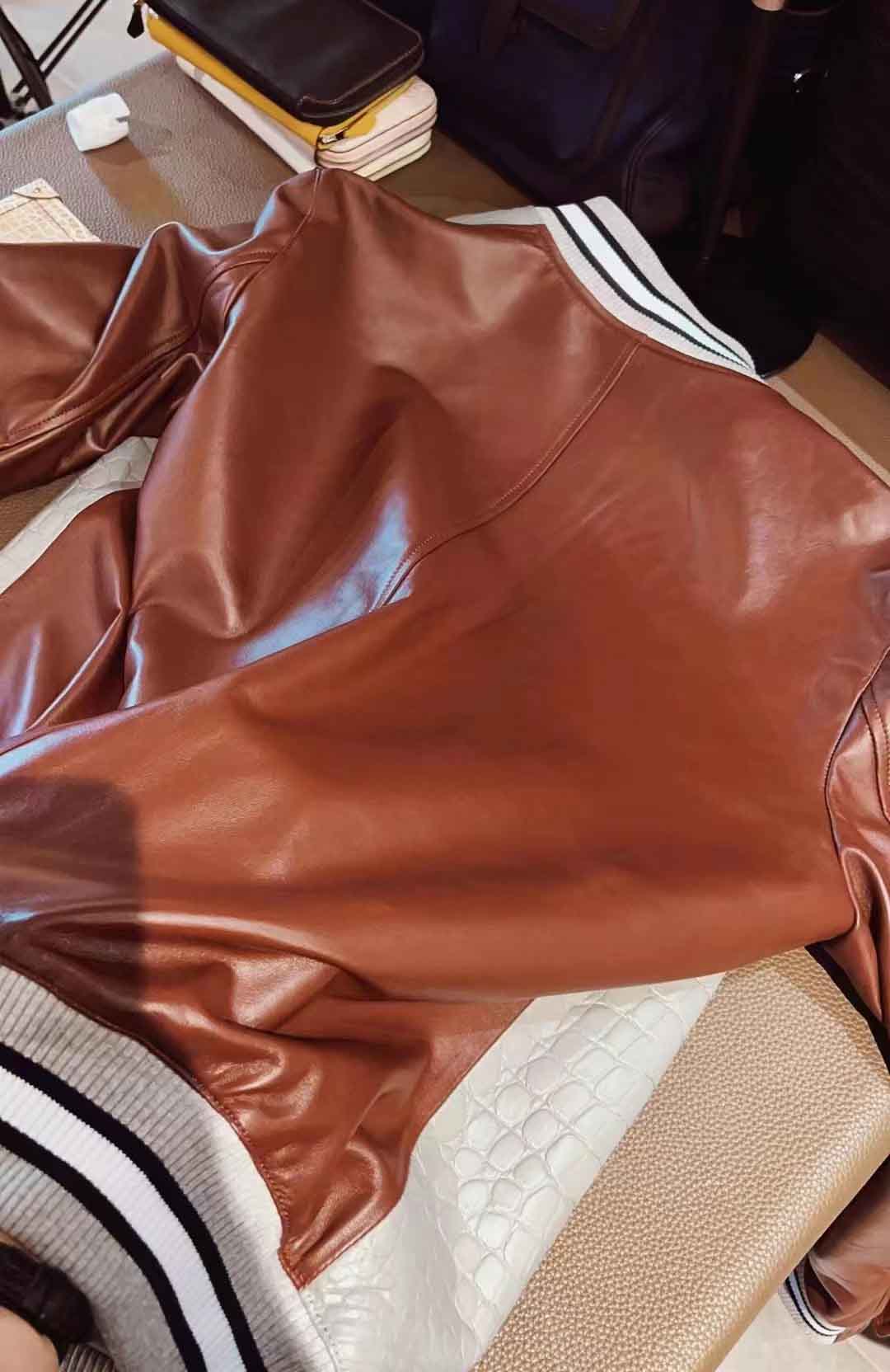 拼皮棒球服,斑鸠灰鳄鱼拼酒红色绵羊皮,52码实拍现货,新鲜出炉。预约订做其他颜色男女棒球服装微信联系 95506803