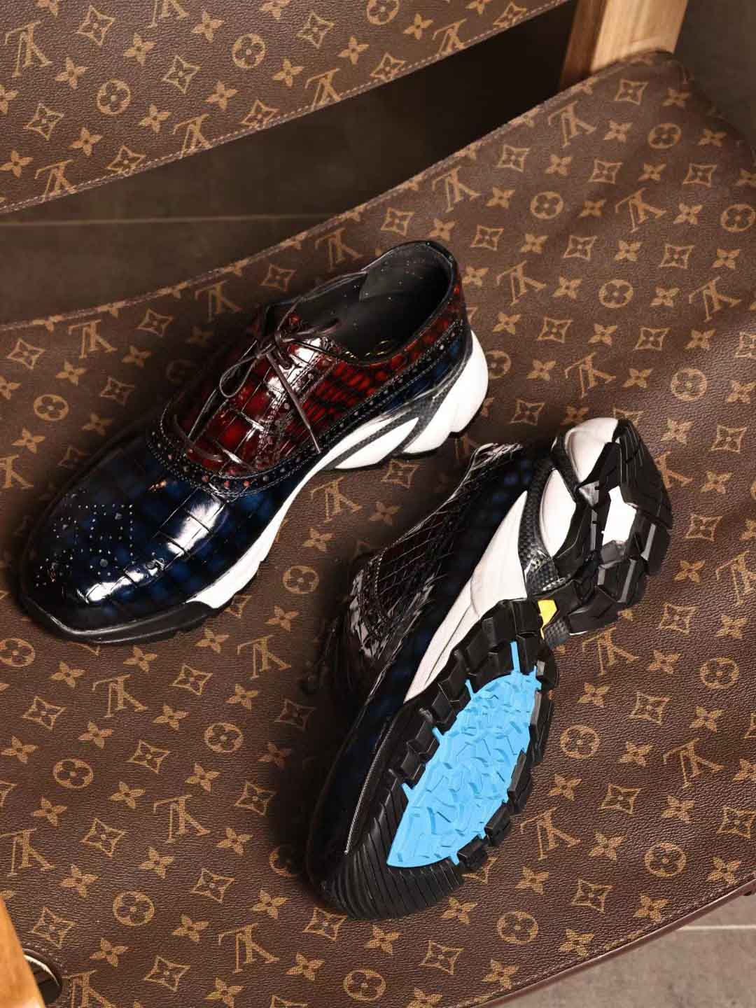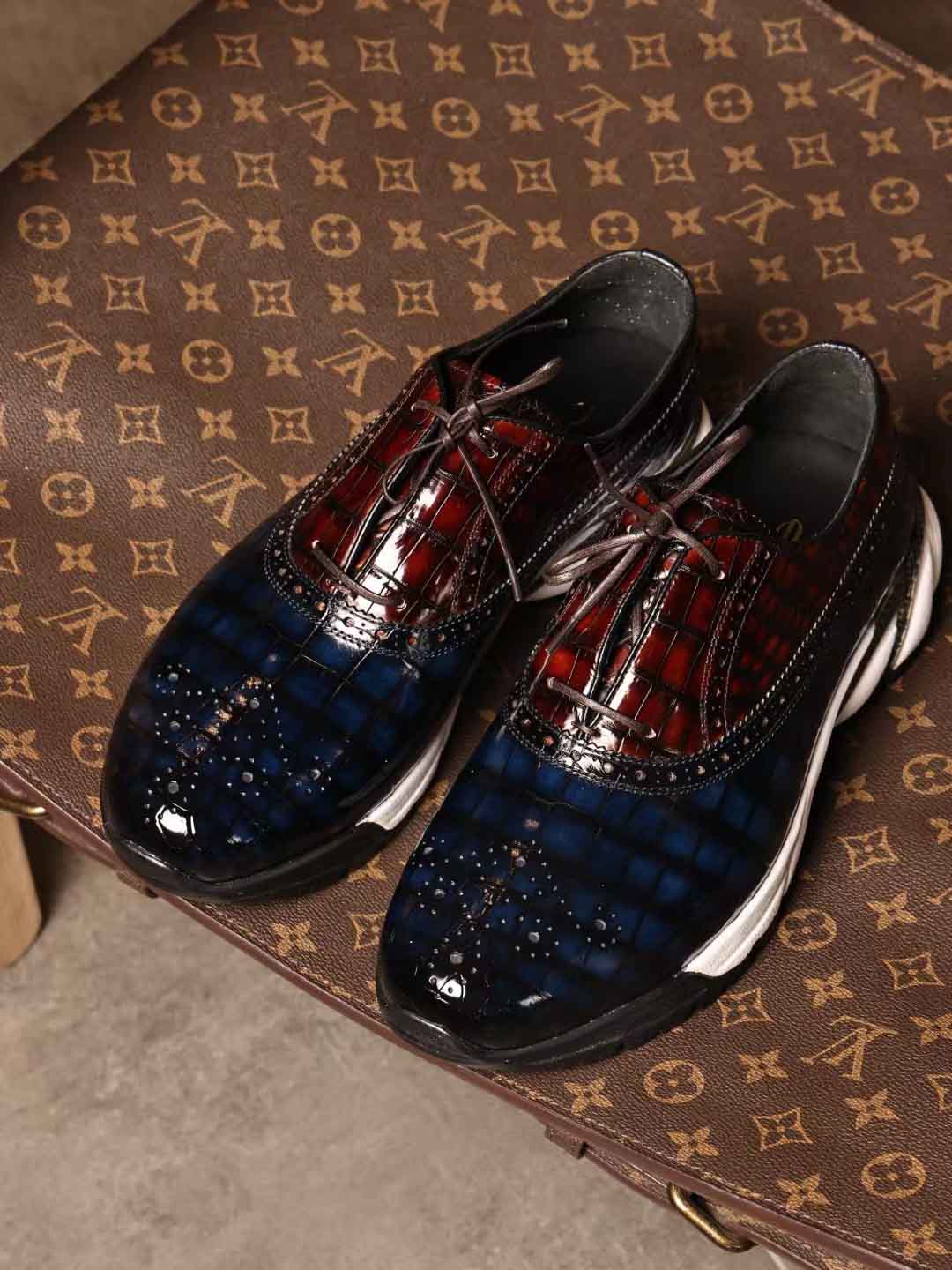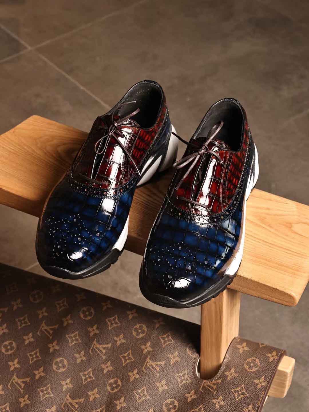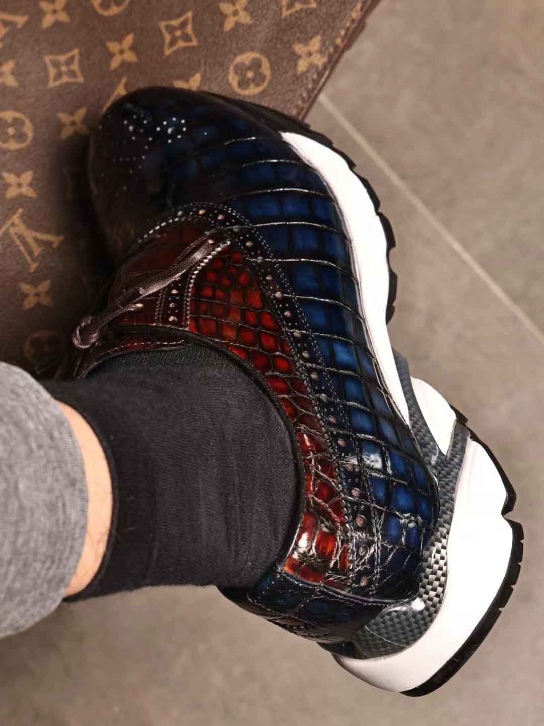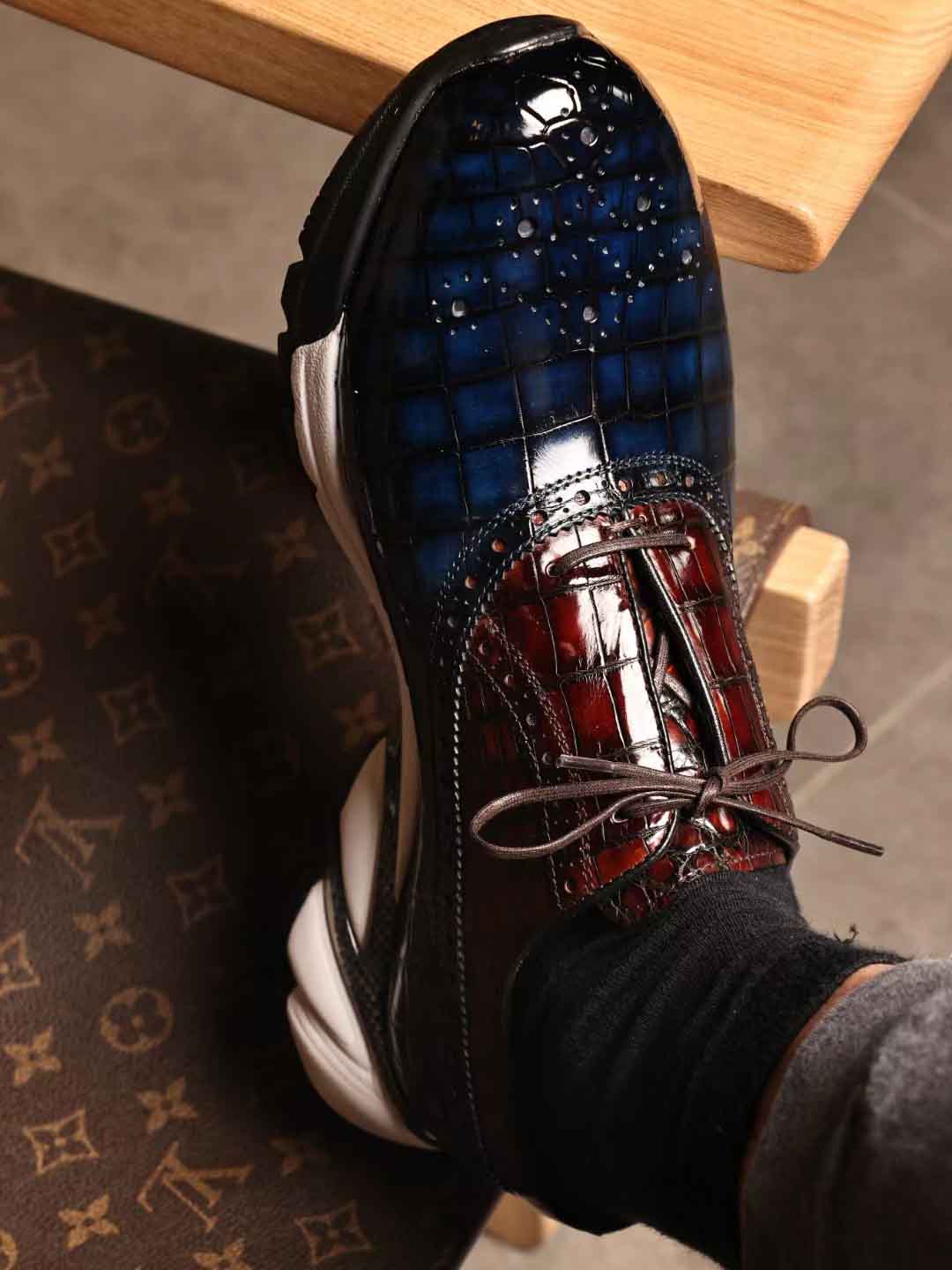 尼罗鳄擦色鳄鱼皮鞋,月白蓝拼胭脂红,客订出货。可以定制其他diy颜色的鳄鱼皮休闲鞋联系微信 95506803