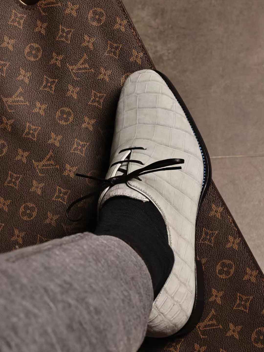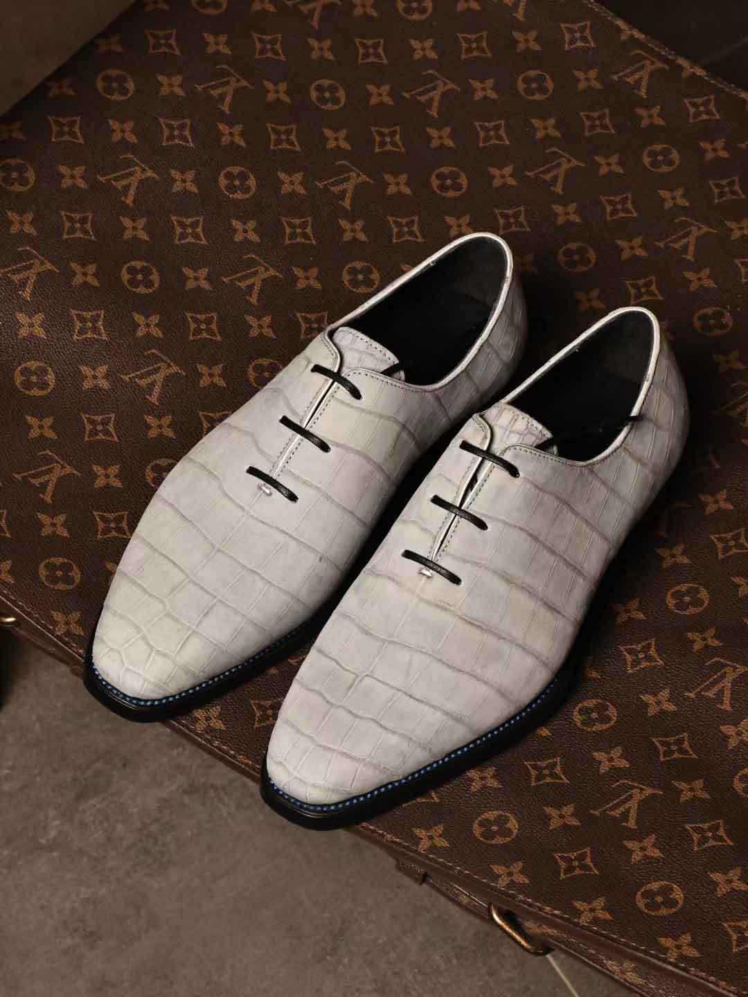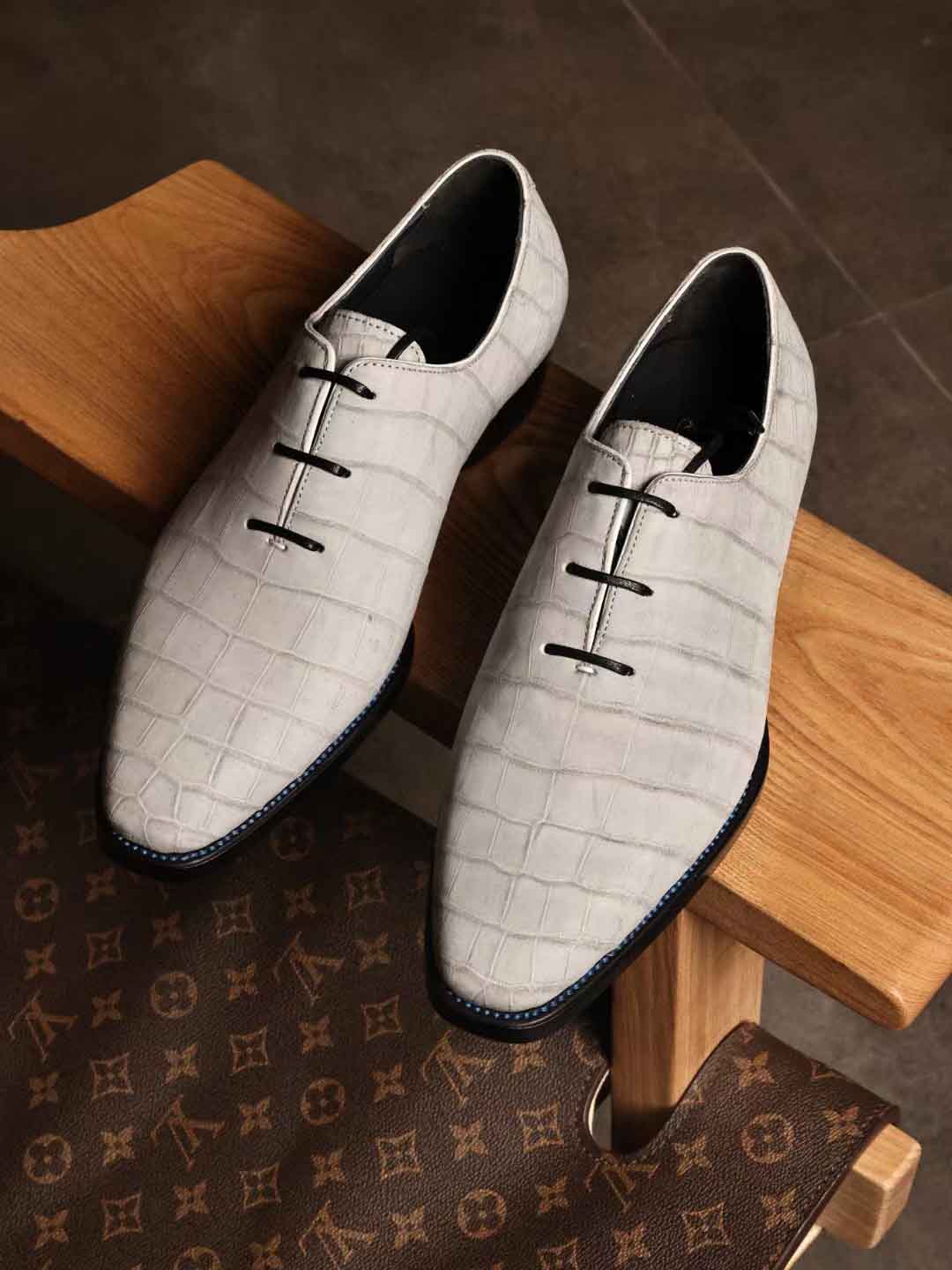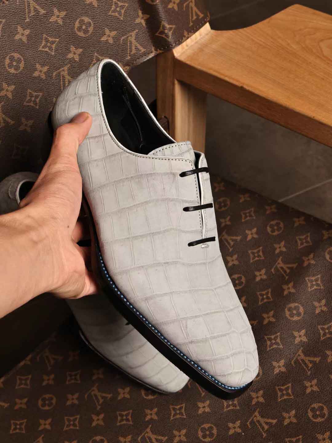 一片式牛津鞋,灰白色磨砂鳄鱼皮皮,客订出。可以预约订做其他颜色鳄鱼皮皮鞋,也可以定做鳄鱼皮其他款式皮鞋微信联系95506803