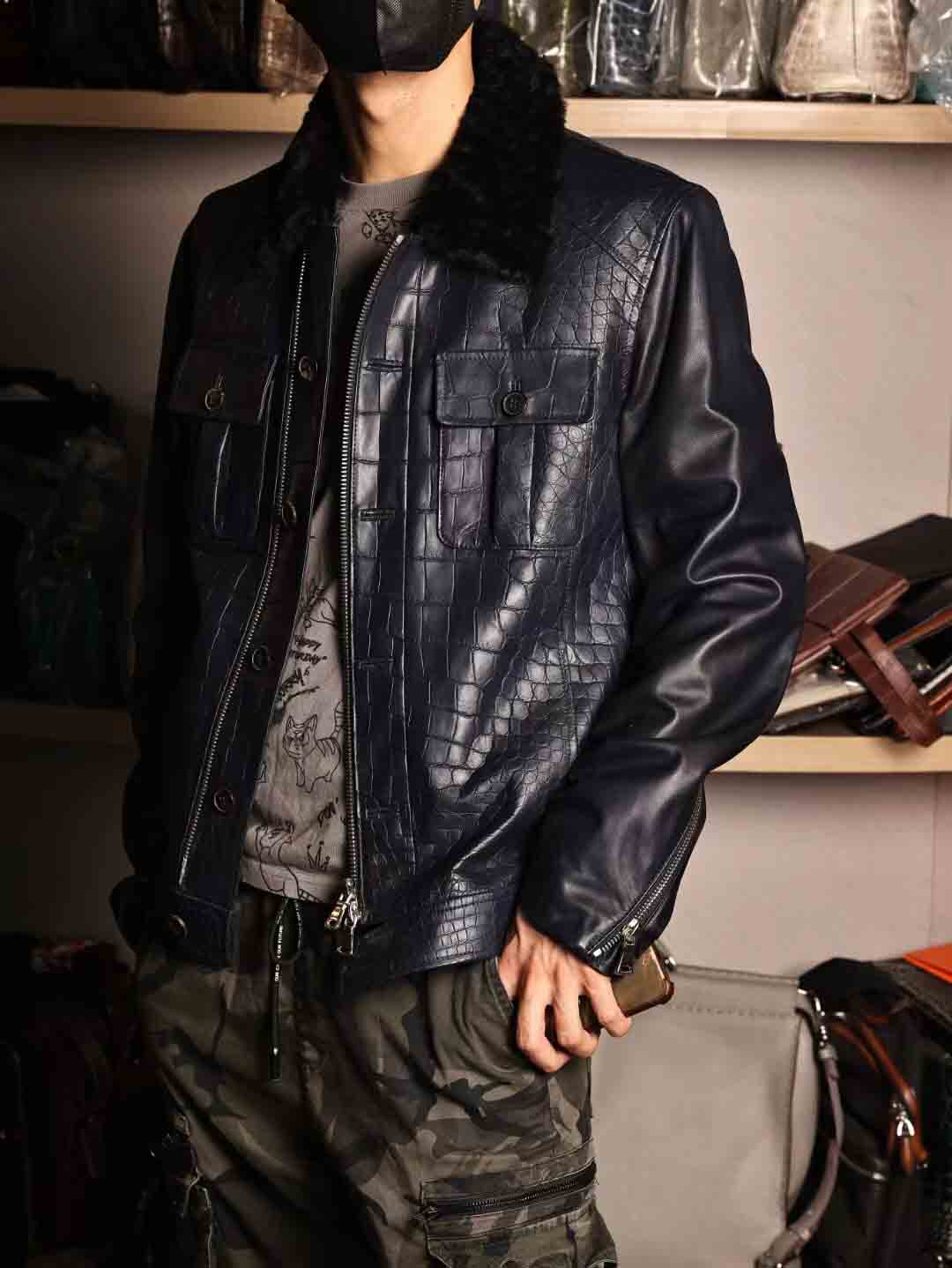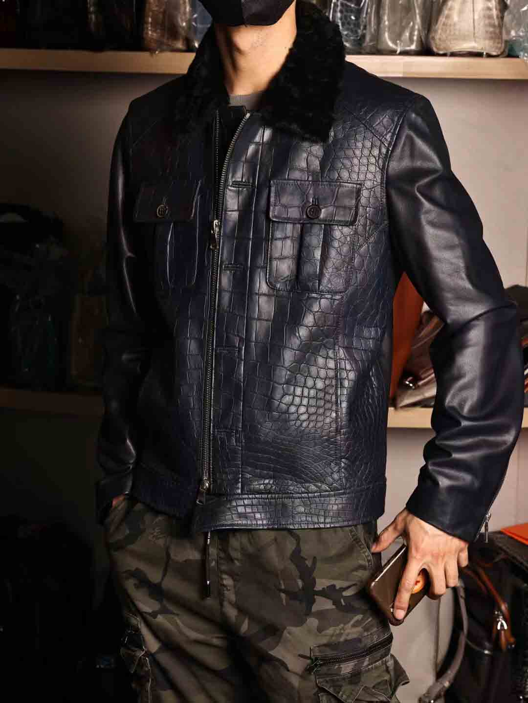 鳄鱼皮兔毛领中山装夹克,深蓝色哑光鳄鱼拼绵羊皮,舒适度一流,50码实拍。个性化定制鳄鱼皮短款皮衣订做厂家微信联系 95506803