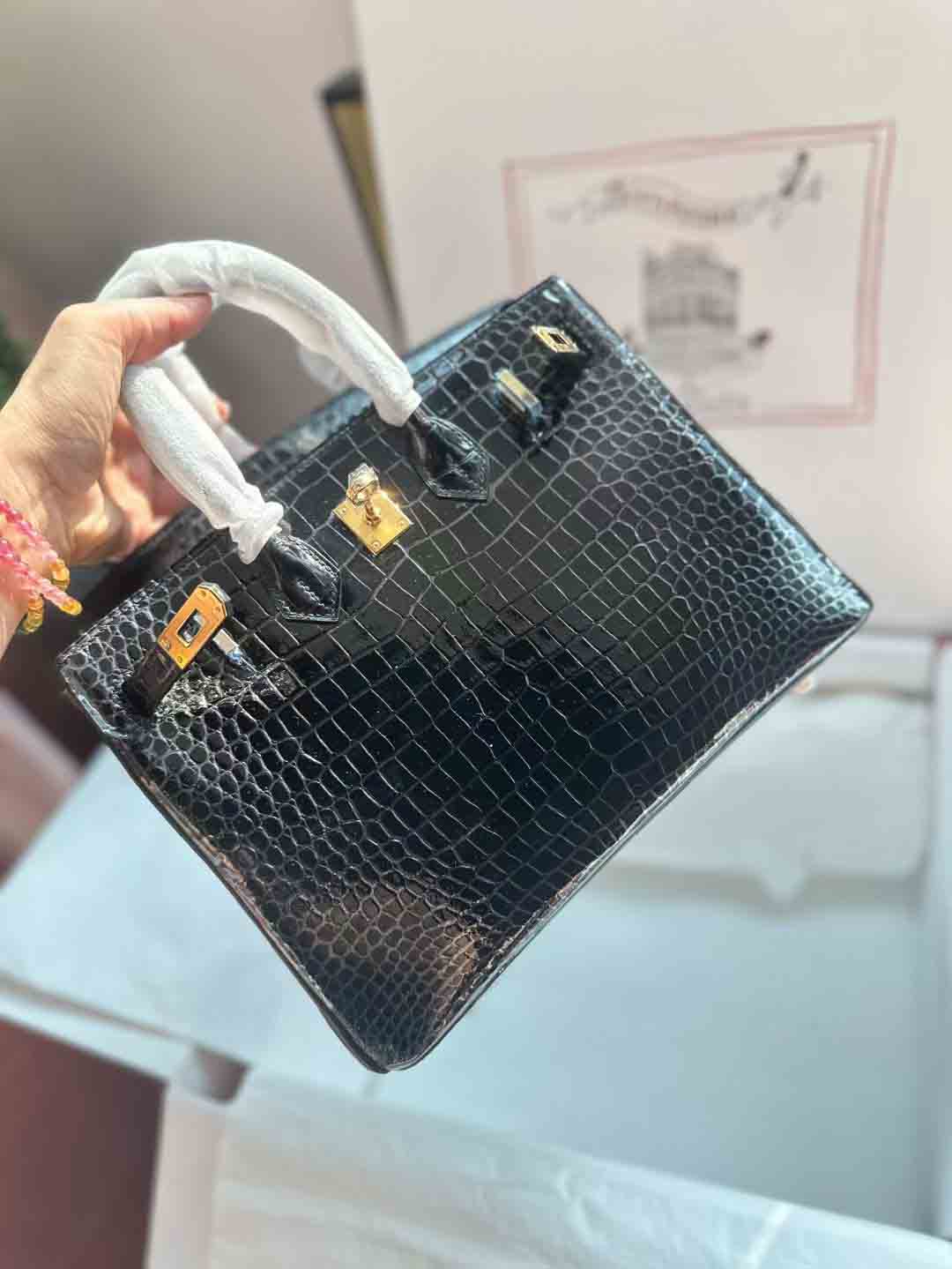 法国湾鳄无涂雾面纯手手提包,选用三张黑色亚光湾鳄鳄鱼皮,制作大号的夫人包。2023新款潮时尚手提单肩女包高级感洋气。