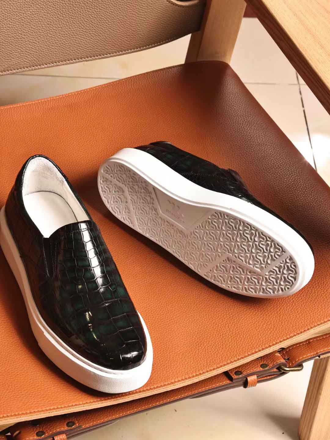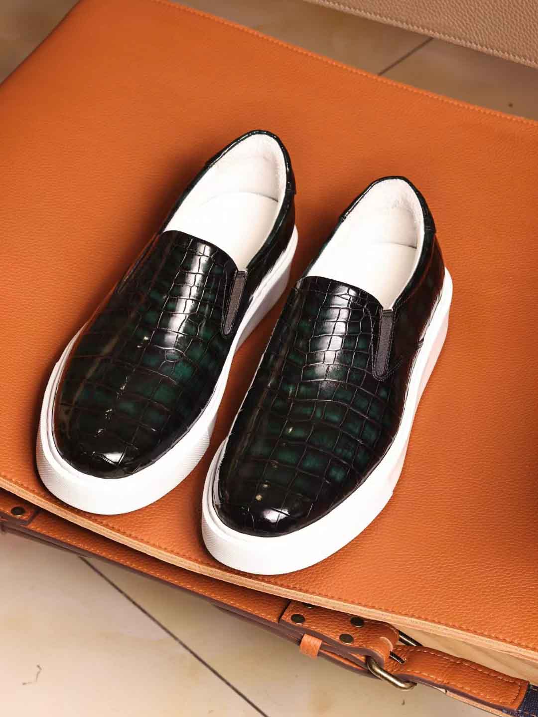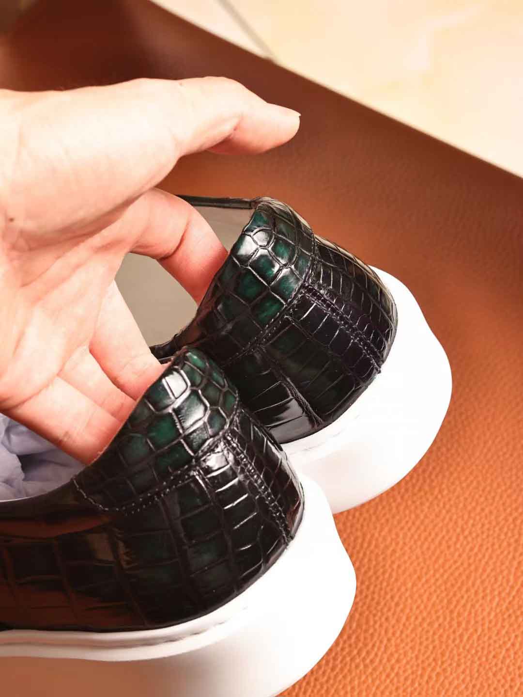 鳄鱼皮绿色皮鞋表面材质会比运动鞋更加高档,因此搭配也可以更显高级感。手工定制 专注提供皮鞋定制服务。半定制是用我们的脚型去套现有的鞋型,那么脚模定制就是完全照着我们的脚做一双只符合个人脚型的鞋。