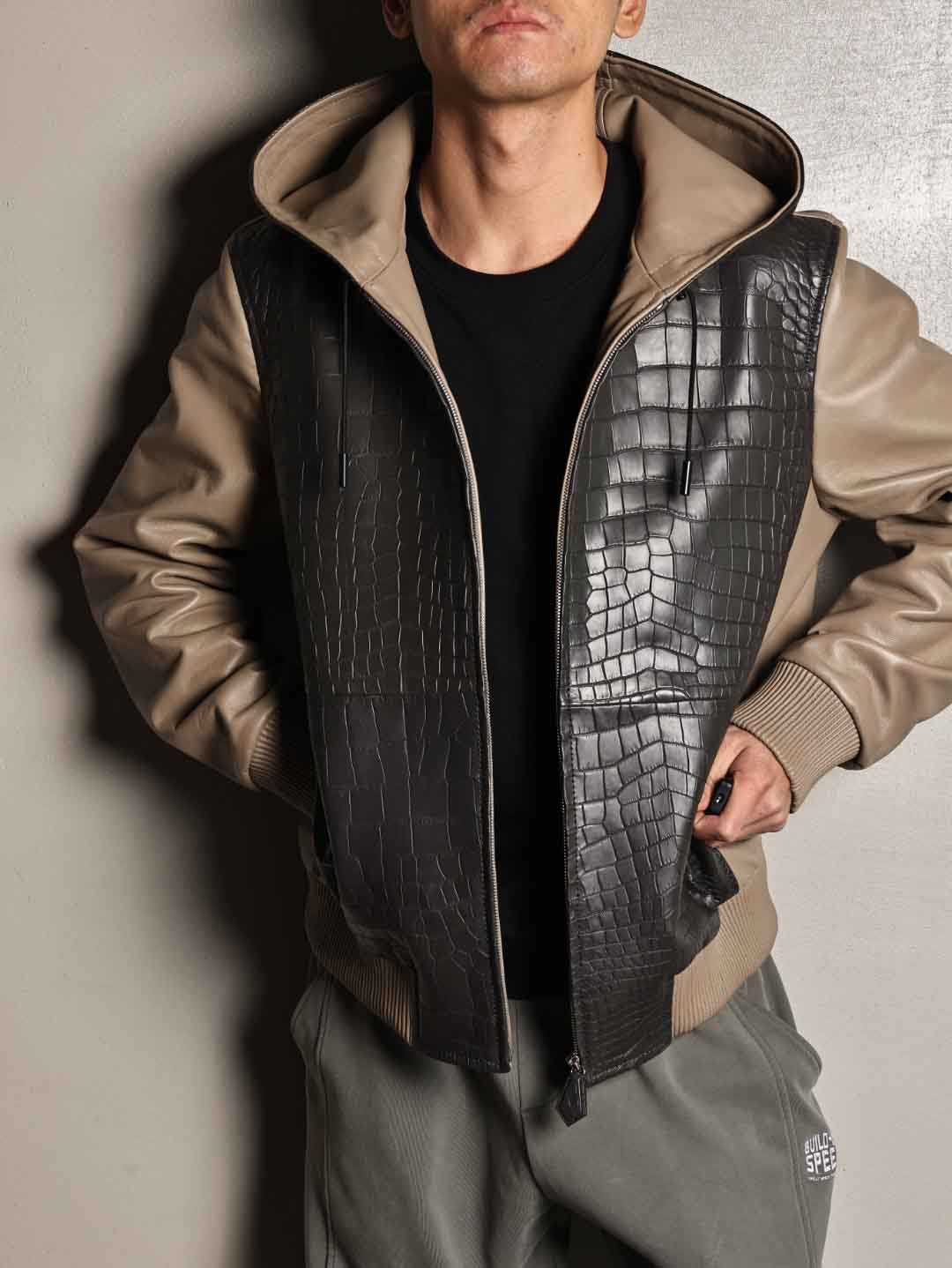 拼鳄连体帽夹克,深灰鳄鱼拼大象灰羊皮,客订出。鳄鱼皮衣服定做厂家 95506803