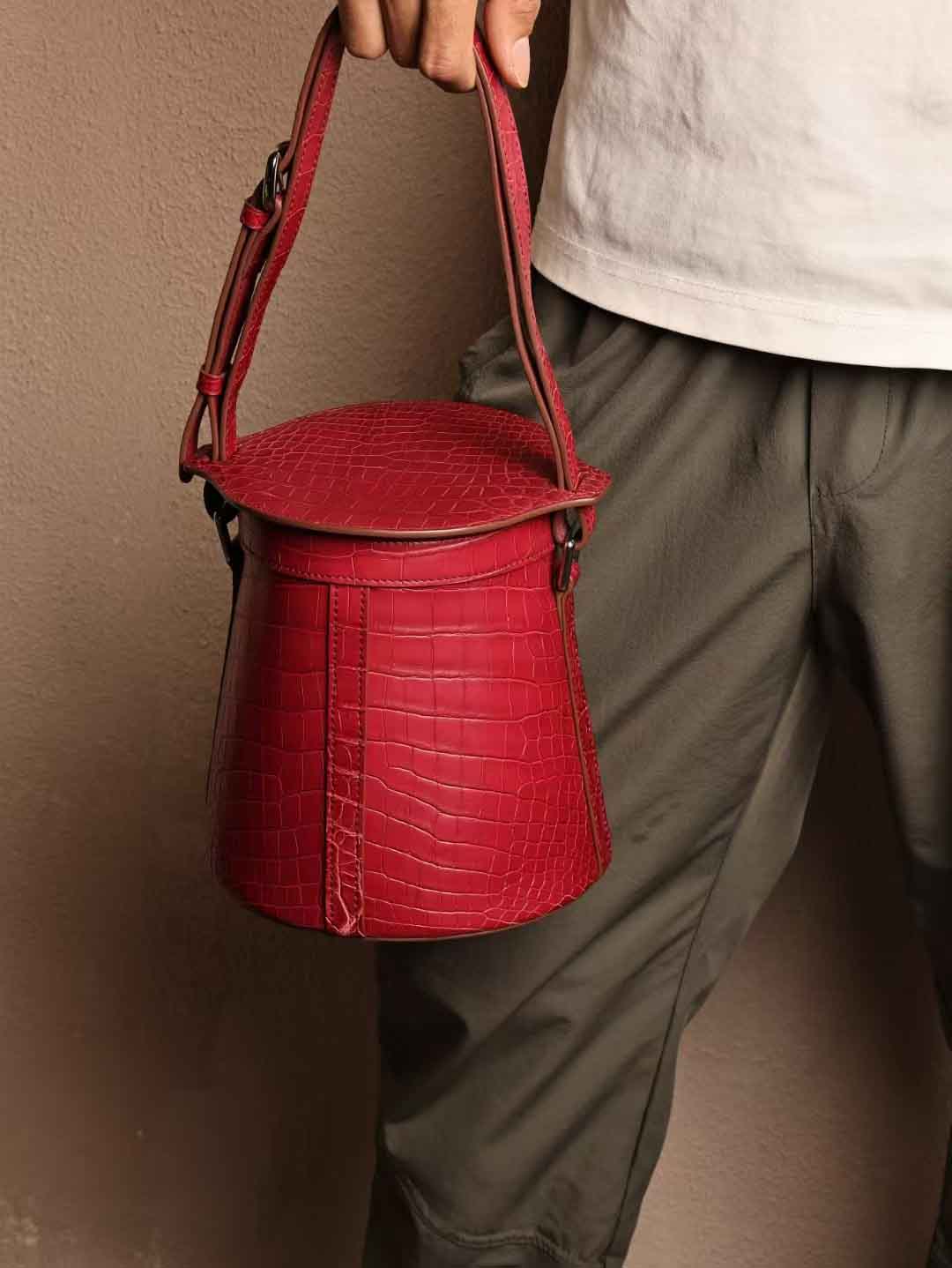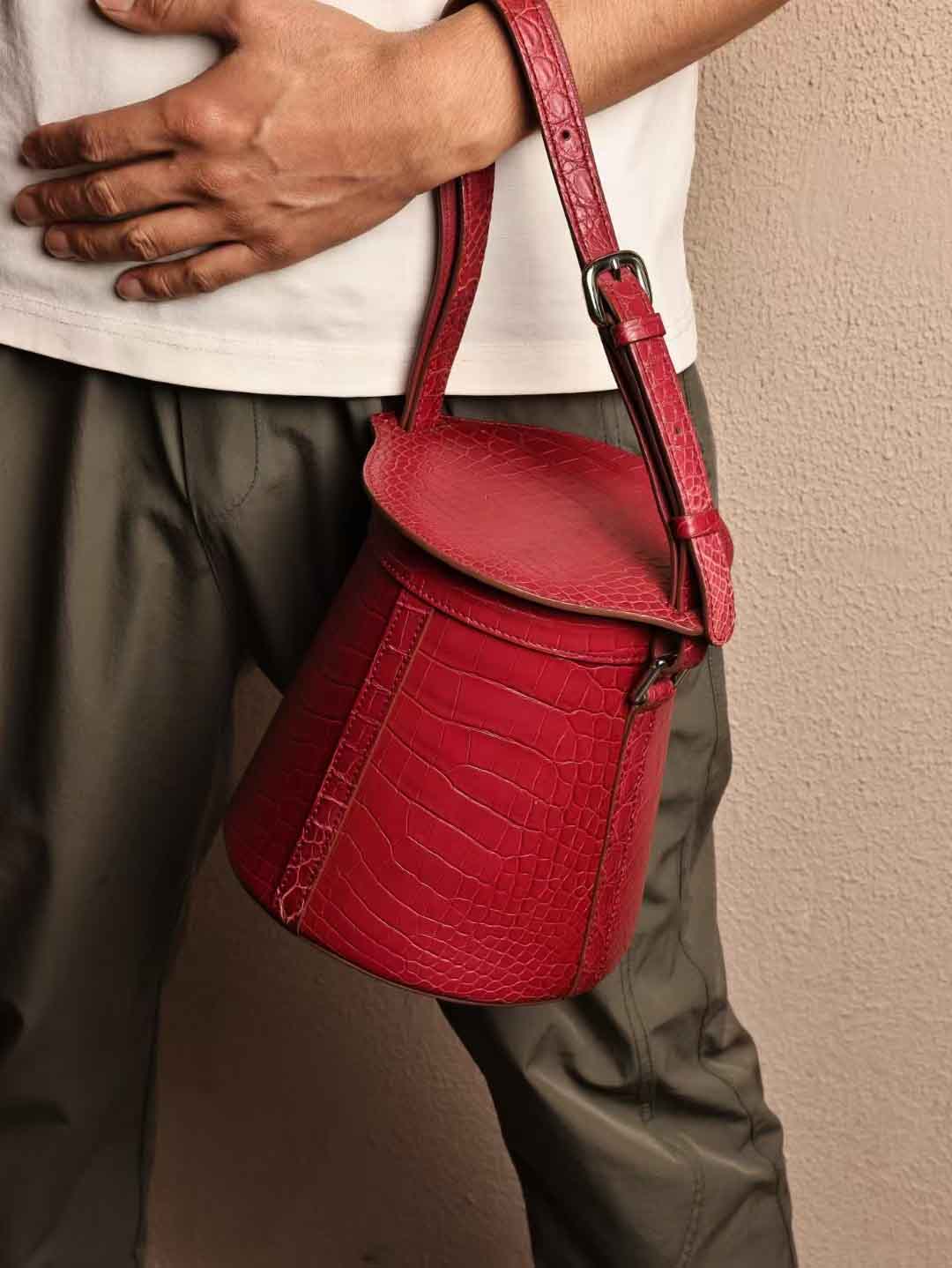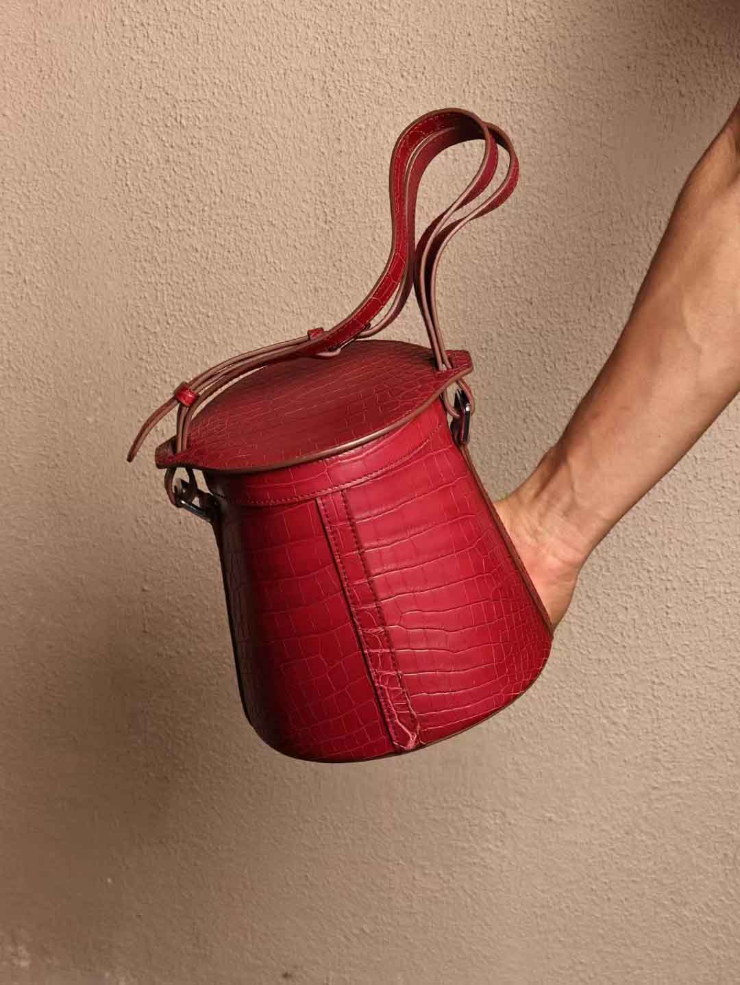 鱼篓包,酒红色哑光水染鳄鱼皮,区别于传统包型的设计,实拍现货。
