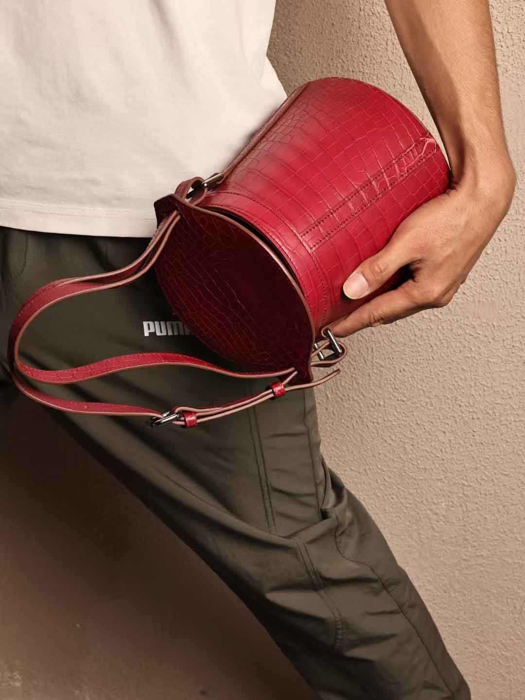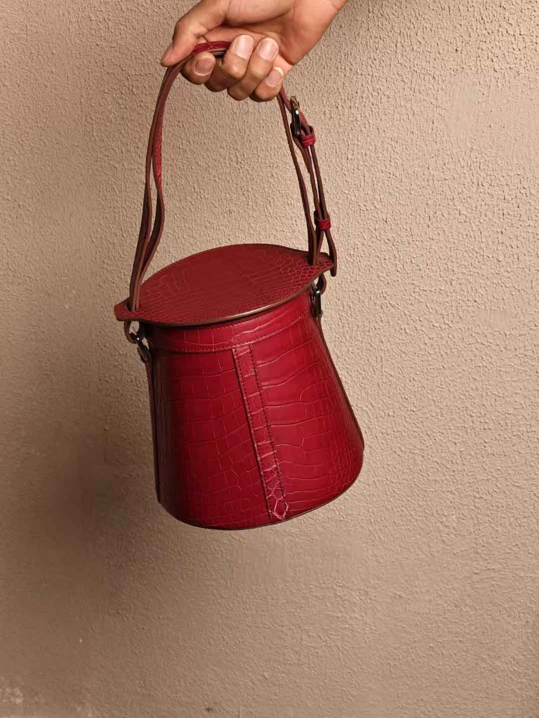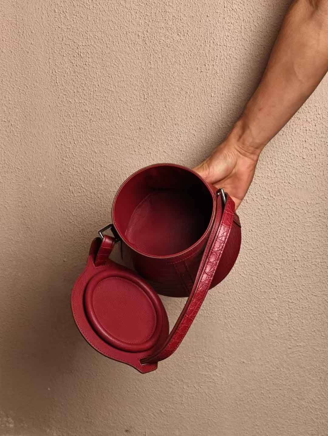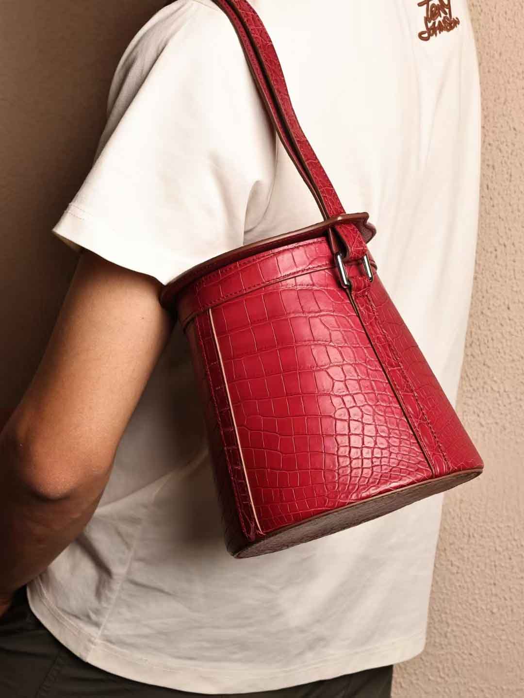 鱼篓包,酒红色哑光水染鳄鱼皮,区别于传统包型的设计,实拍现货。