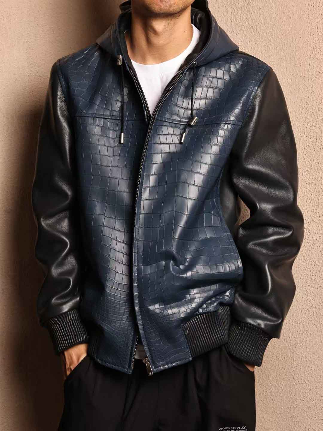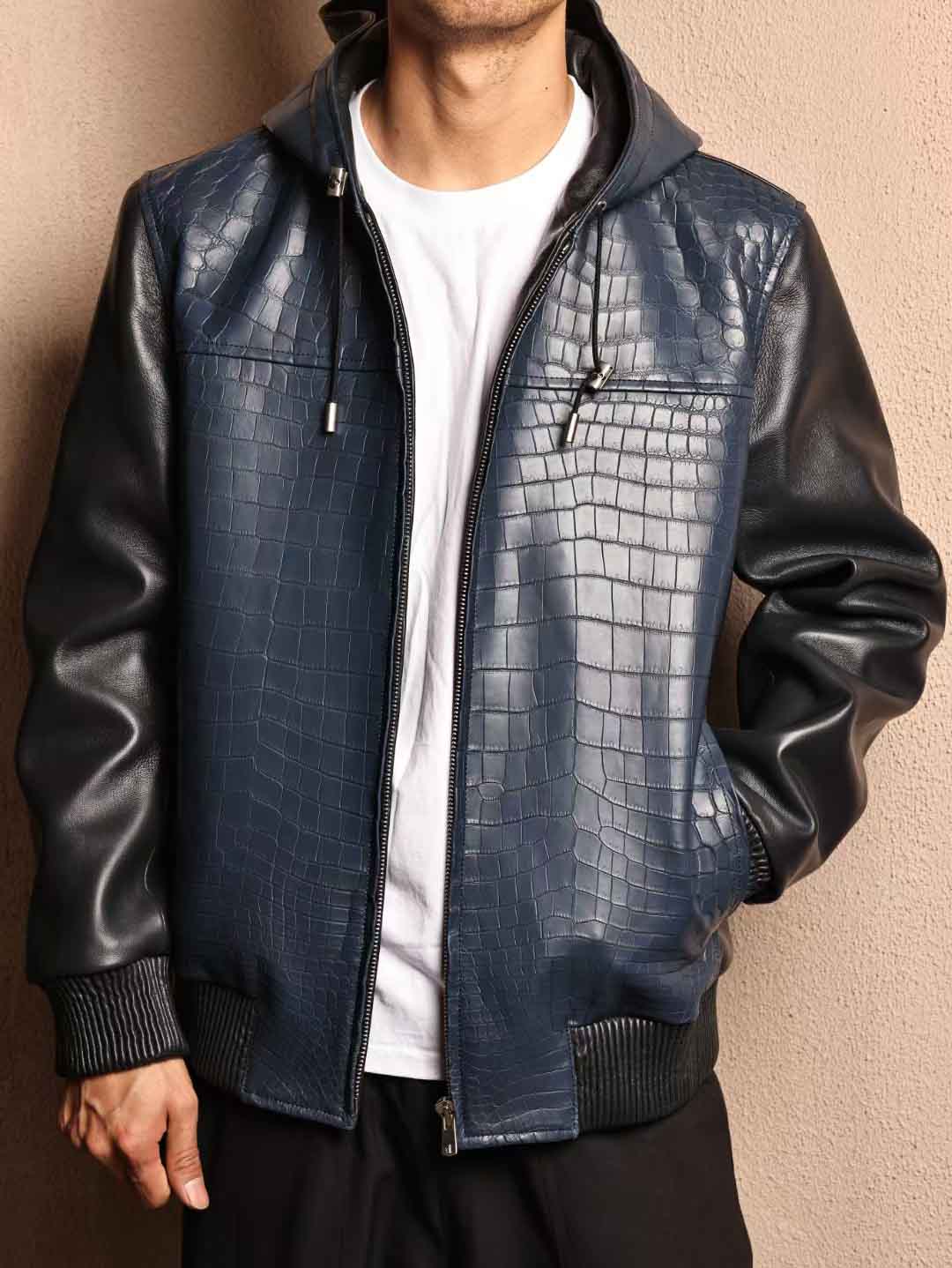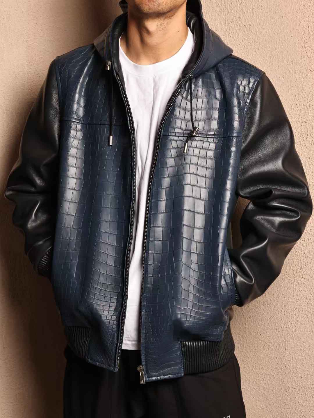 帽衫夹克,宝石蓝鳄鱼皮拼午夜蓝绵羊皮,52码实拍现货。