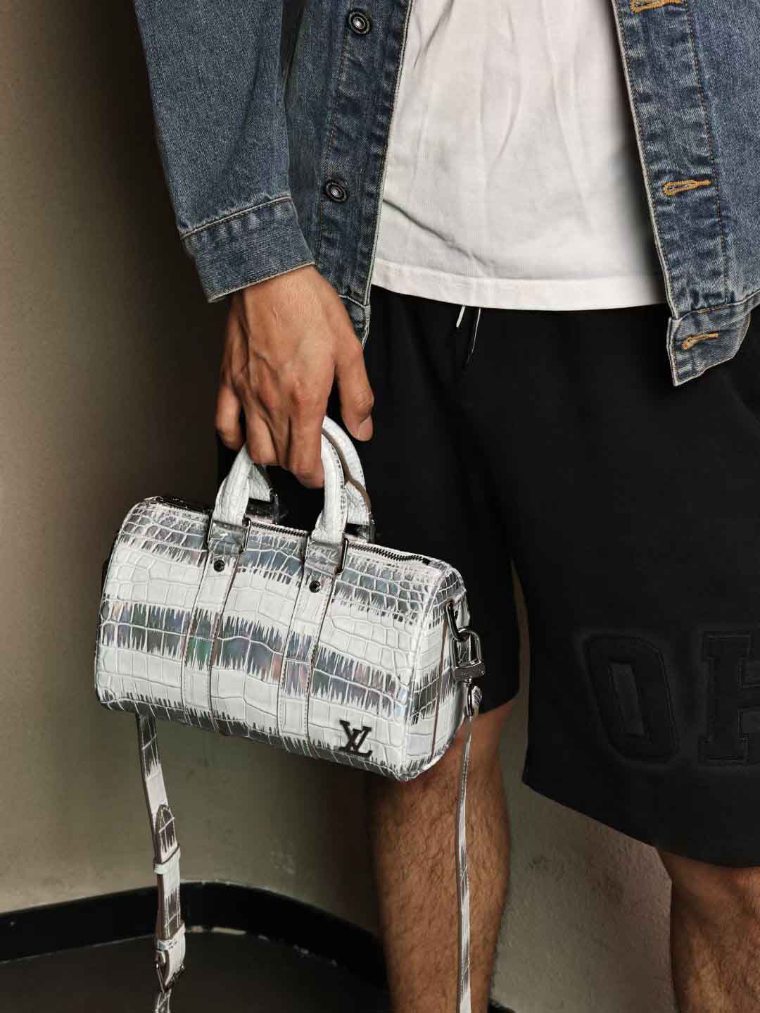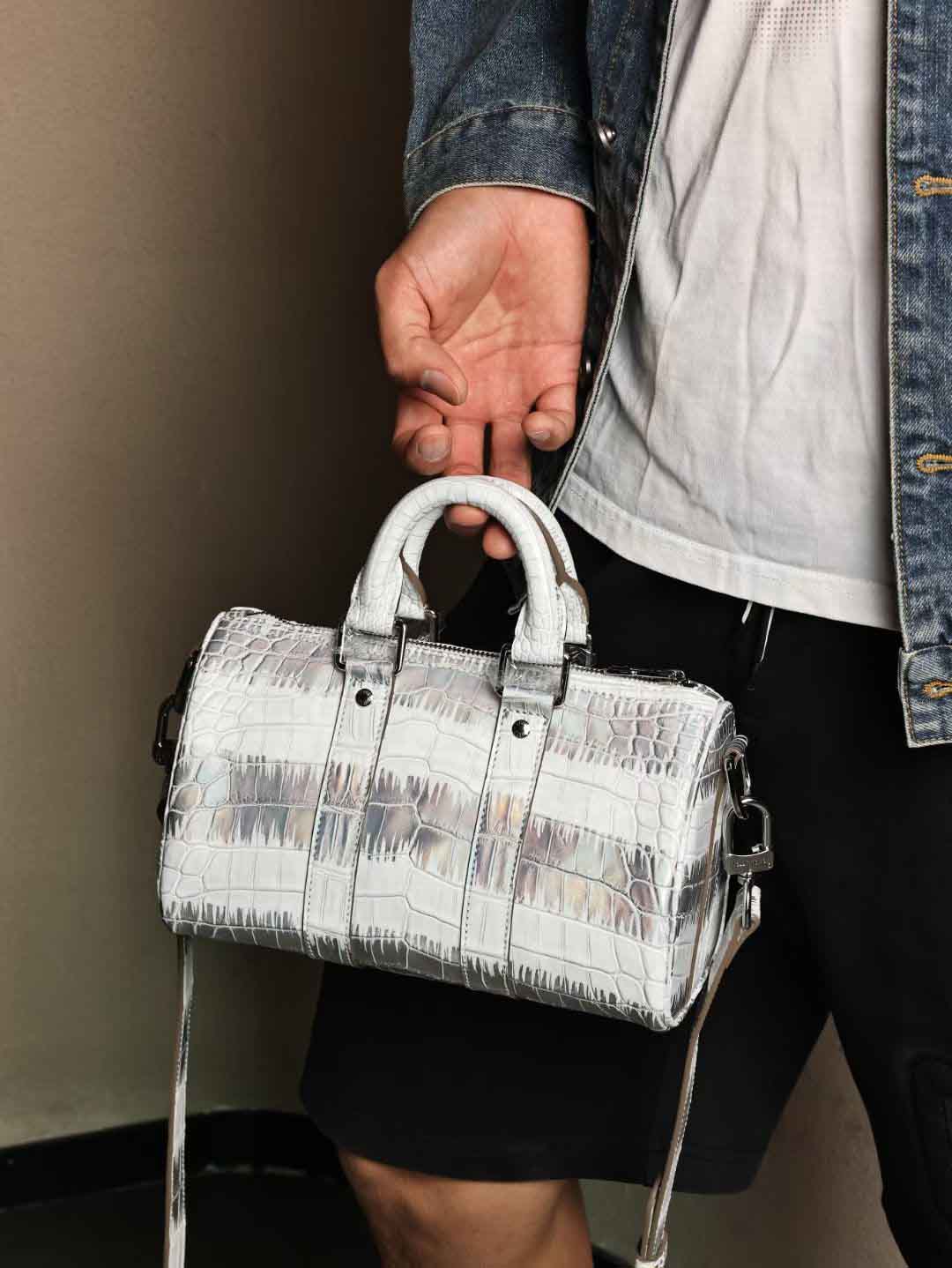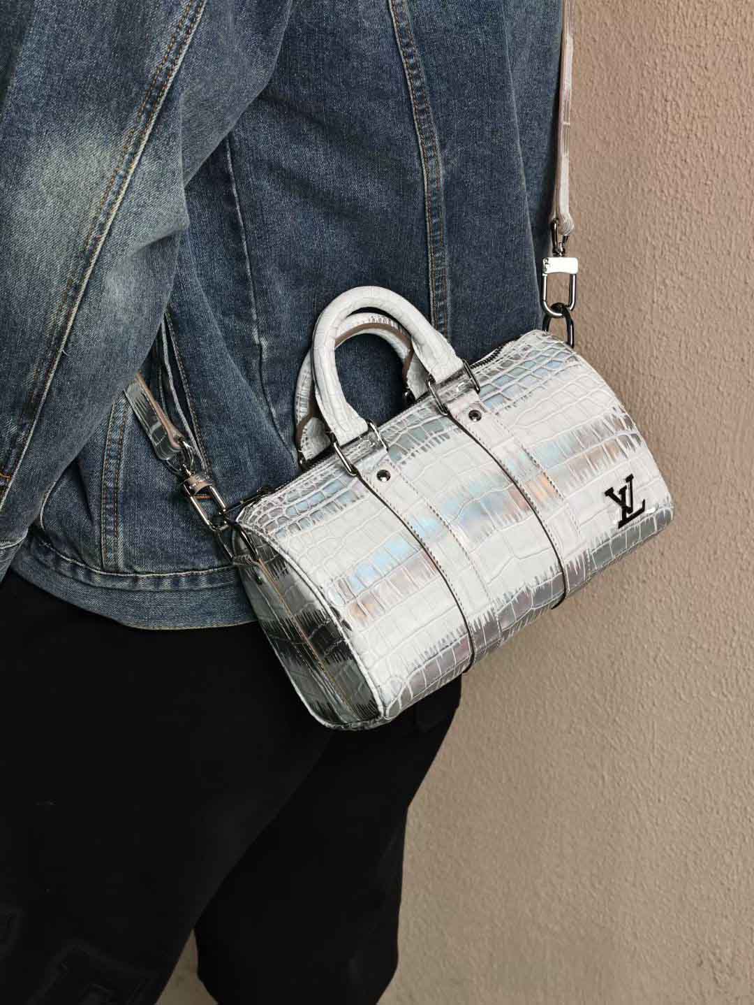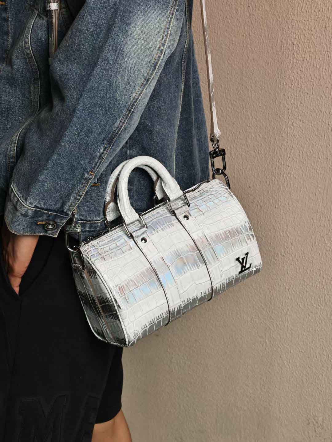 Keepall25单肩包,镭射银特效鳄鱼皮手提包,银扣客订出货。