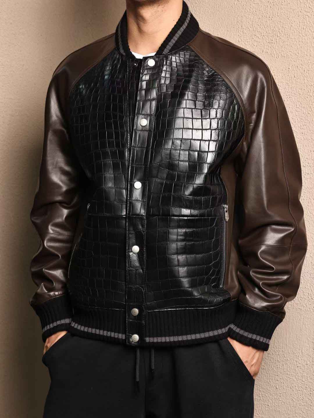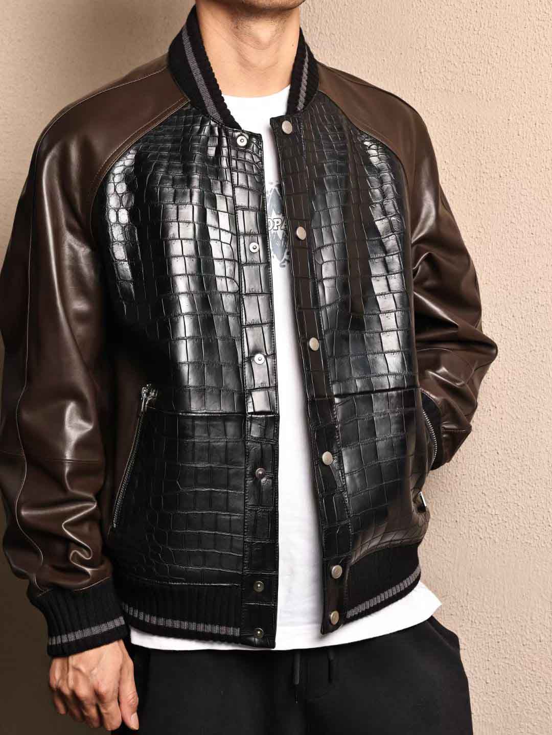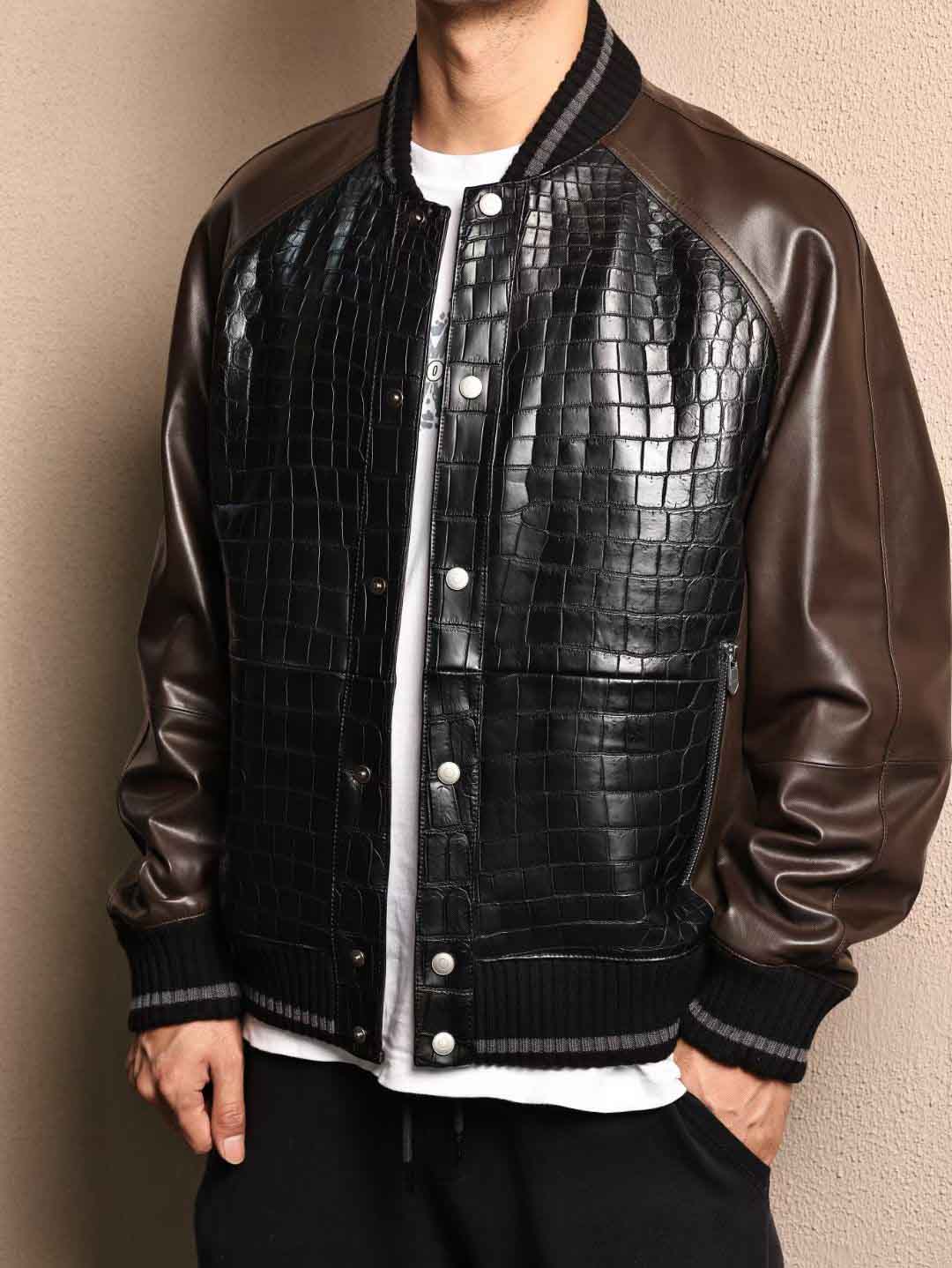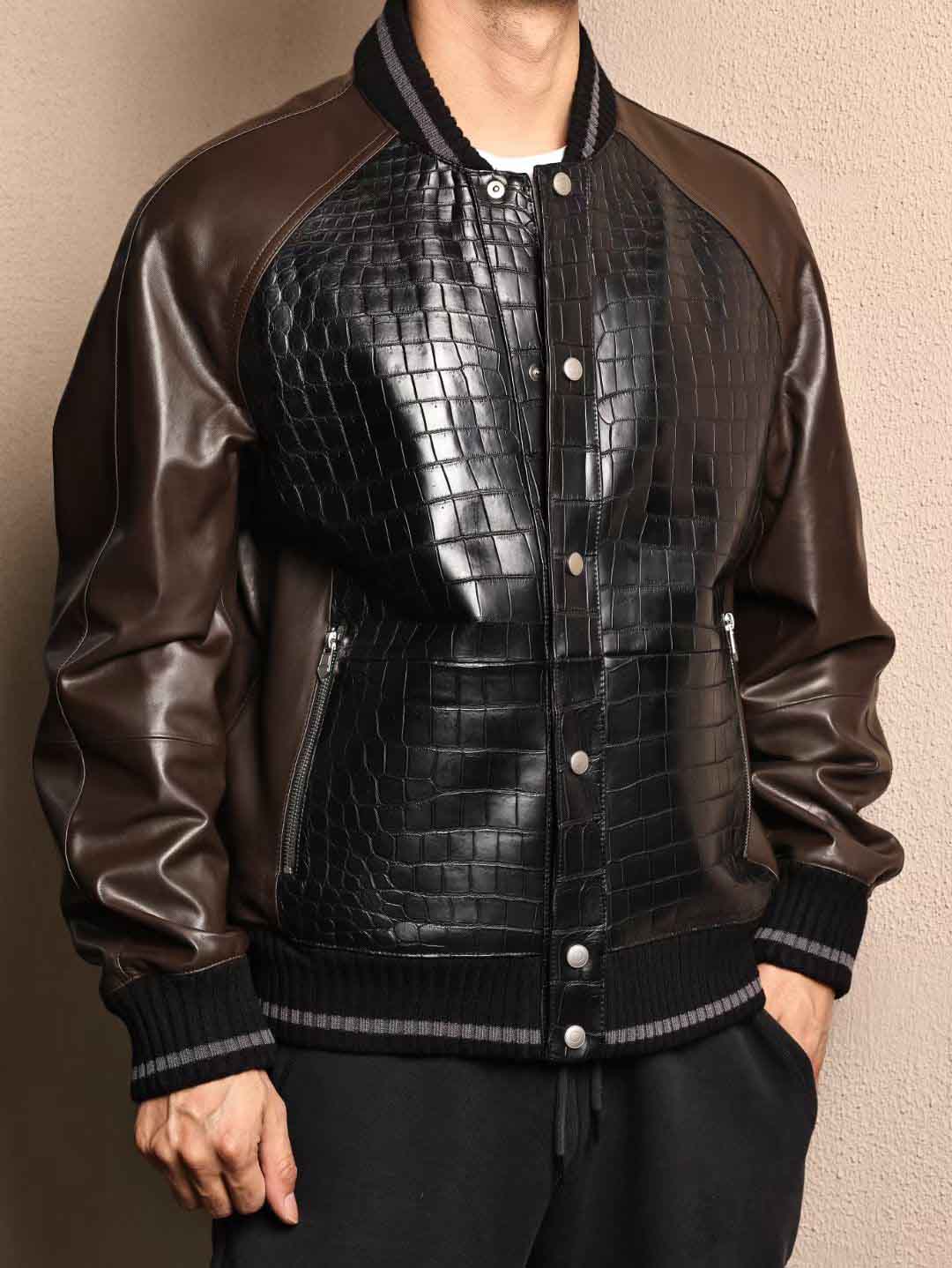 拼鳄鱼皮棒球夹克,黑色哑光尼罗鳄拼巧克力色绵羊皮,50码实拍现货。可以定做自己喜欢的鳄鱼皮 微信联系 95506803