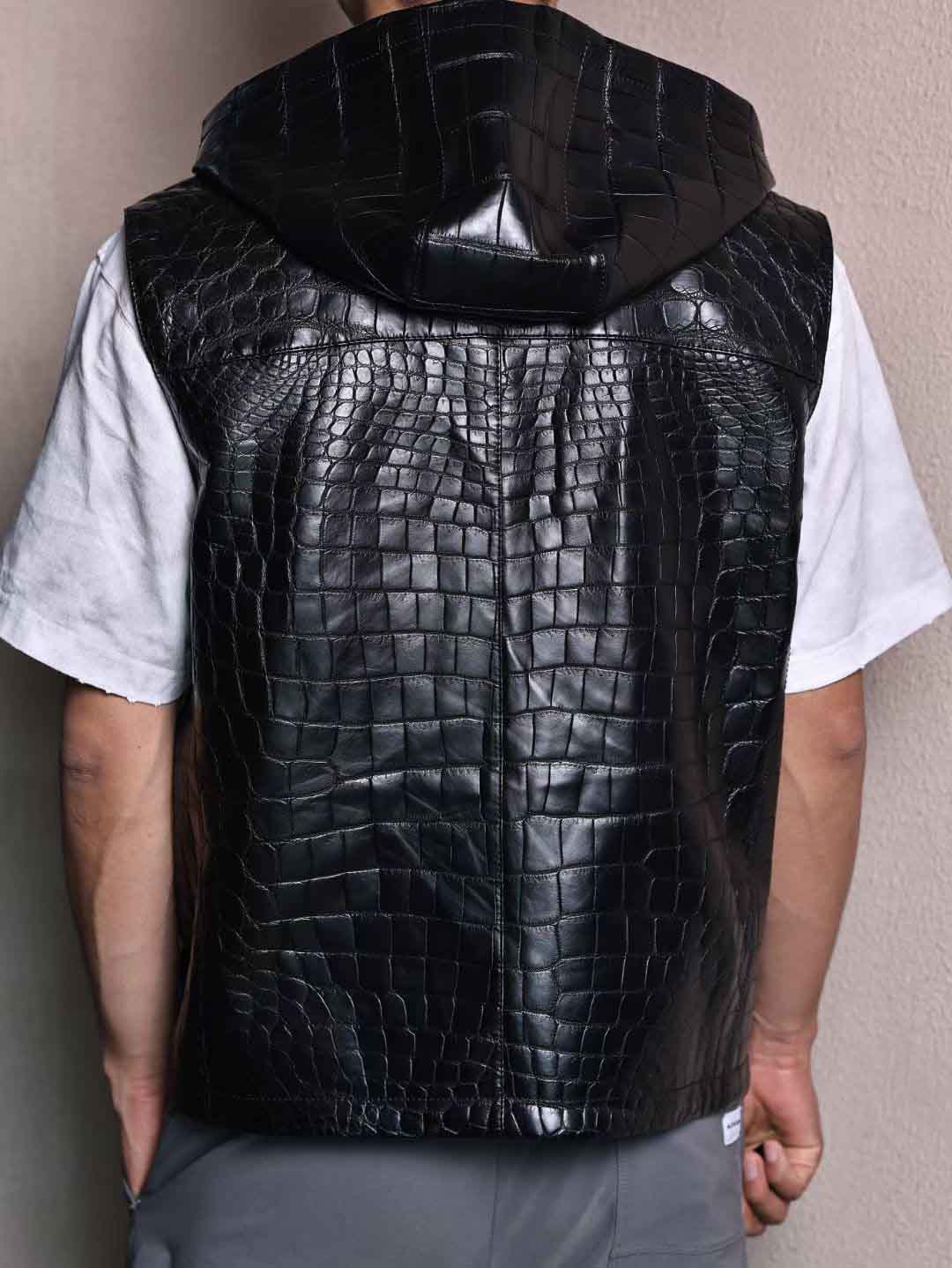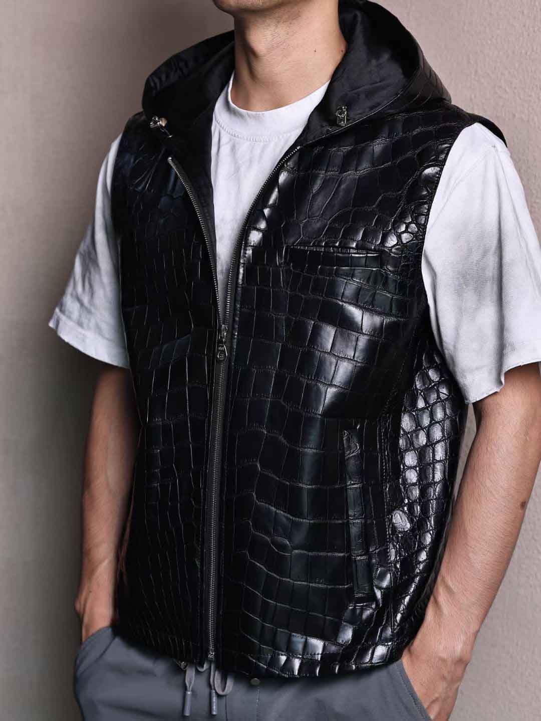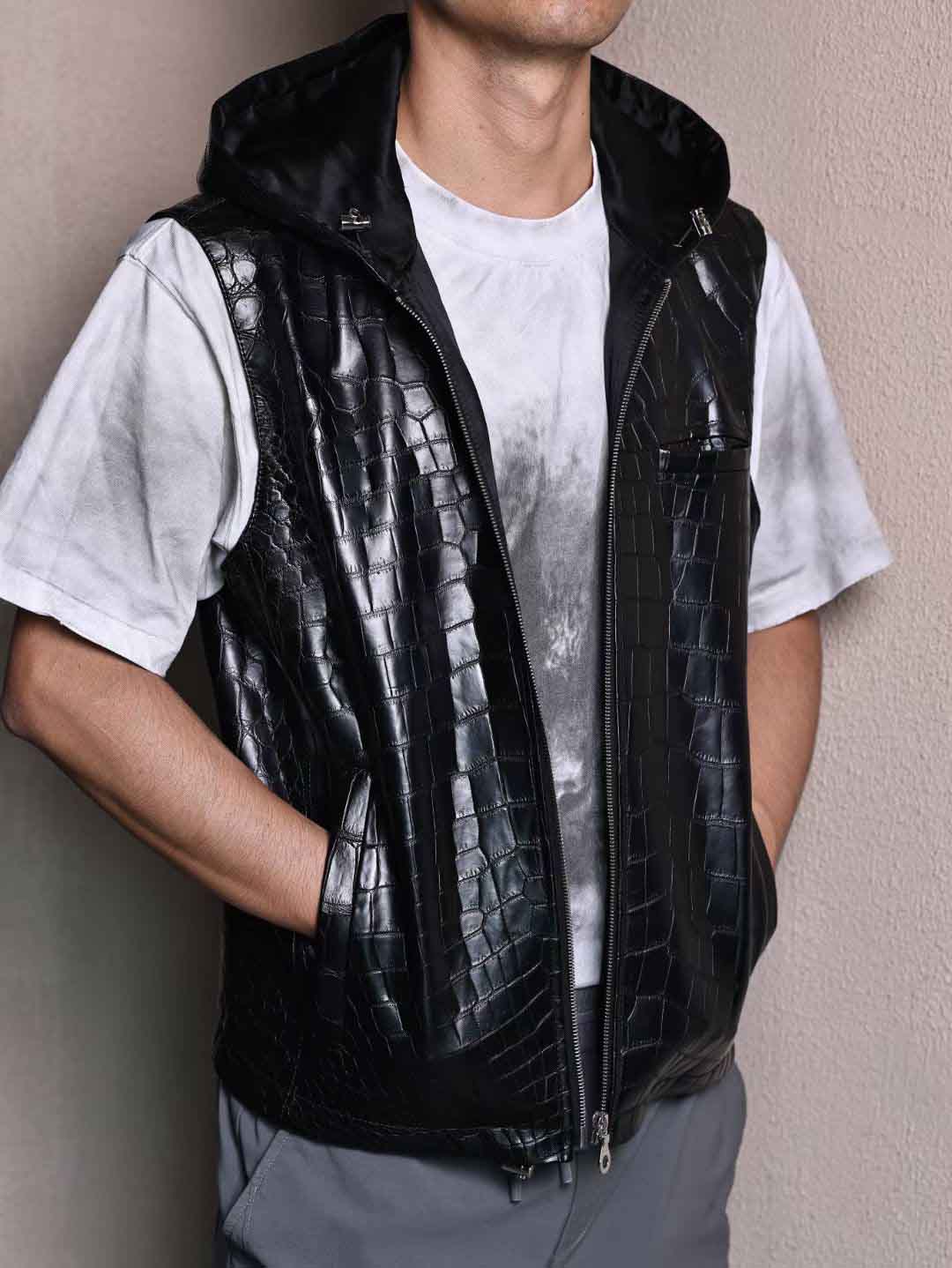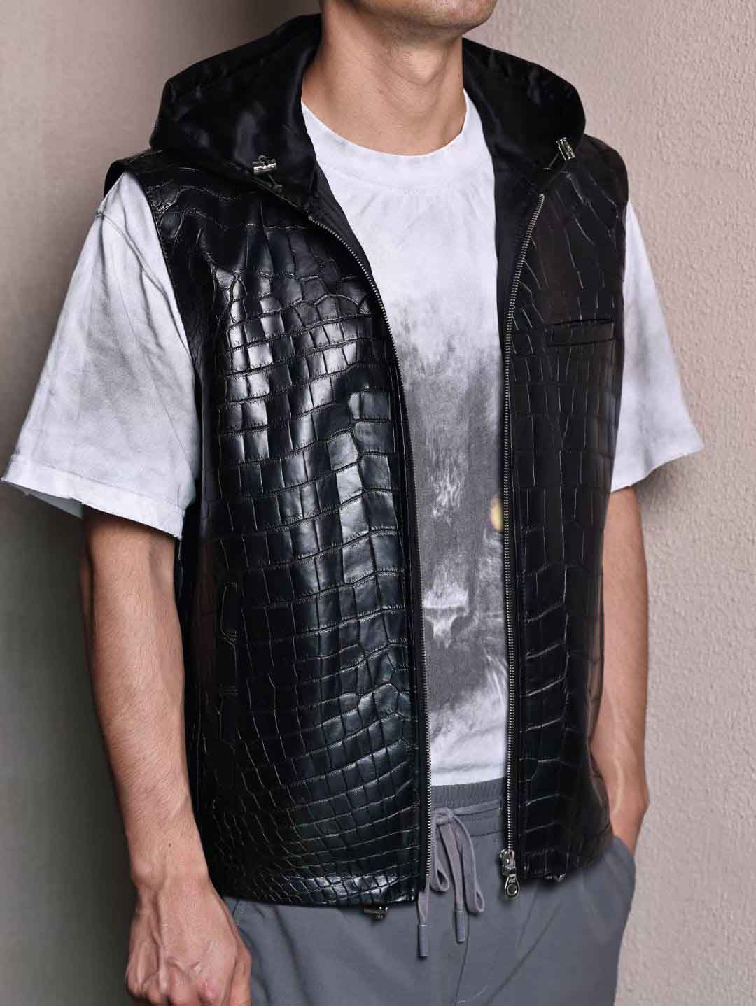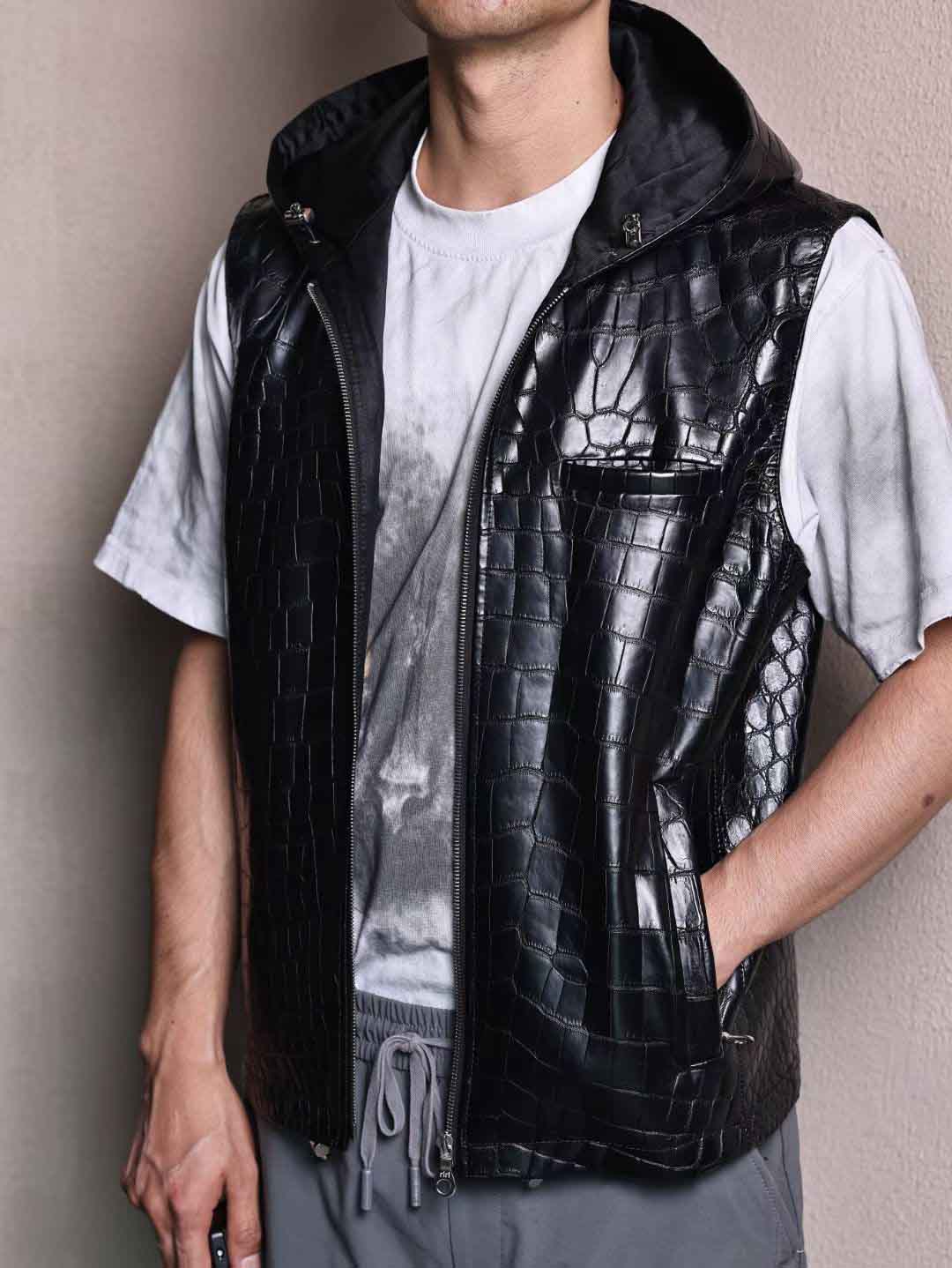 帽衫款马甲,黑色哑光鳄鱼皮,可定制
