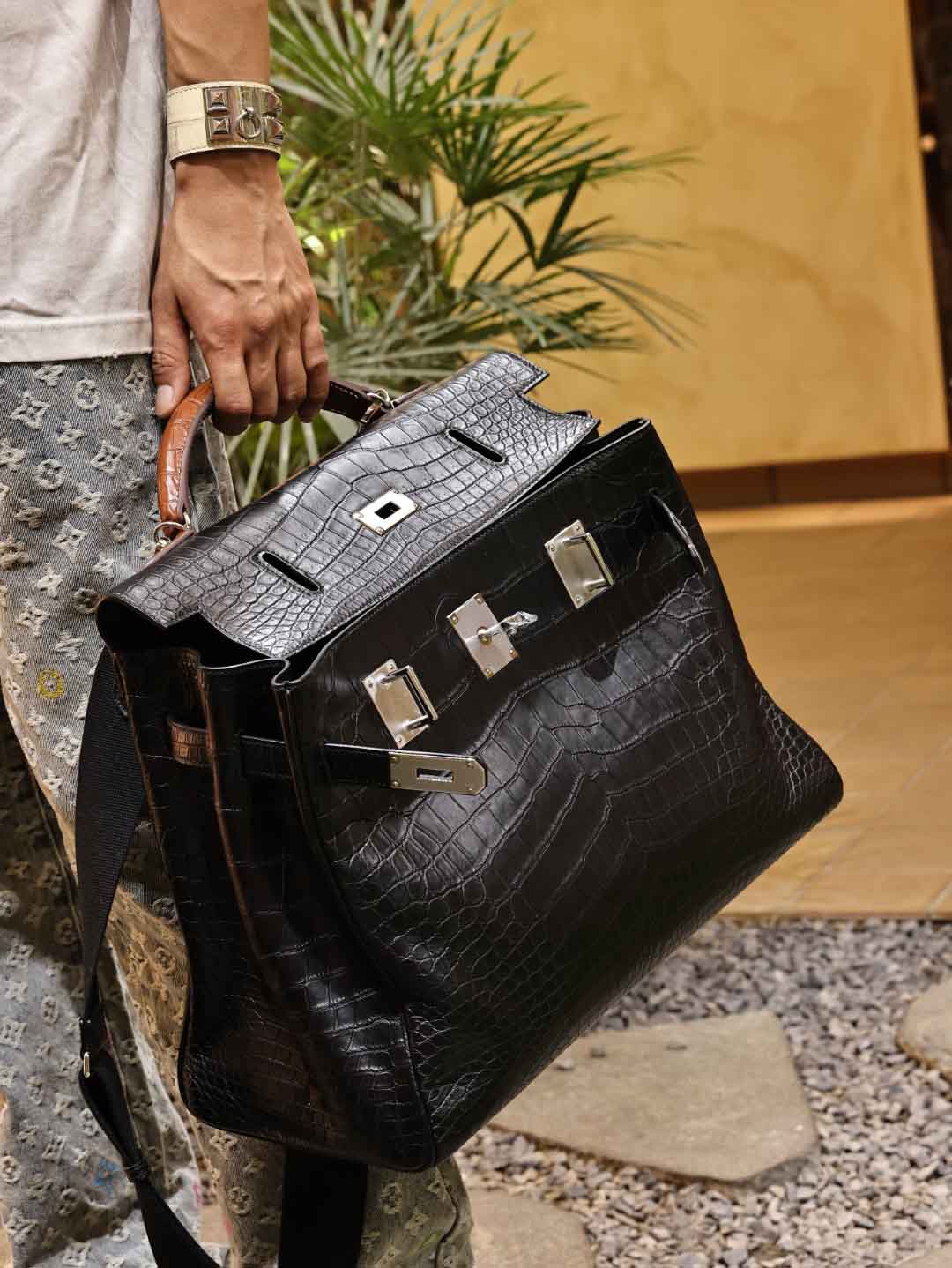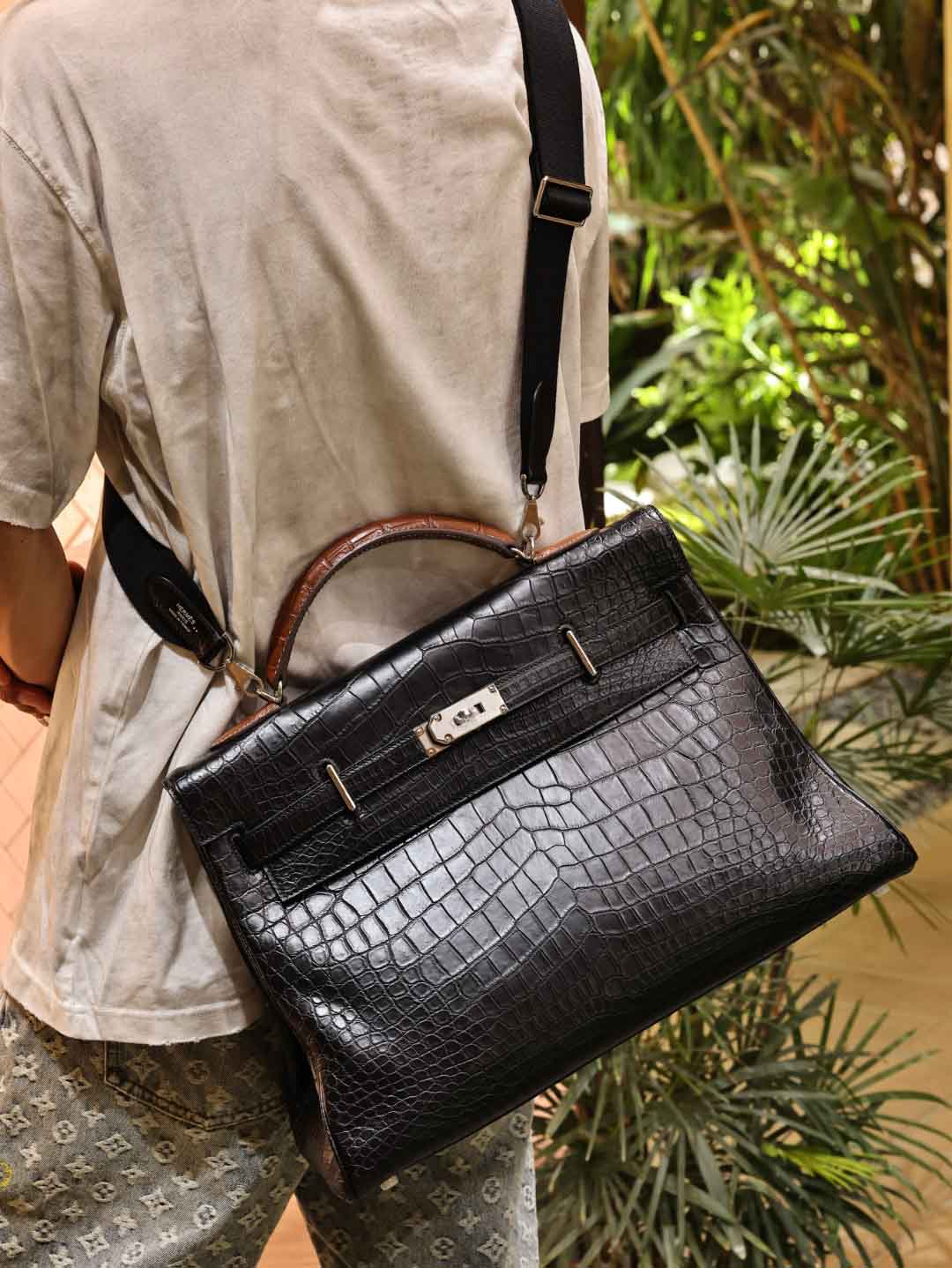 Kelly Maxi42手提包,黑色鳄鱼皮拼马鞍色鳄鱼皮手腕,银扣实拍现货。
