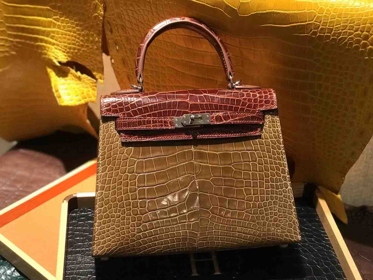 亮面美洲鳄 拼色 Kelly25,凯莉包25寸价格多少钱 凯丽25国内专柜价格 h款2021春夏新色。美洲鳄鱼皮女士手提包定制联系 95506803